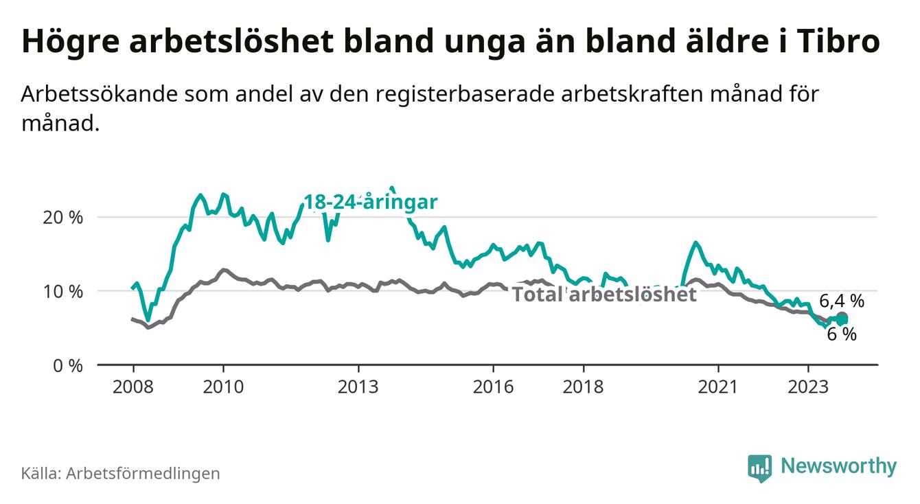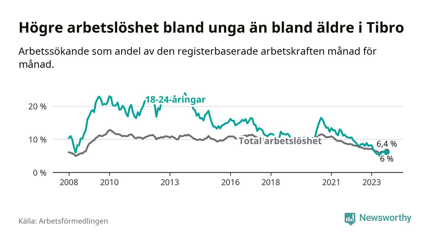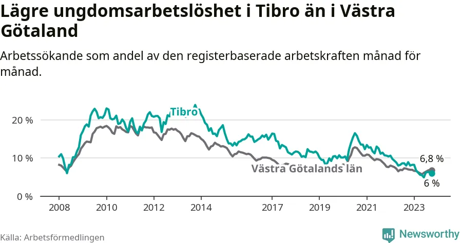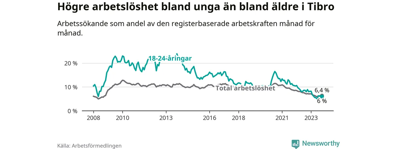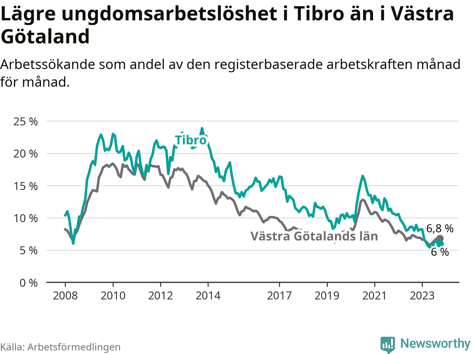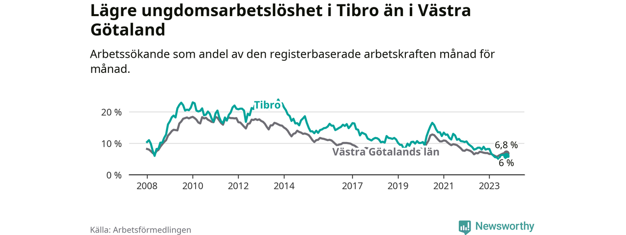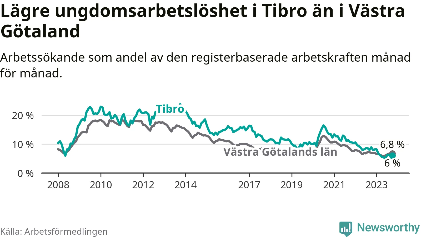 Medan Tibro har högre total arbetslöshet än Västra Götaland, ligger ungdomsarbetslösheten 0,8 procentenheter lägre i Tibro.