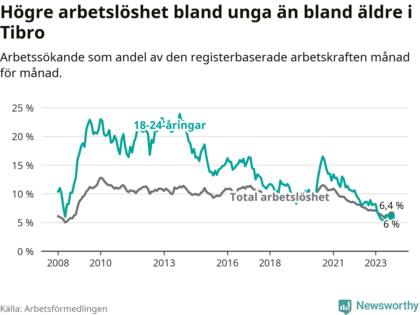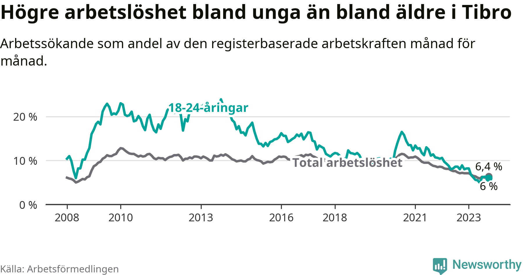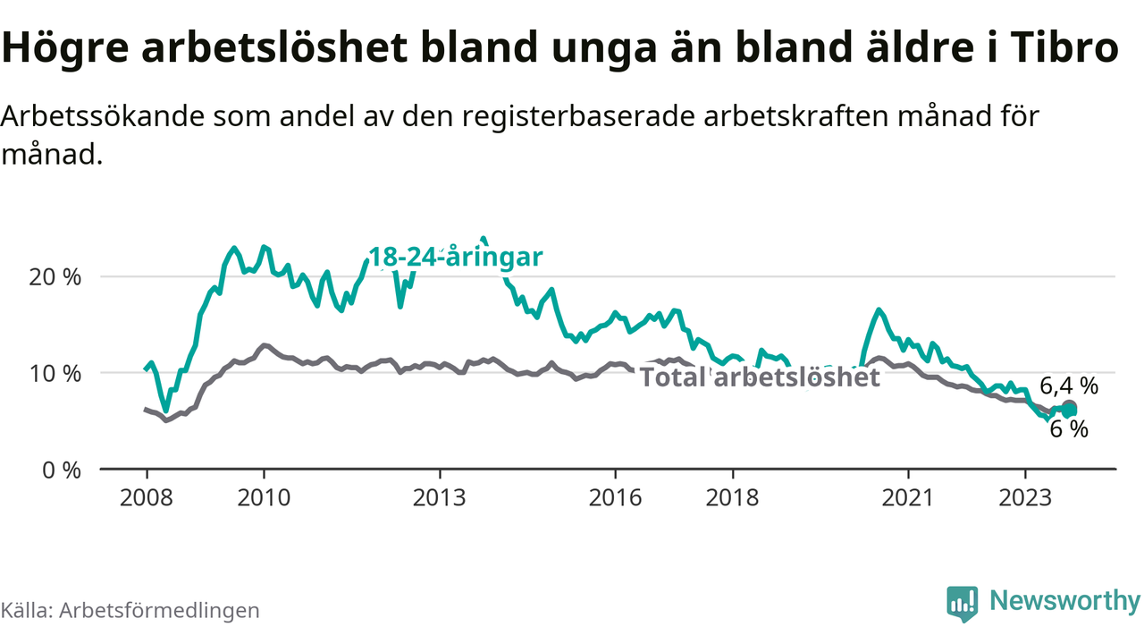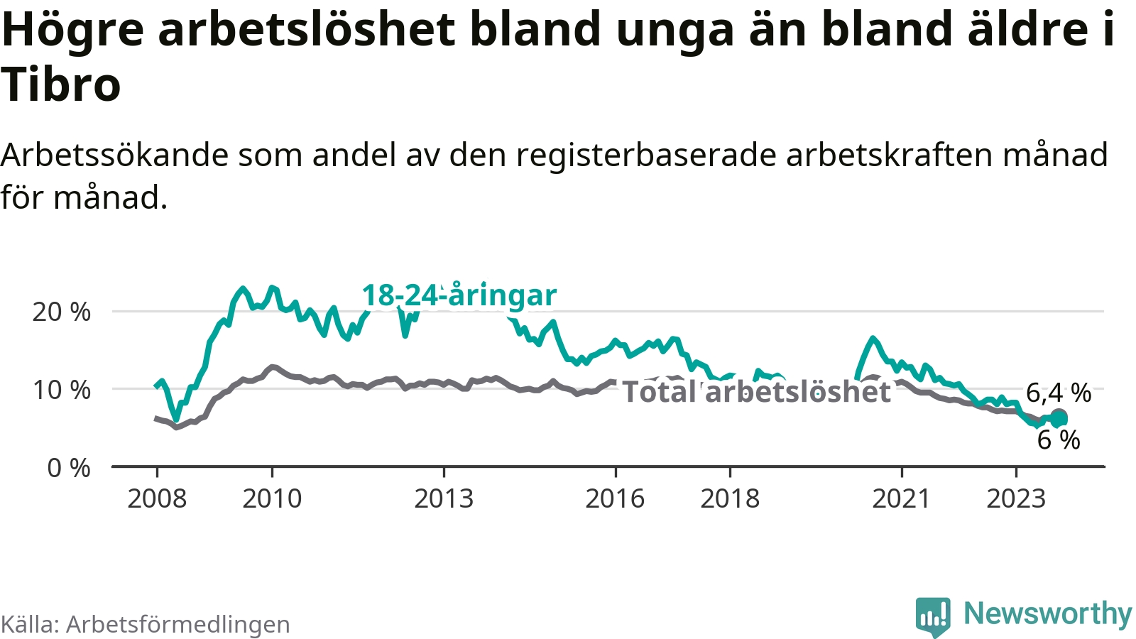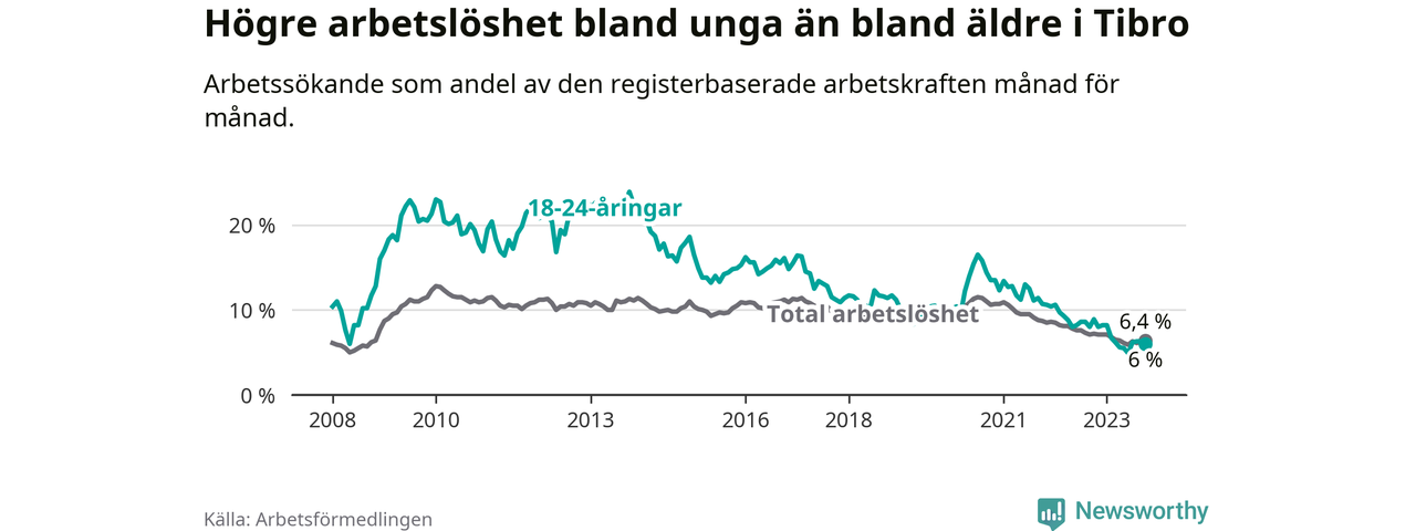 Medan Tibro har högre total arbetslöshet än Västra Götaland, ligger ungdomsarbetslösheten 0,8 procentenheter lägre i Tibro.