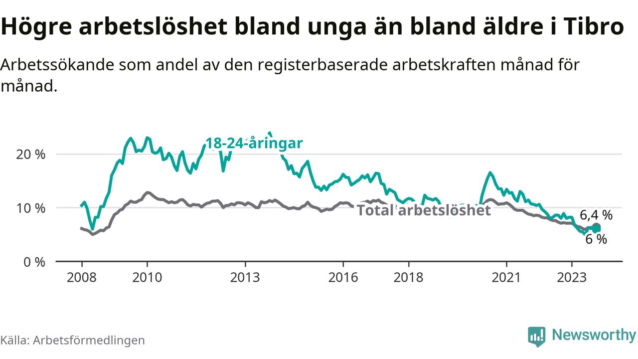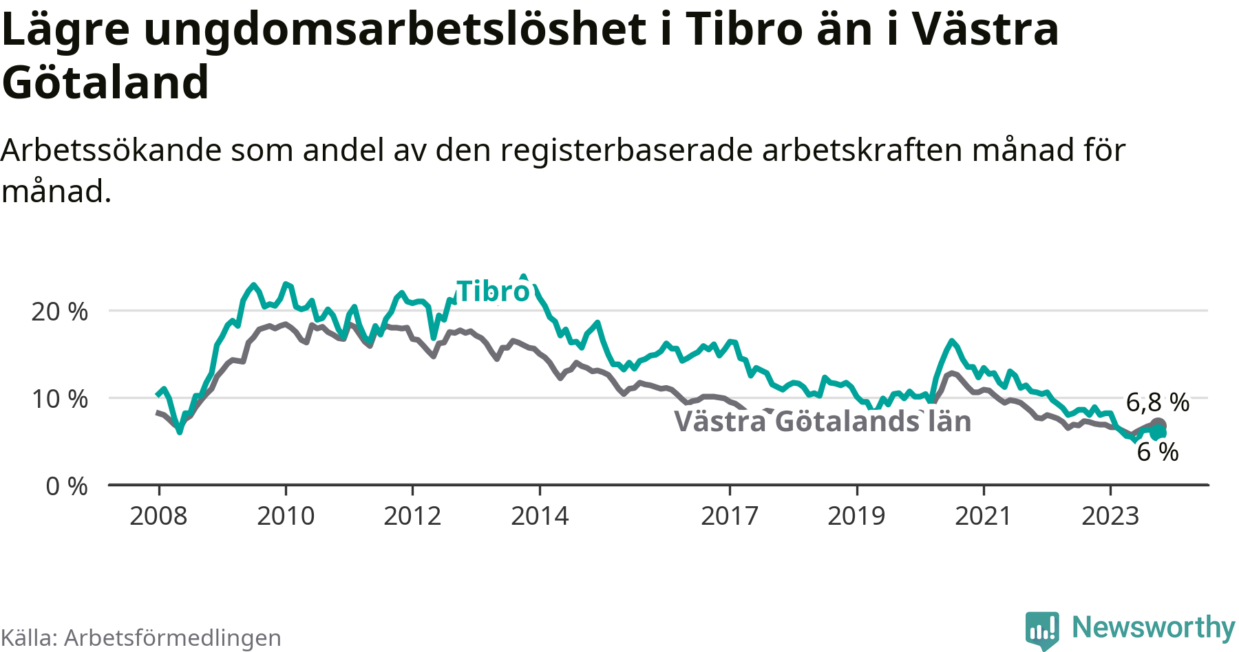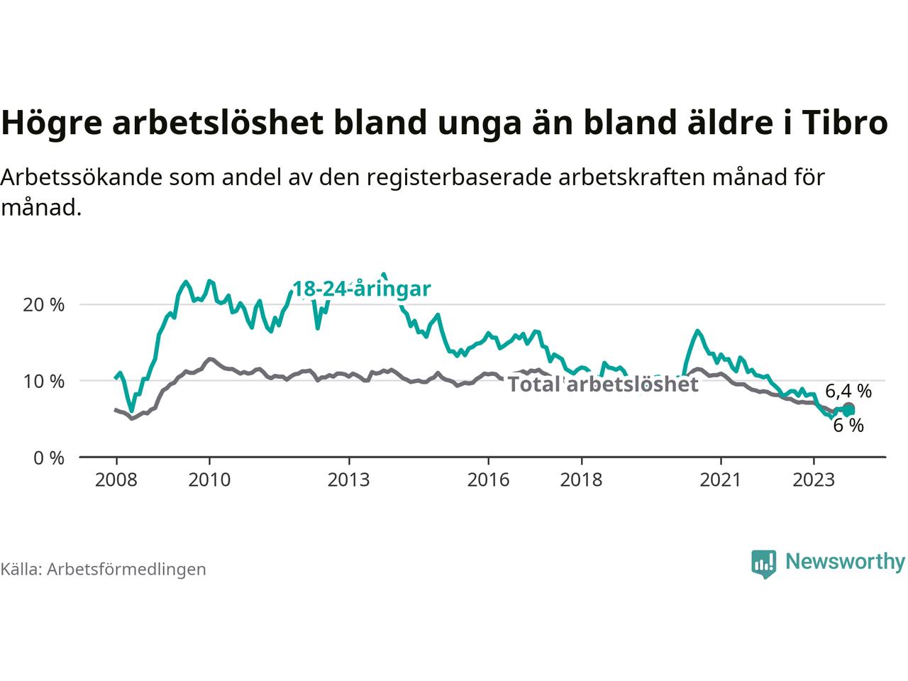 Graf: Arbetslöshet bland unga i Tibro kommun och Västra Götalands län