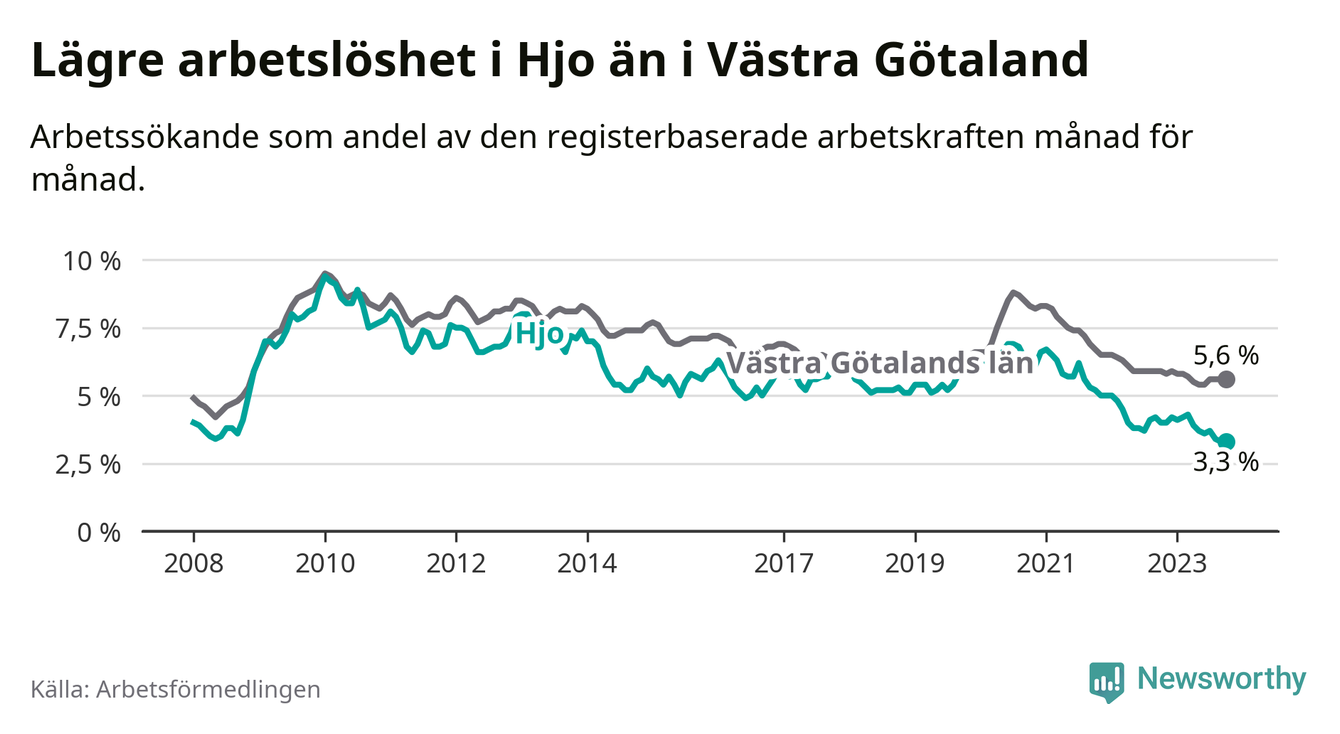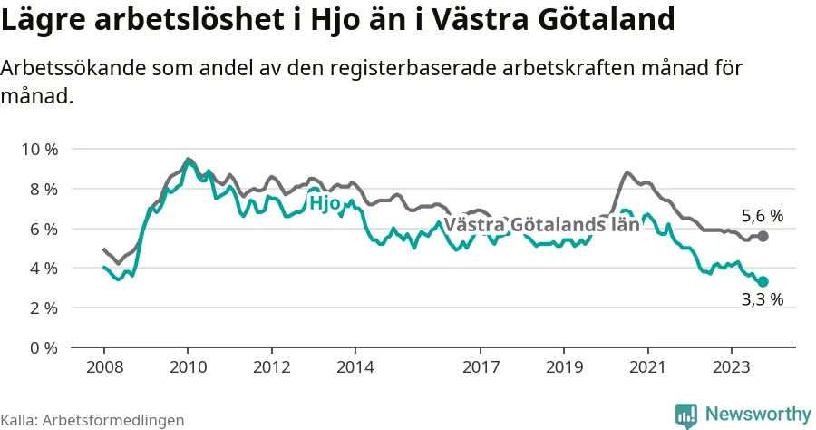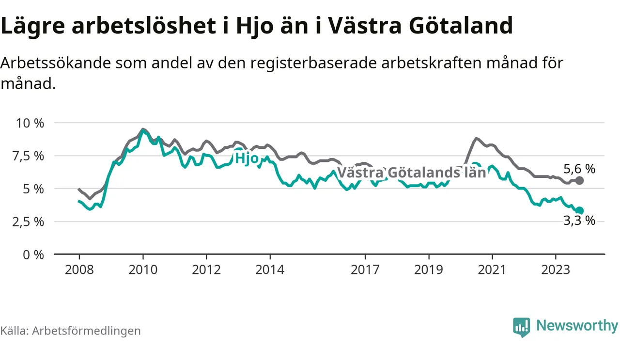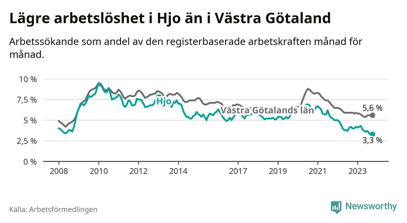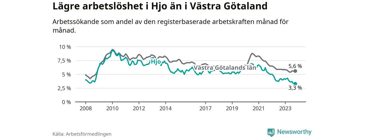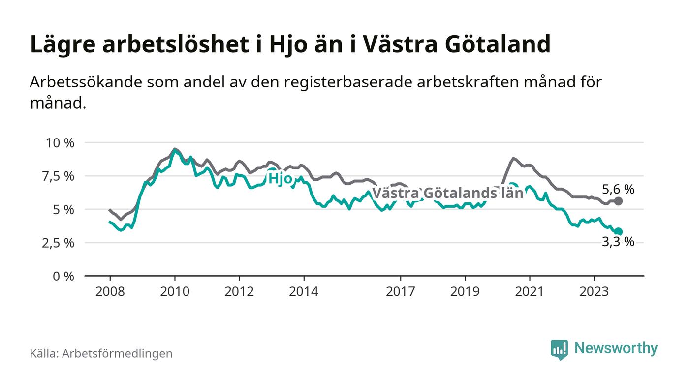 Hjo hade redan tidigare lägre arbetslöshet än snittet i hela Västra Götalands län och nu växer klyftan (3,3 procent i kommunen, jämfört med 5,6 procent i hela länet). Öckerö har den lägsta arbetslösheten i länet (2,4 procent), medan Trollhättan har den högsta (8,4 procent). För att Hjo skulle komma ner i samma arbetslöshetsnivå som Öckerö skulle 37 personer behöva sysselsättas.