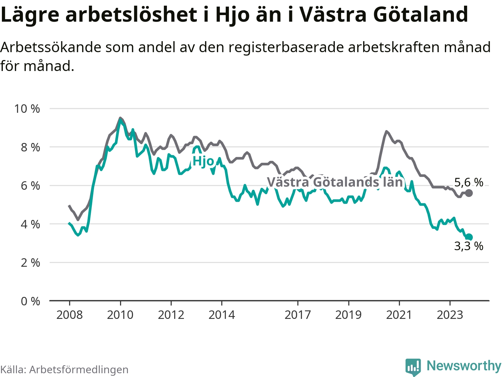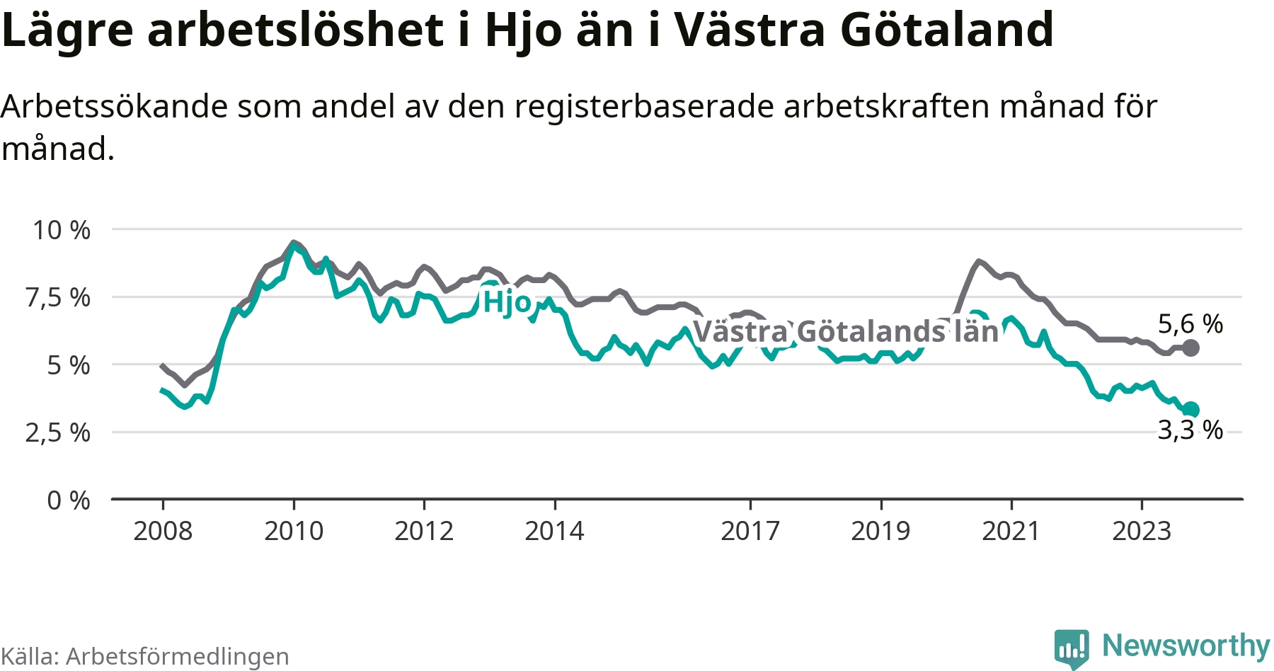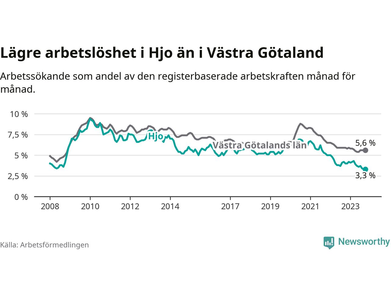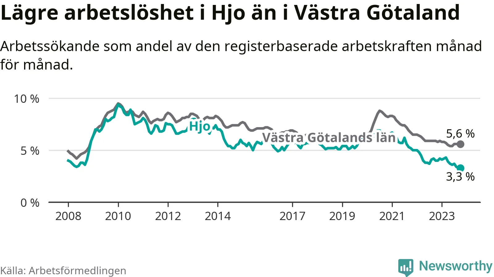 Hjo hade redan tidigare lägre arbetslöshet än snittet i hela Västra Götalands län och nu växer klyftan (3,3 procent i kommunen, jämfört med 5,6 procent i hela länet). Öckerö har den lägsta arbetslösheten i länet (2,4 procent), medan Trollhättan har den högsta (8,4 procent). För att Hjo skulle komma ner i samma arbetslöshetsnivå som Öckerö skulle 37 personer behöva sysselsättas.