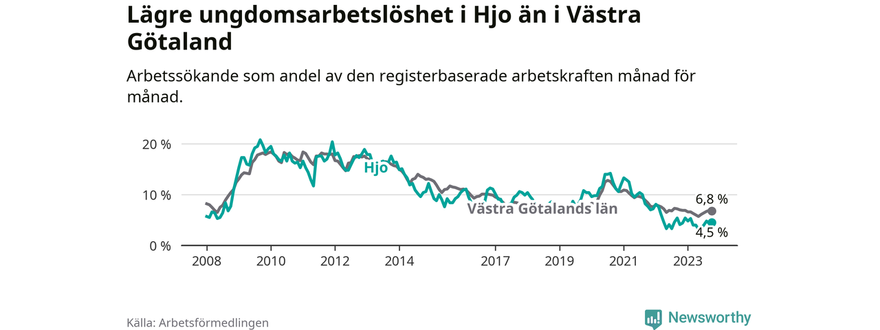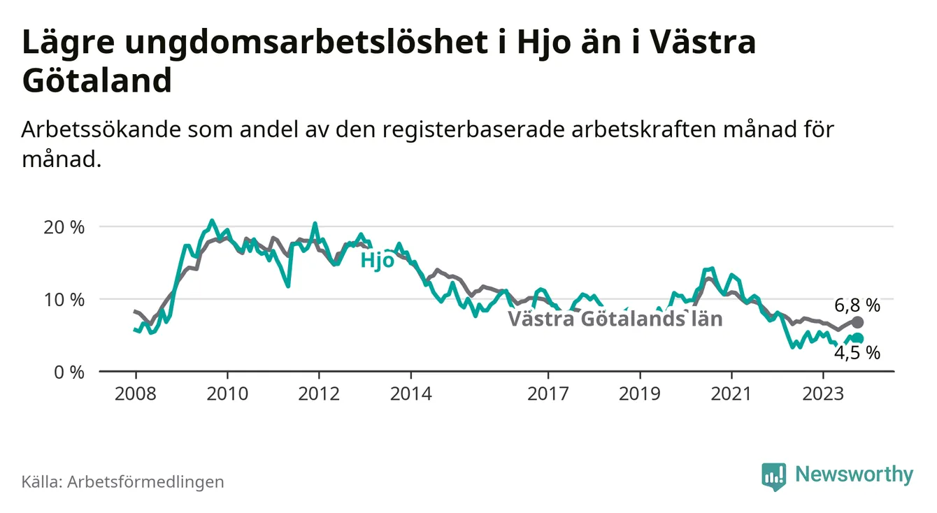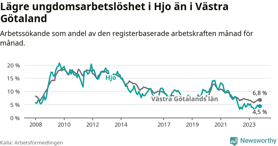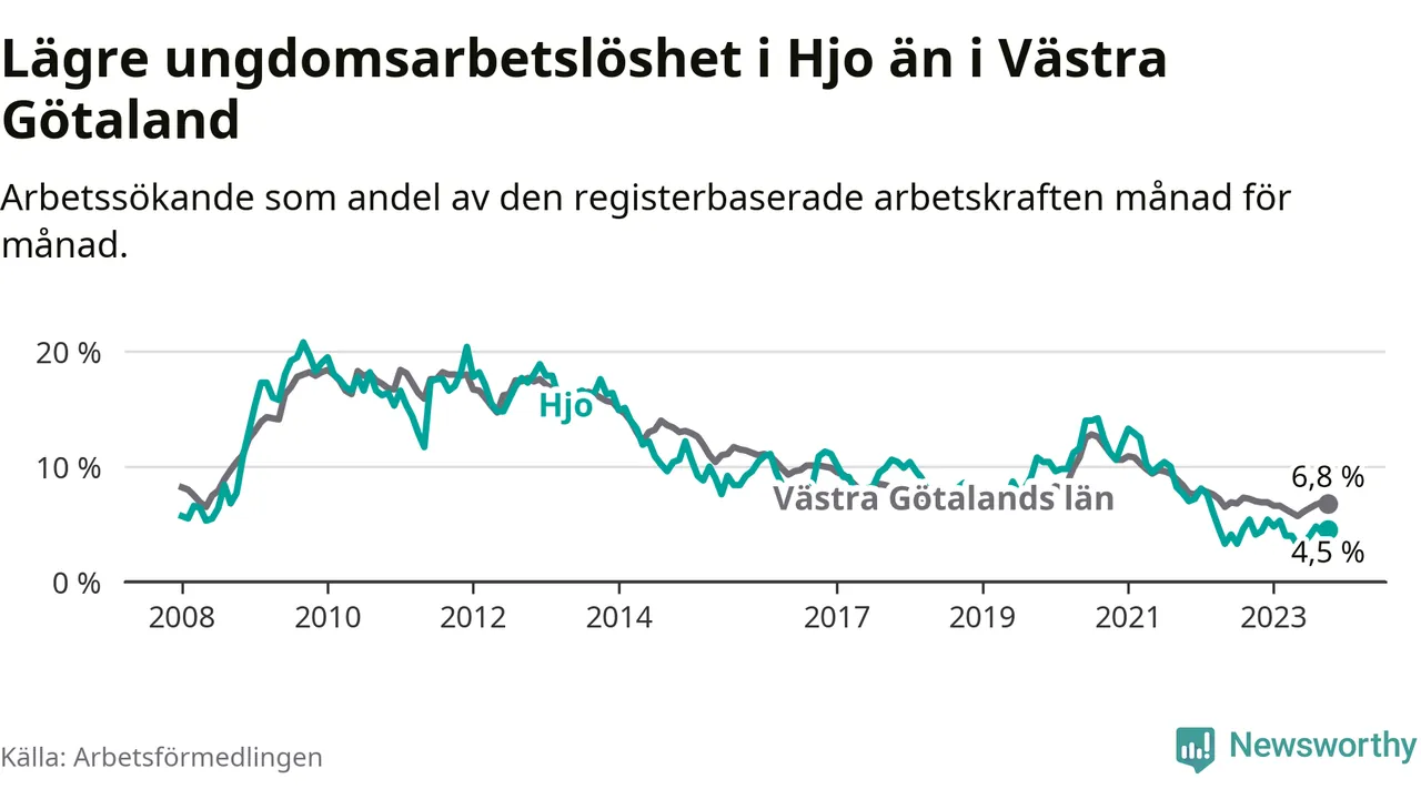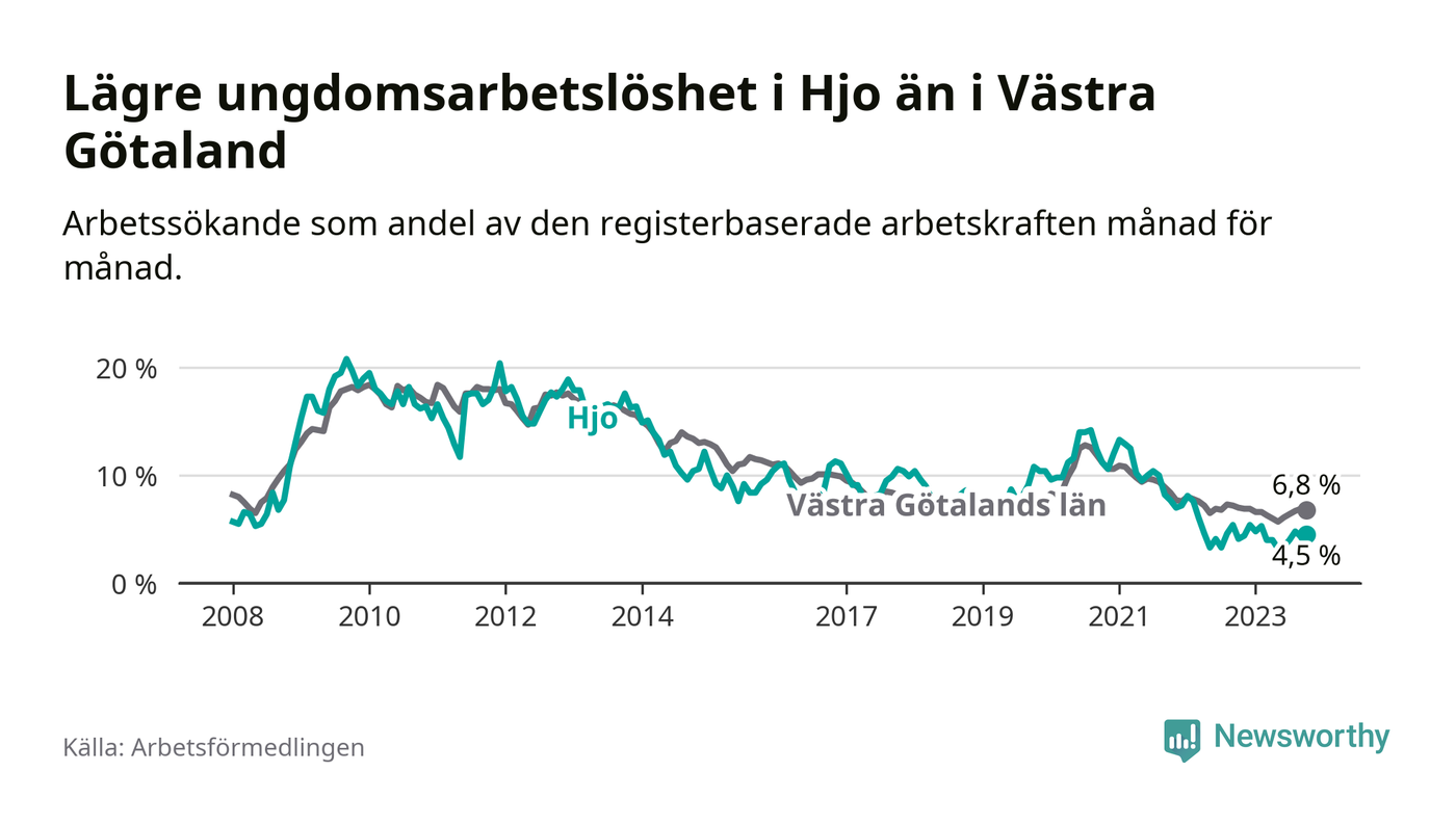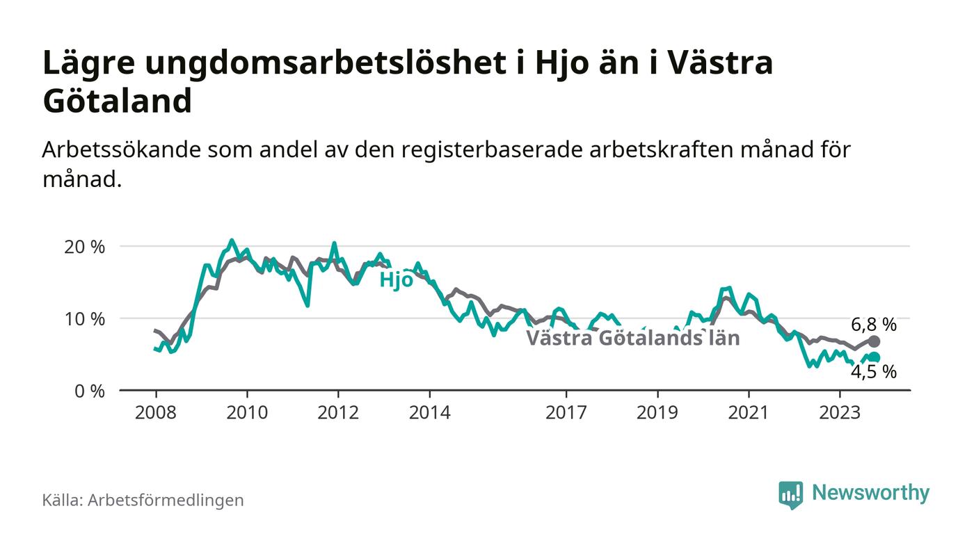 Precis som den totala arbetslösheten ligger ungdomsarbetslösheten i Hjo lägre än i Västra Götaland som helhet. Skillnaden mellan kommunen och länet är 2,3 procentenheter.