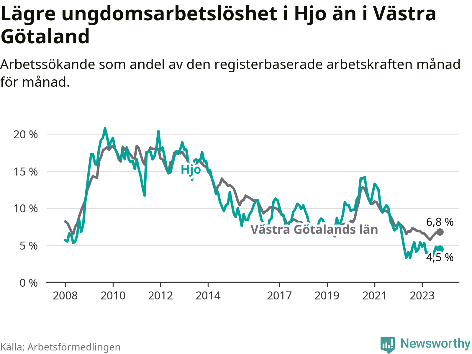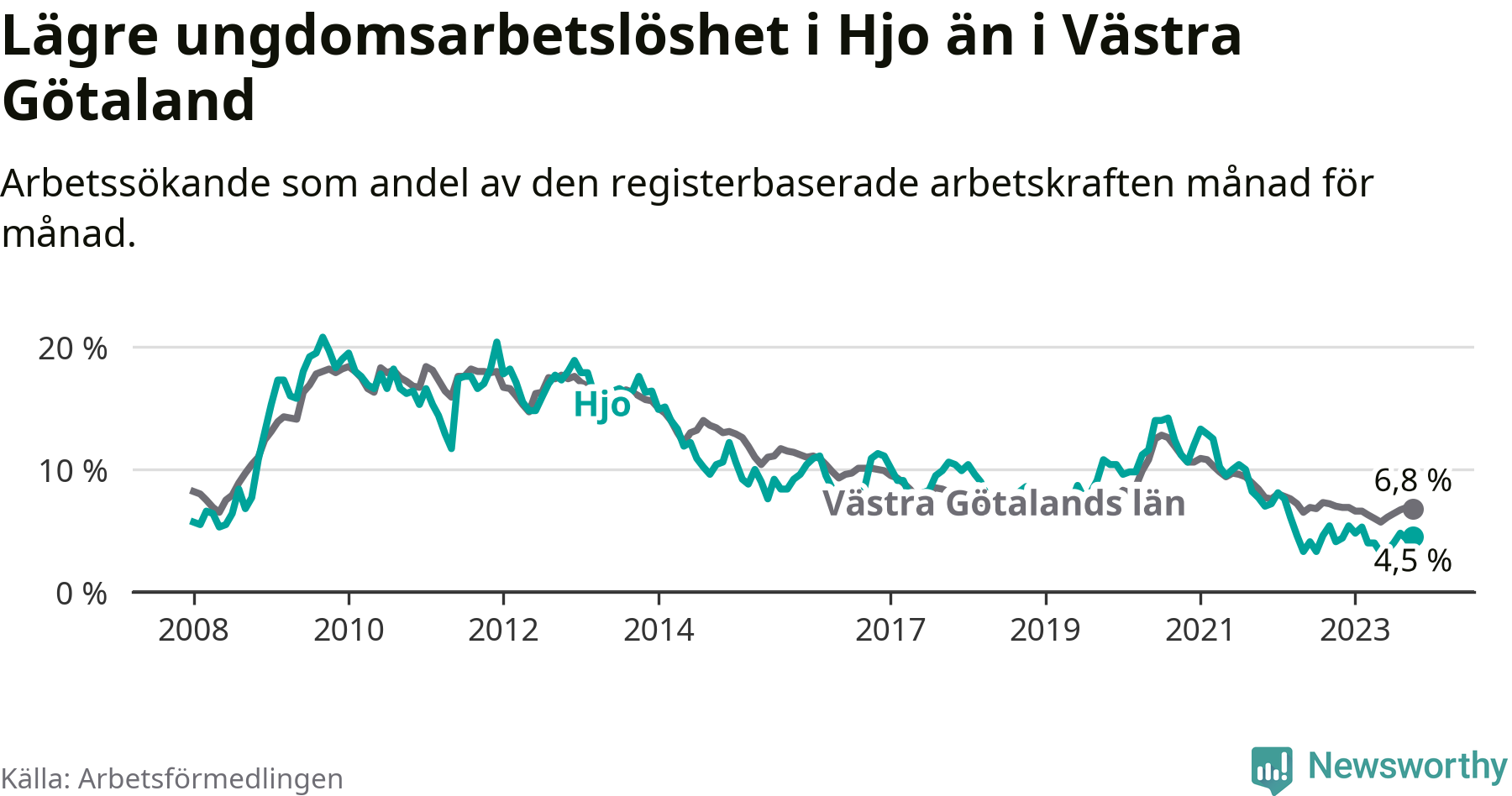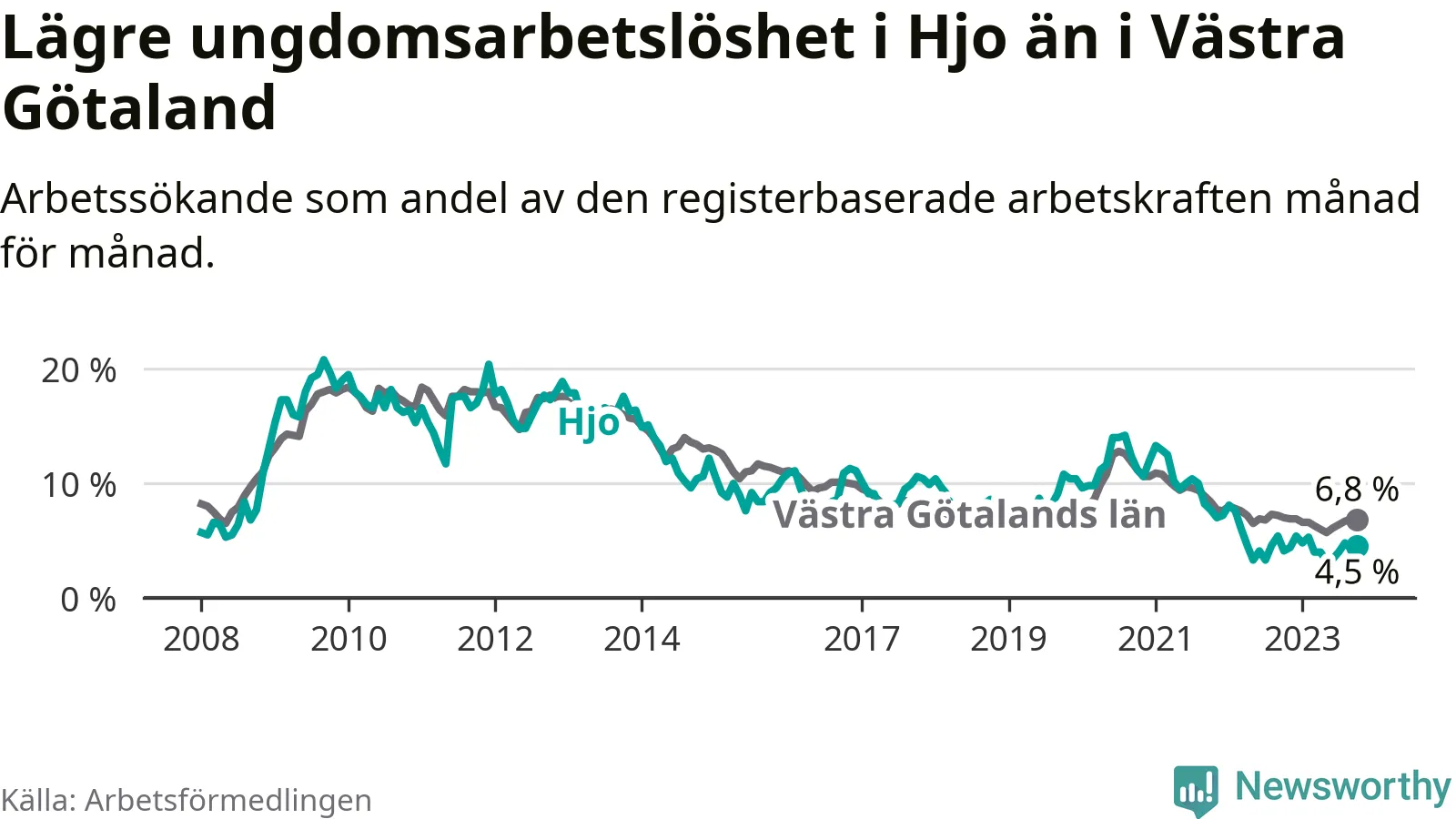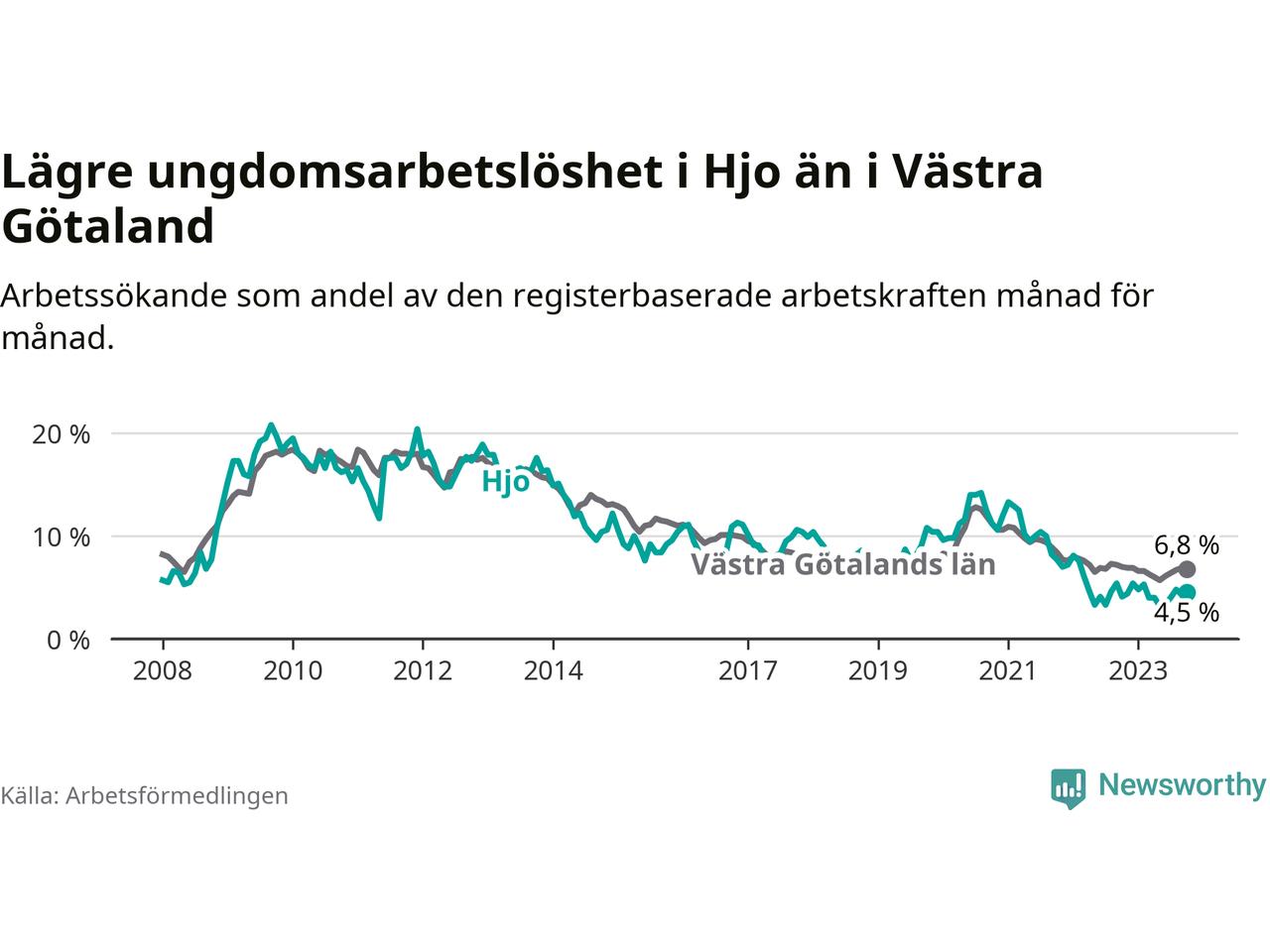 Precis som den totala arbetslösheten ligger ungdomsarbetslösheten i Hjo lägre än i Västra Götaland som helhet. Skillnaden mellan kommunen och länet är 2,3 procentenheter.