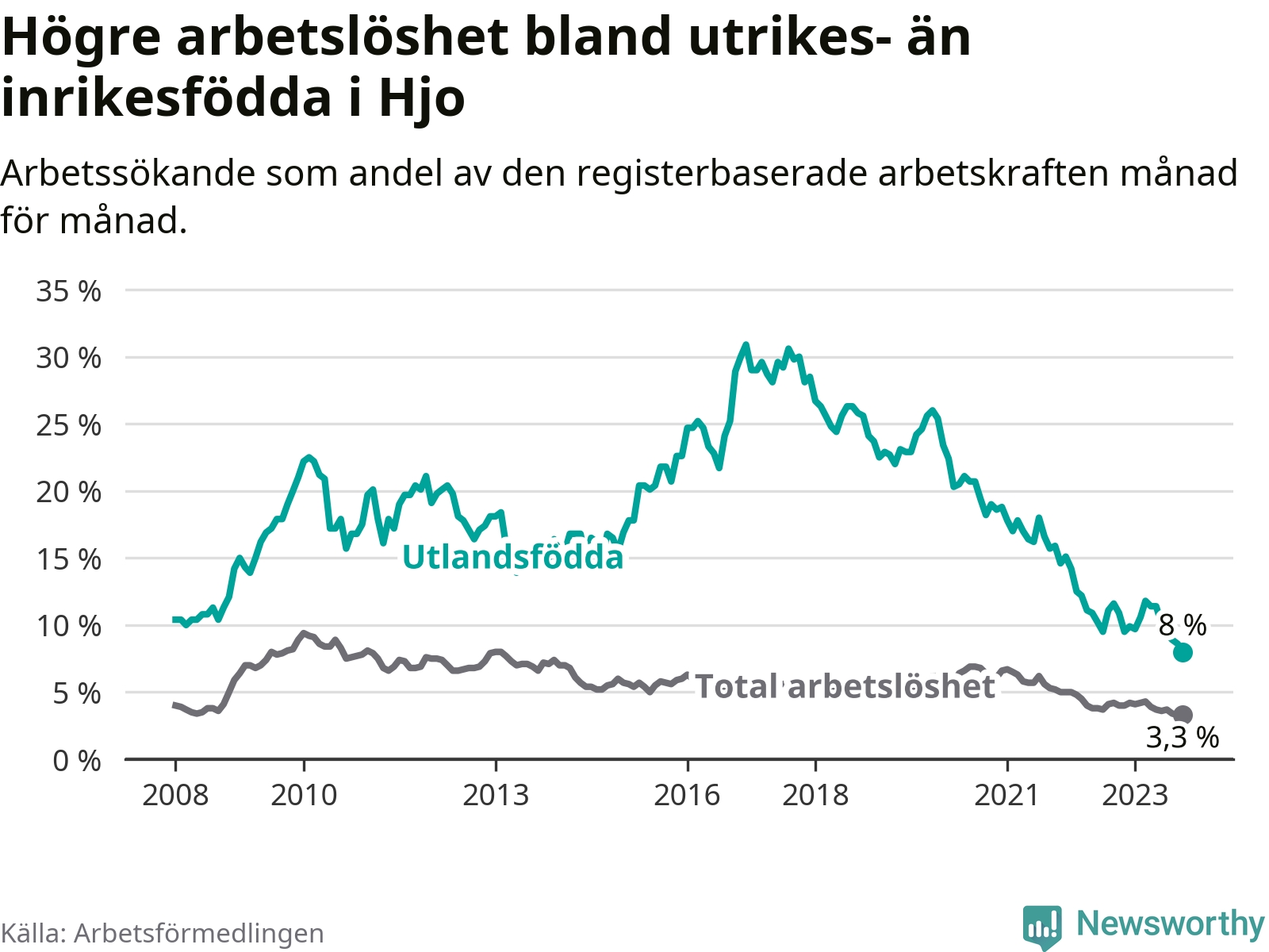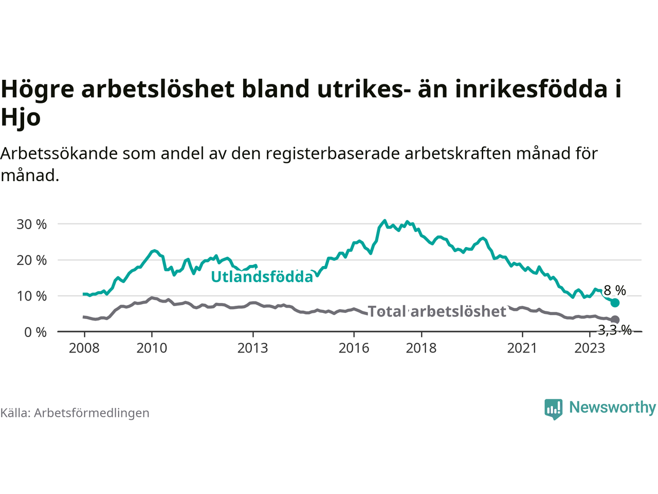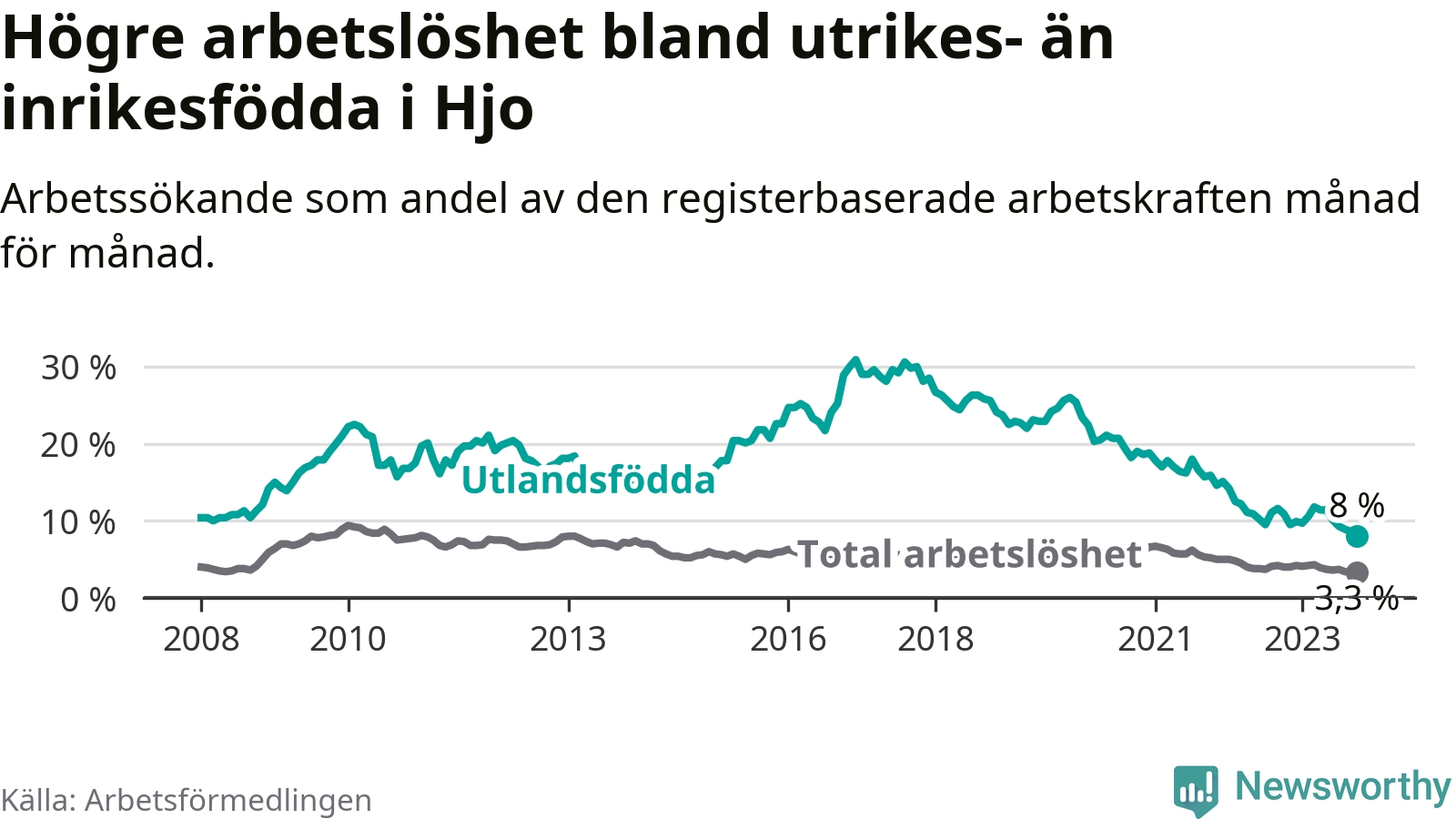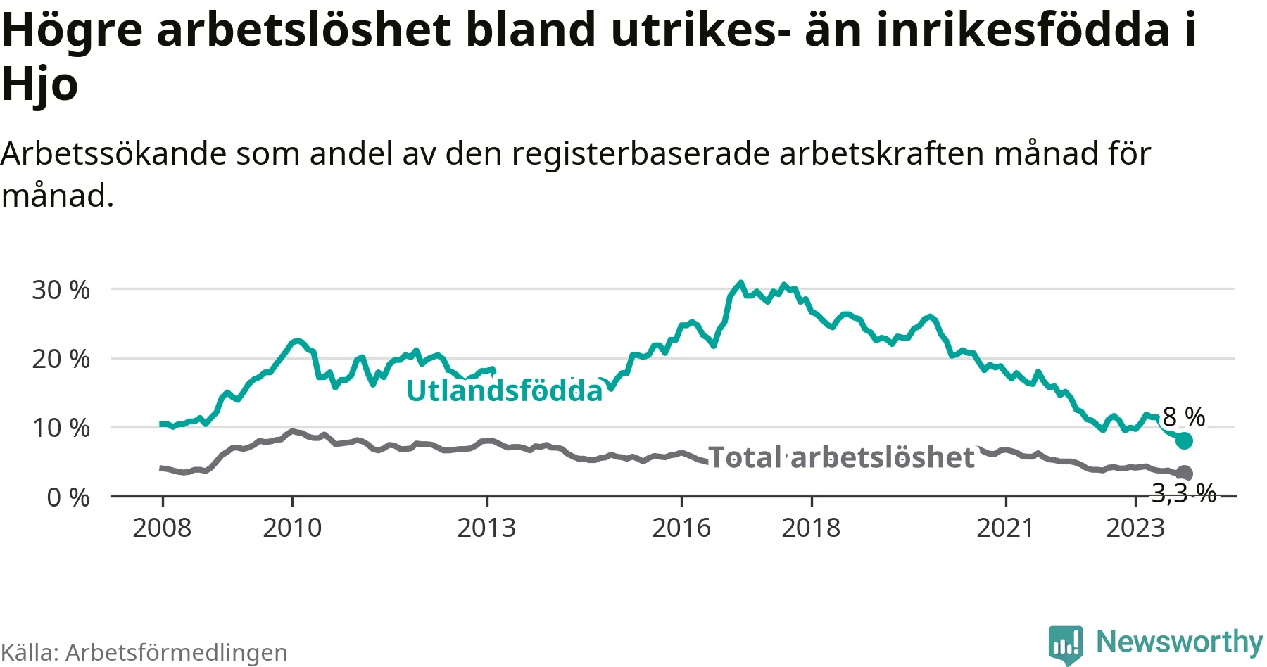 Läs mer om arbetslösheten bland utlandsfödda längre ner i den här texten.