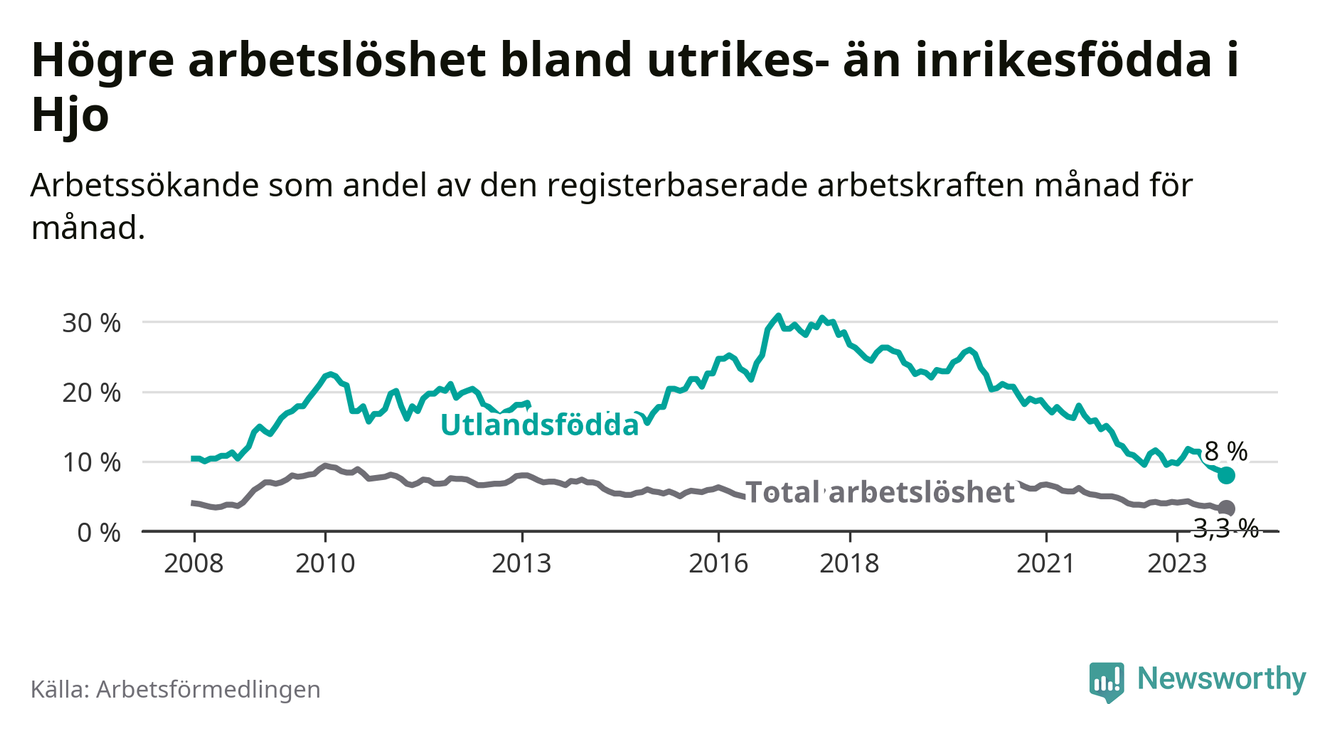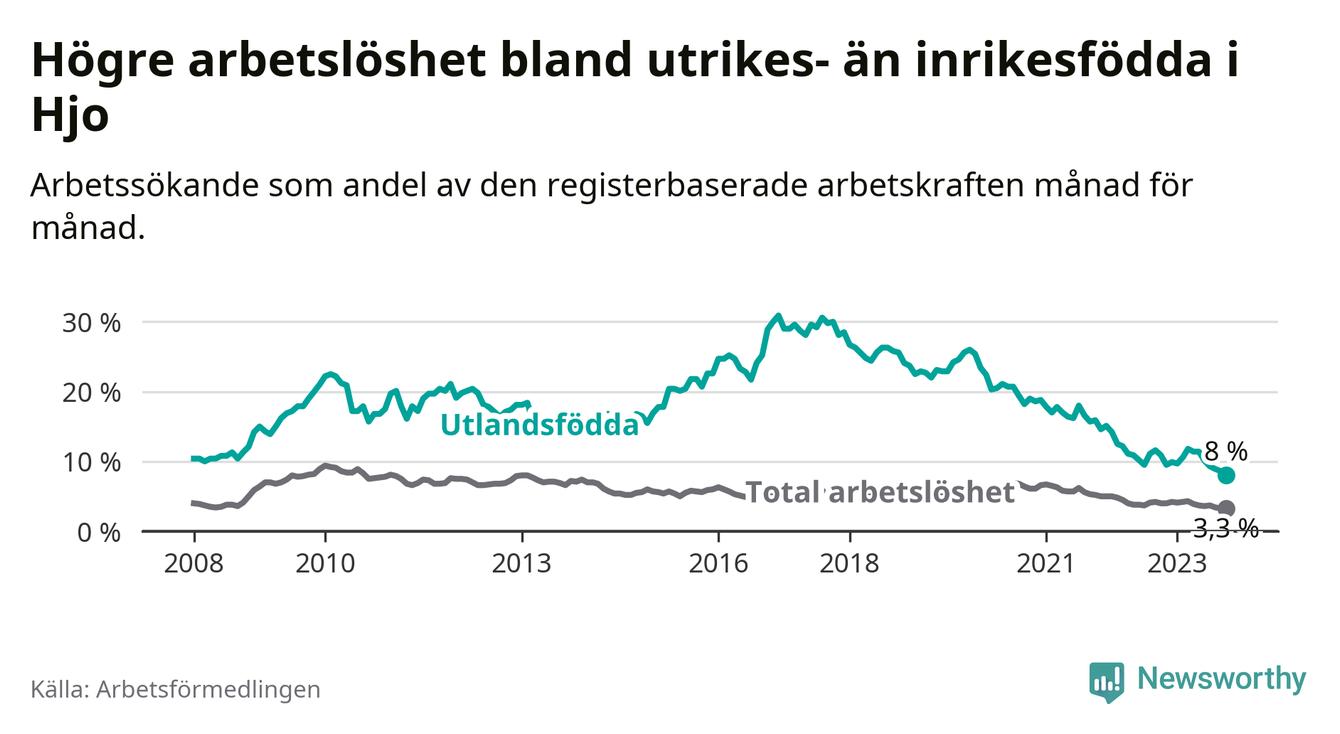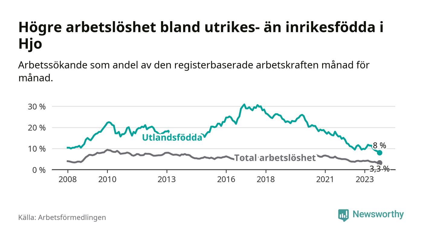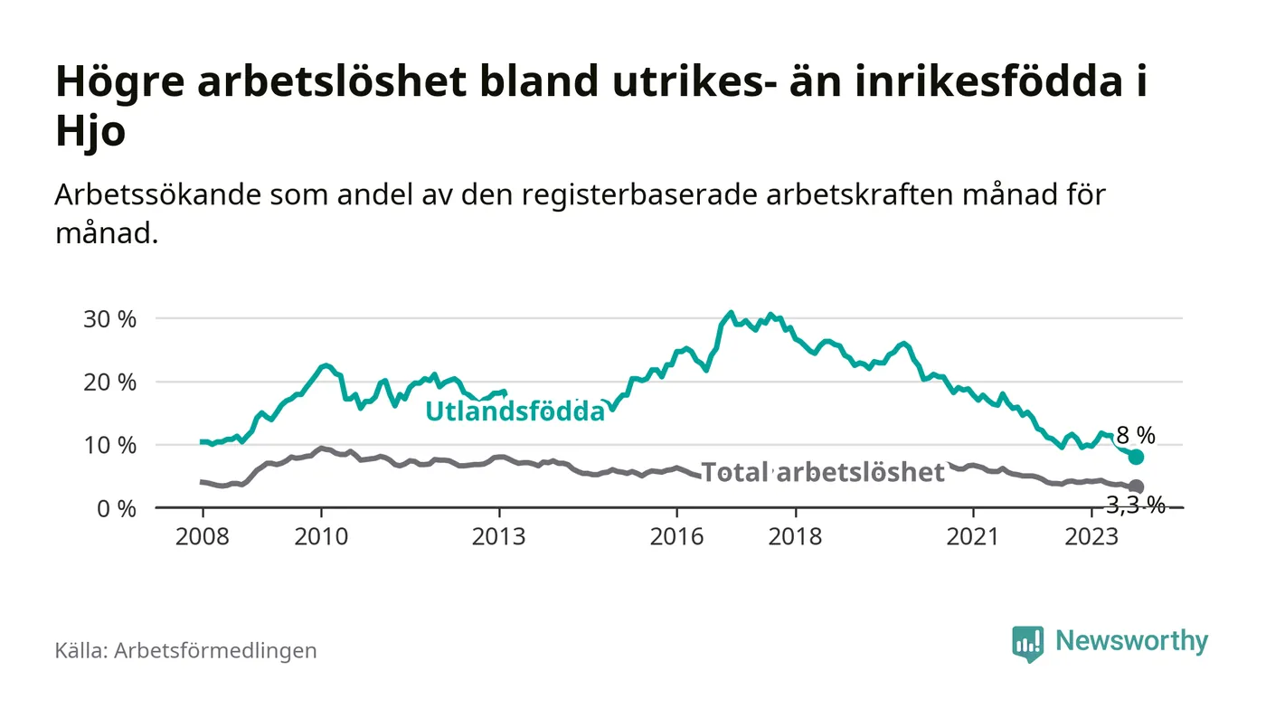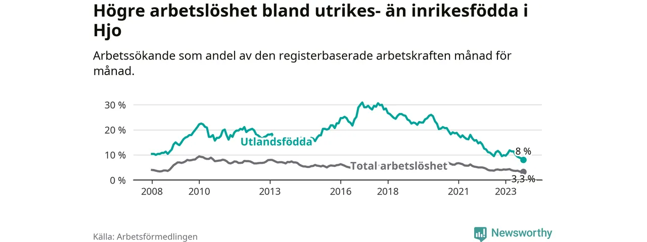 Skillnaden i arbetslöshet mellan utrikesfödda och hela befolkningen är 4,7 procentenheter i Hjo. Det är en betydligt mindre skillnad än för ett år sedan (−2,2 procentenheter).
