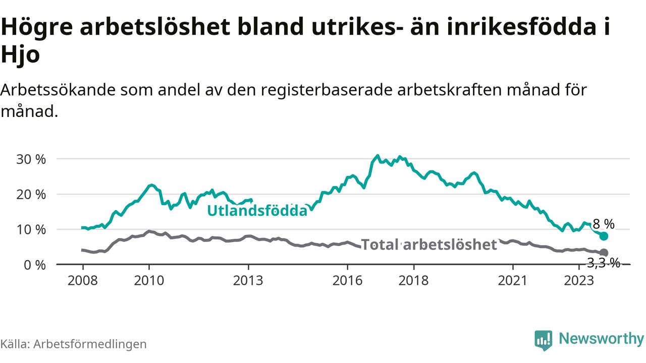 Den senaste månadsstatistiken från Arbetsförmedlingen visar på en nedgång i arbetslöshet bland utlandsfödda i Hjo kommun med 2,9 procentenheter. Arbetslösheten bland invånare födda i ett annat land låg i oktober på 8,0 procent.