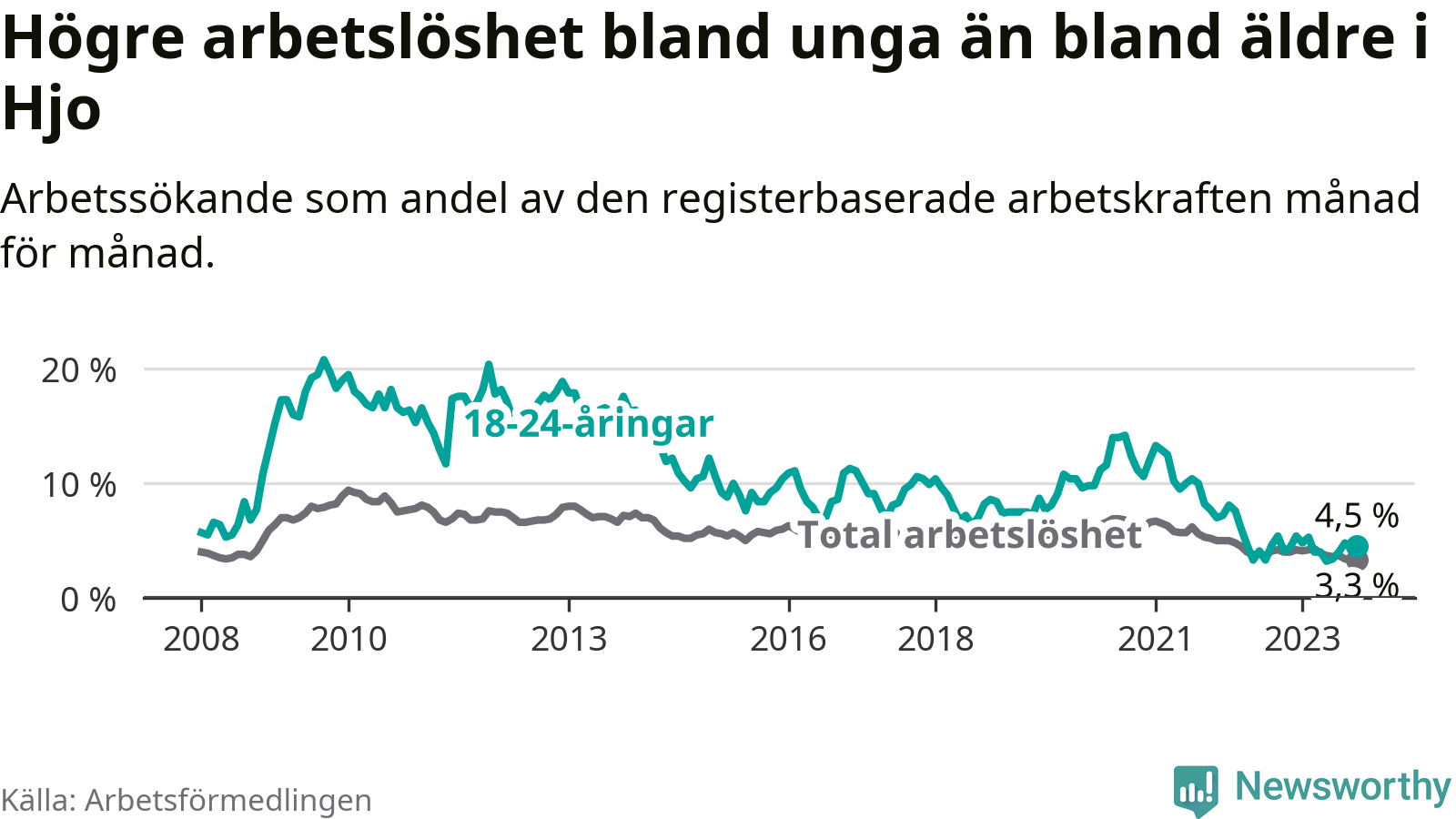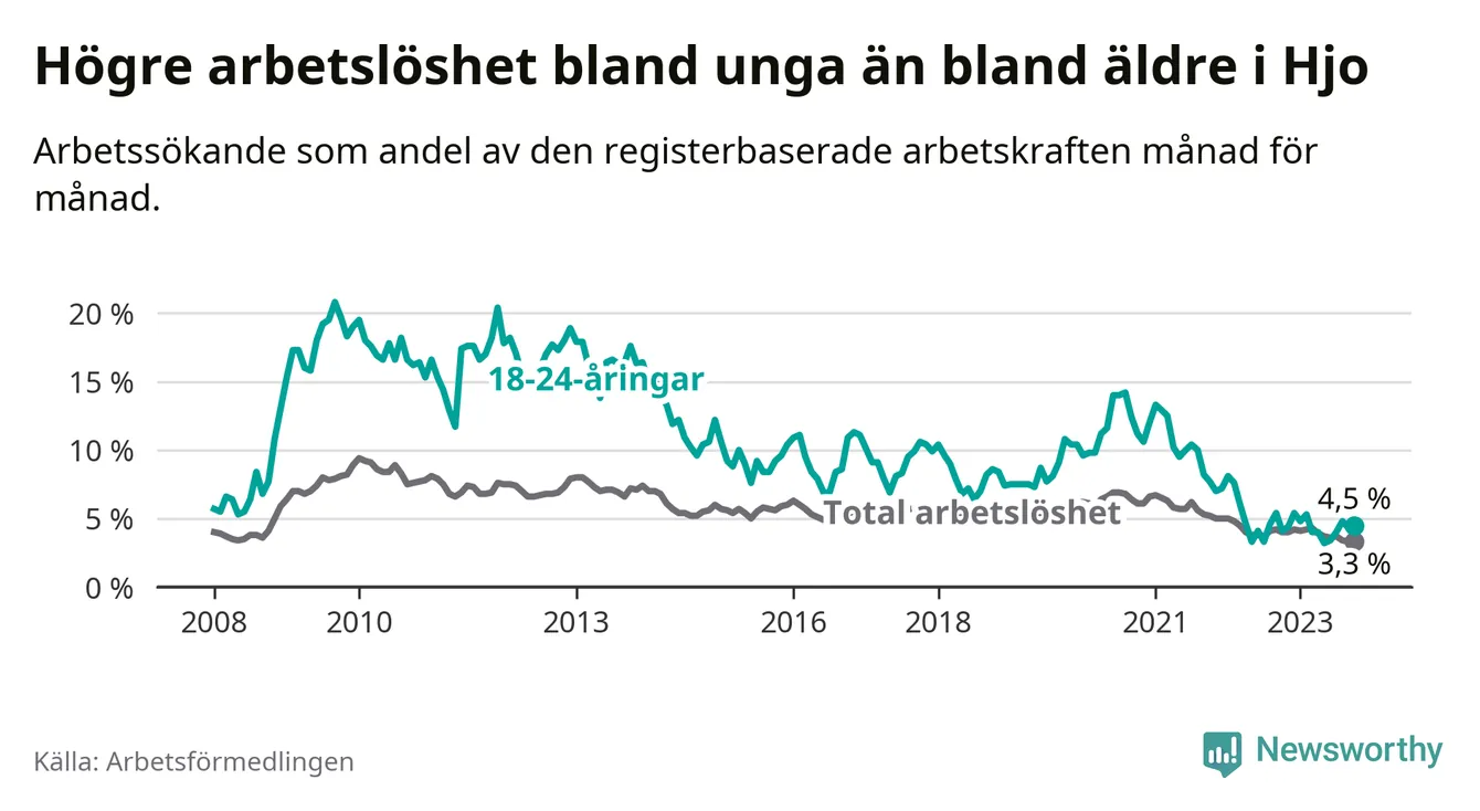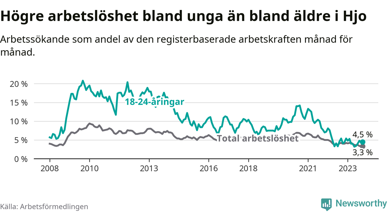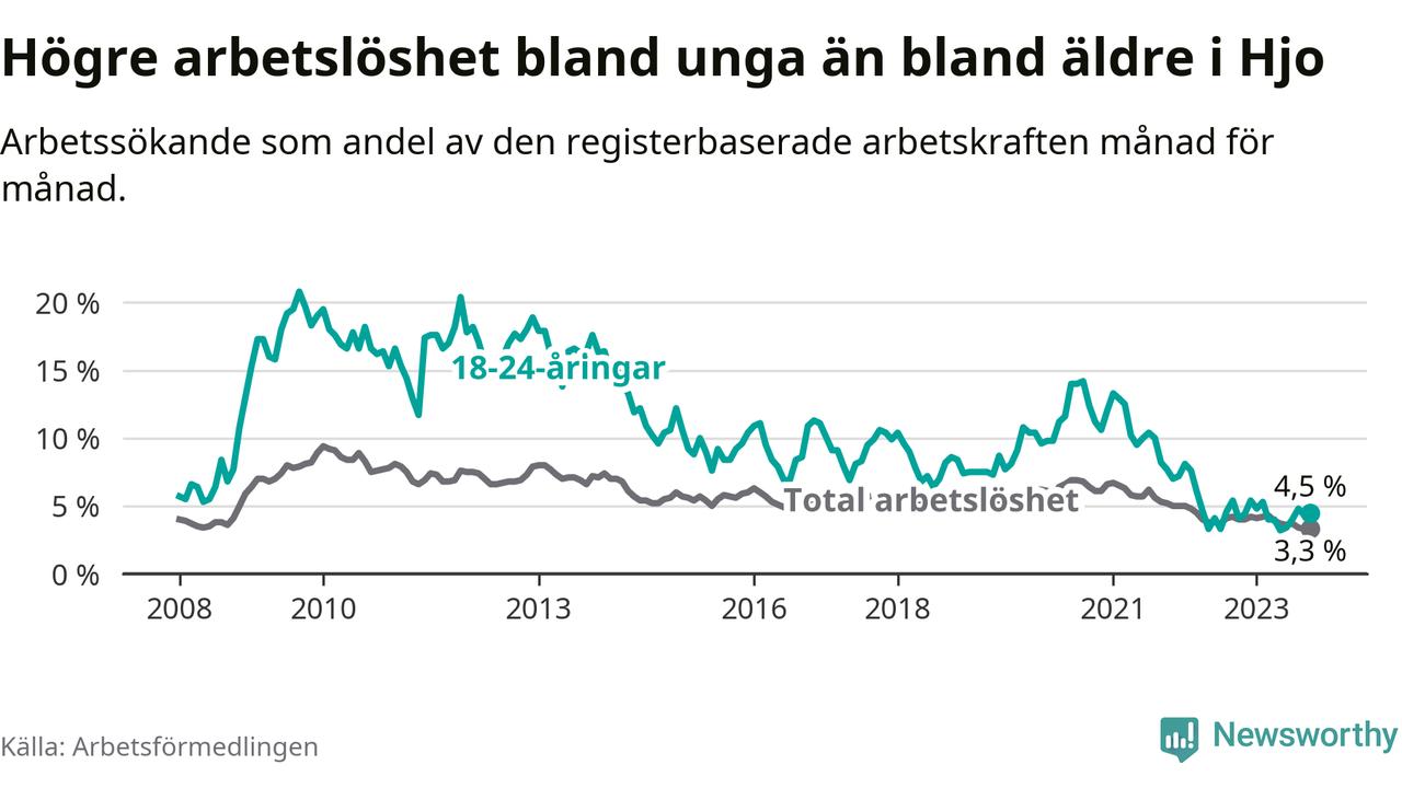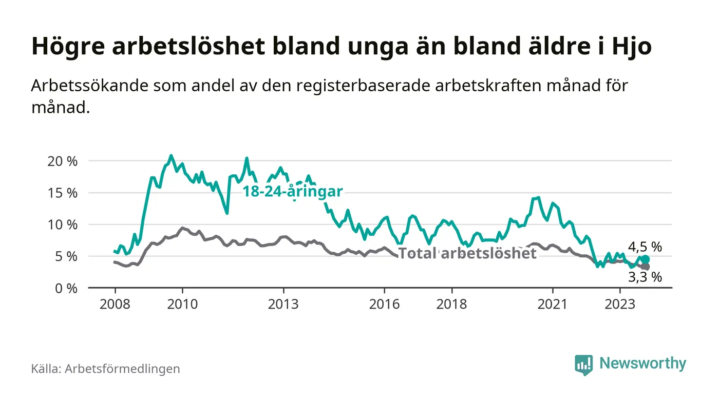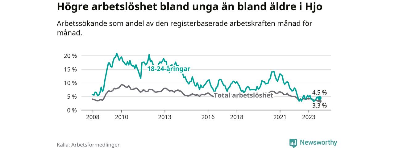Till skillnad från den totala arbetslösheten stiger arbetslösheten bland unga (+0,4 procentenheter). I oktober var 4,5 procent av 18–24-åringarna inskrivna som arbetssökande (motsvarande 16 personer). Mäter vi antalet inskrivna ser vi en ökning med ett personer på ett års sikt.