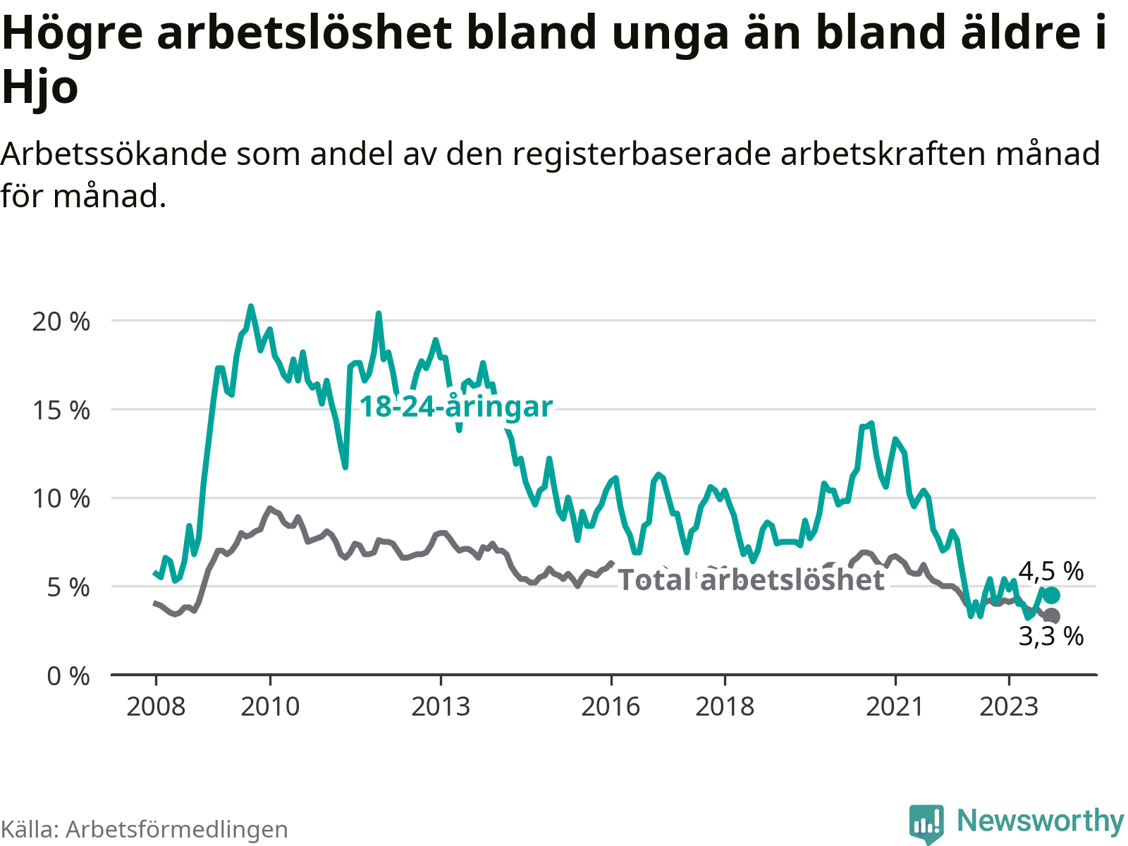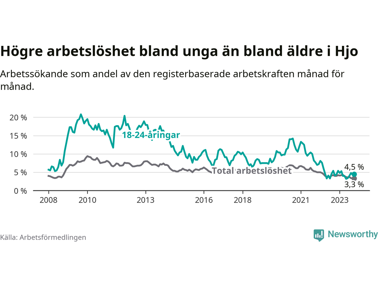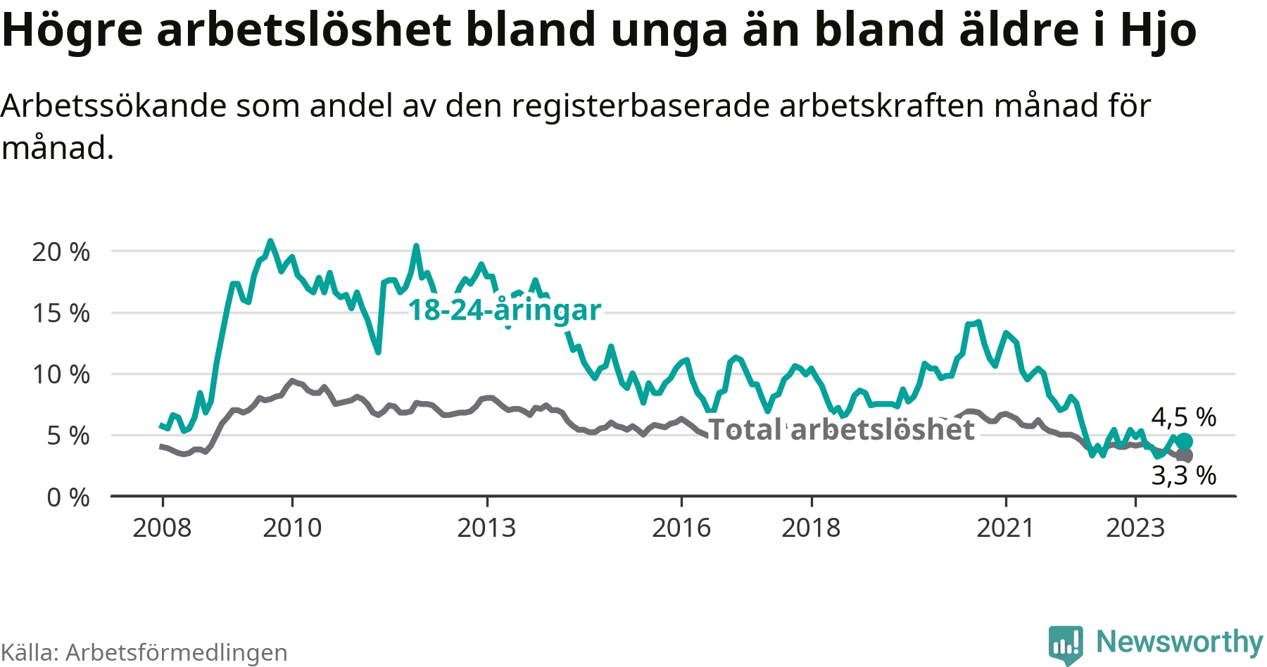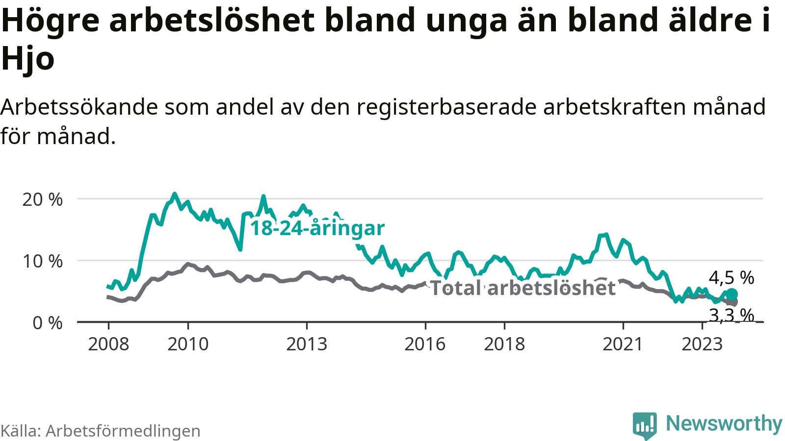 Till skillnad från den totala arbetslösheten stiger arbetslösheten bland unga (+0,4 procentenheter). I oktober var 4,5 procent av 18–24-åringarna inskrivna som arbetssökande (motsvarande 16 personer). Mäter vi antalet inskrivna ser vi en ökning med ett personer på ett års sikt.