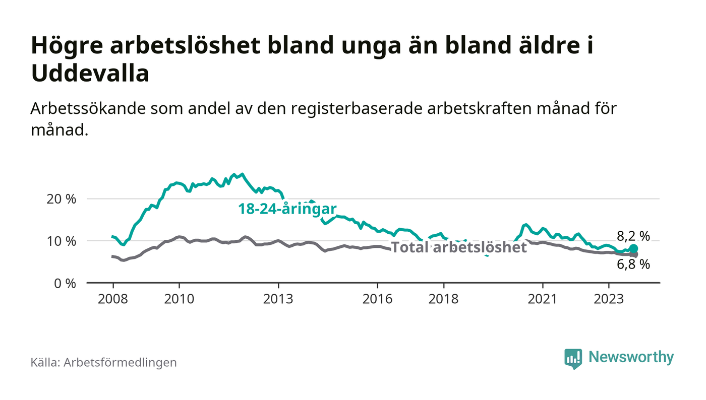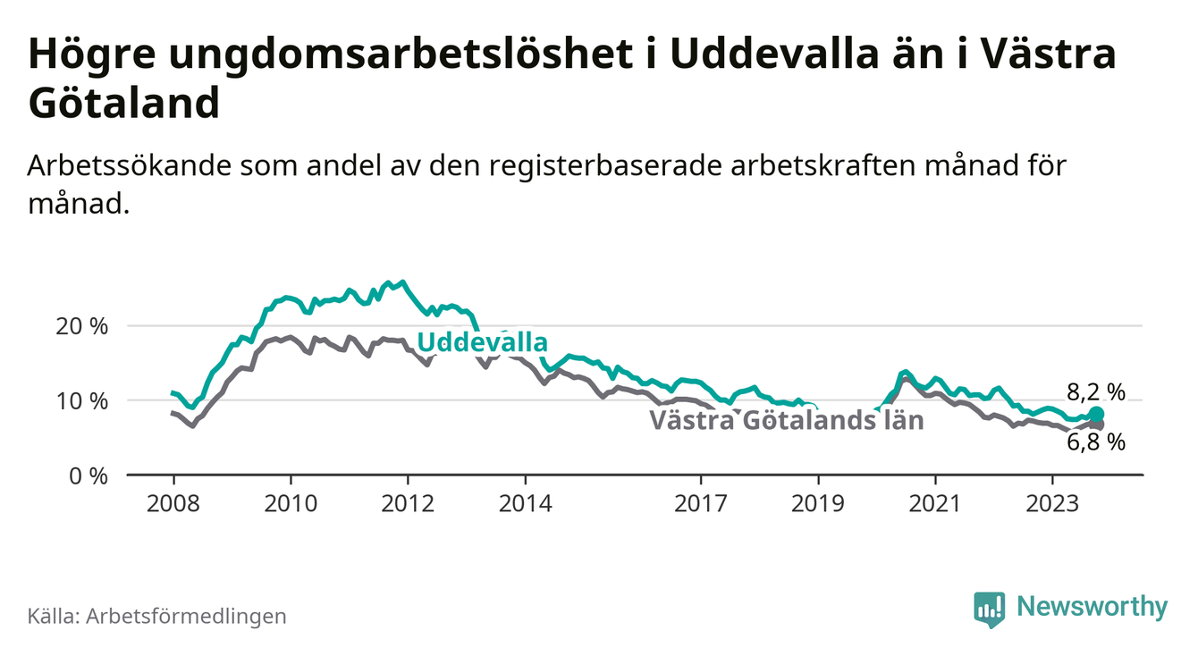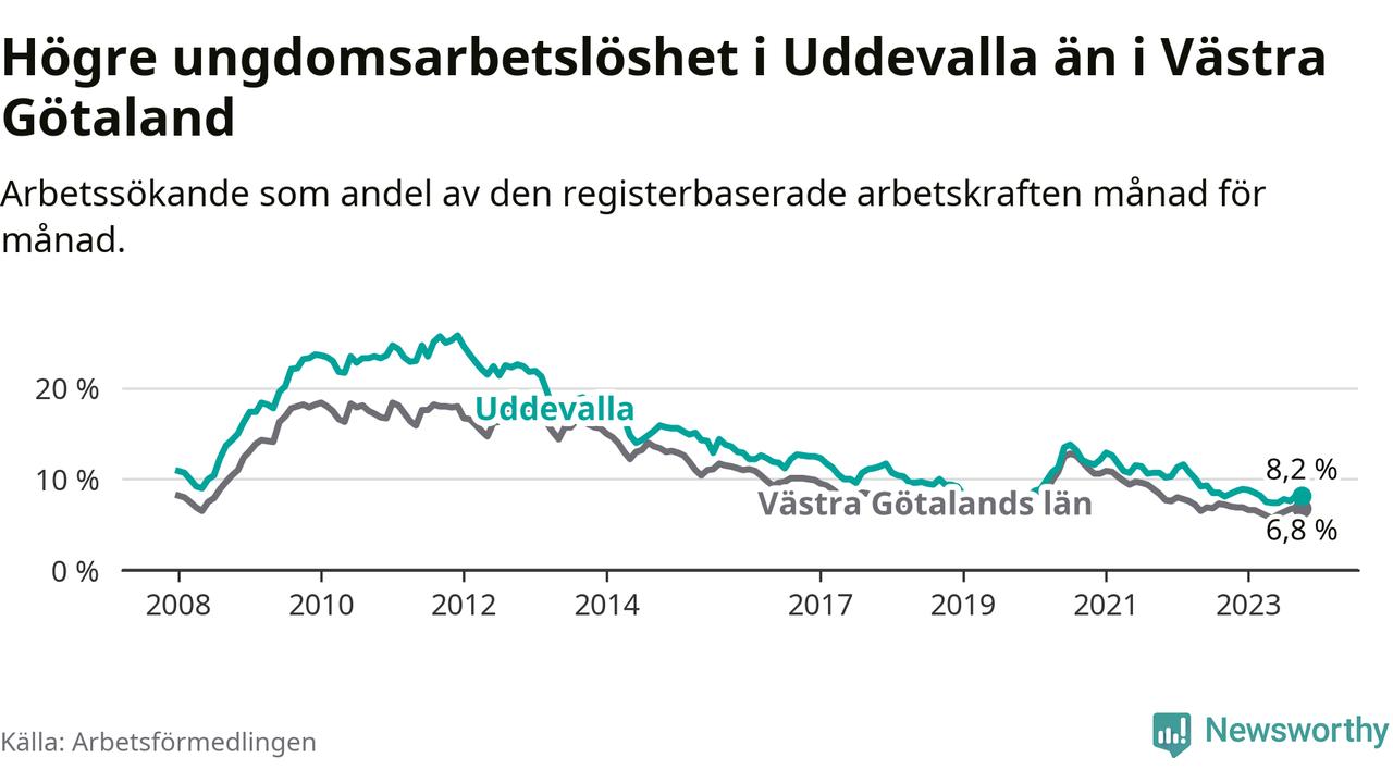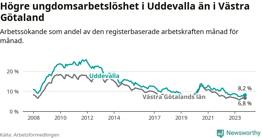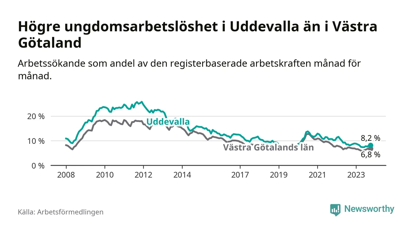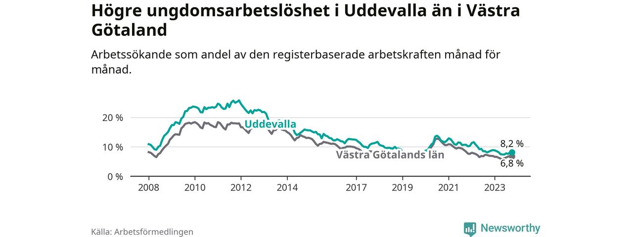 Precis som den totala arbetslösheten ligger ungdomsarbetslösheten i Uddevalla högre än i Västra Götaland som helhet. Skillnaden mellan kommunen och länet är 1,4 procentenheter.