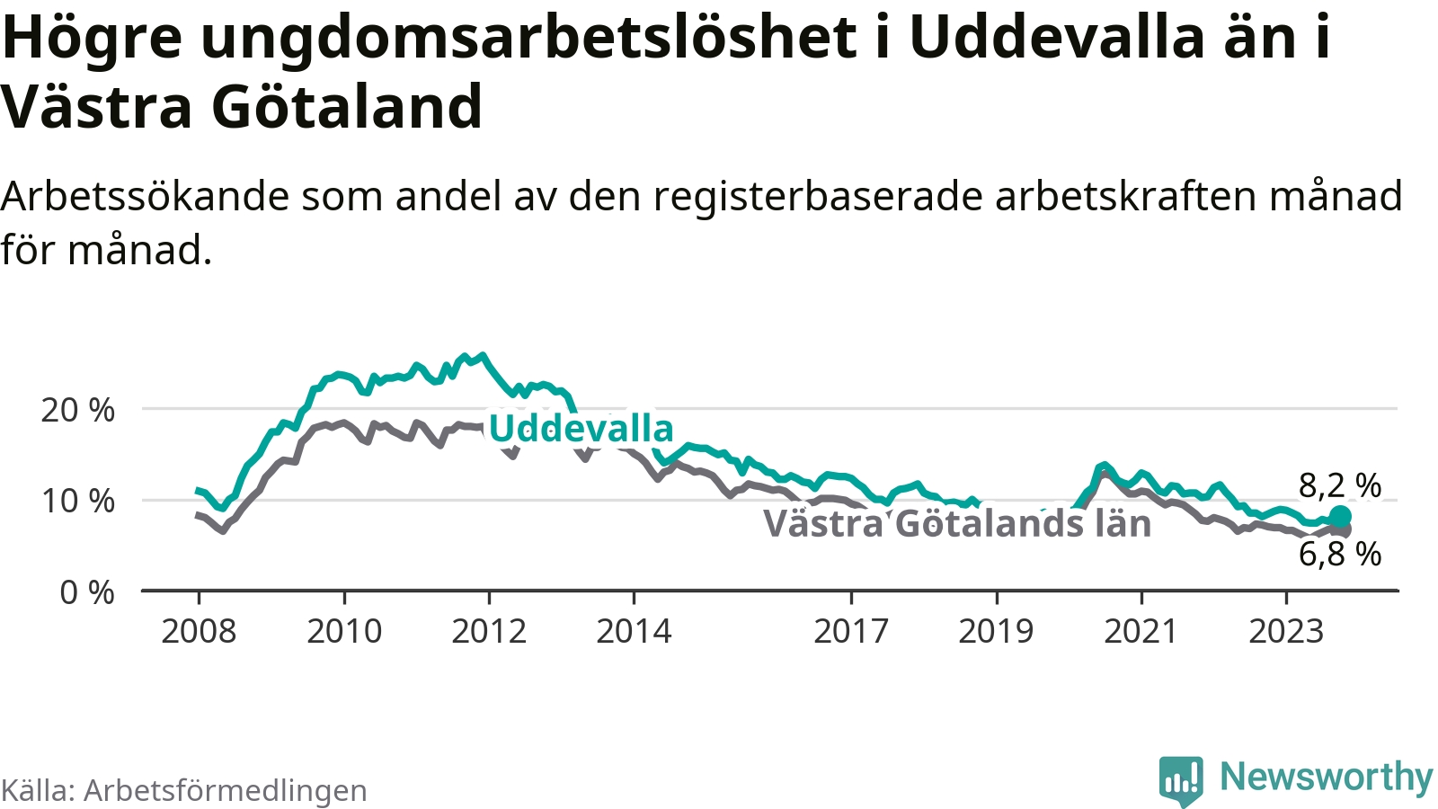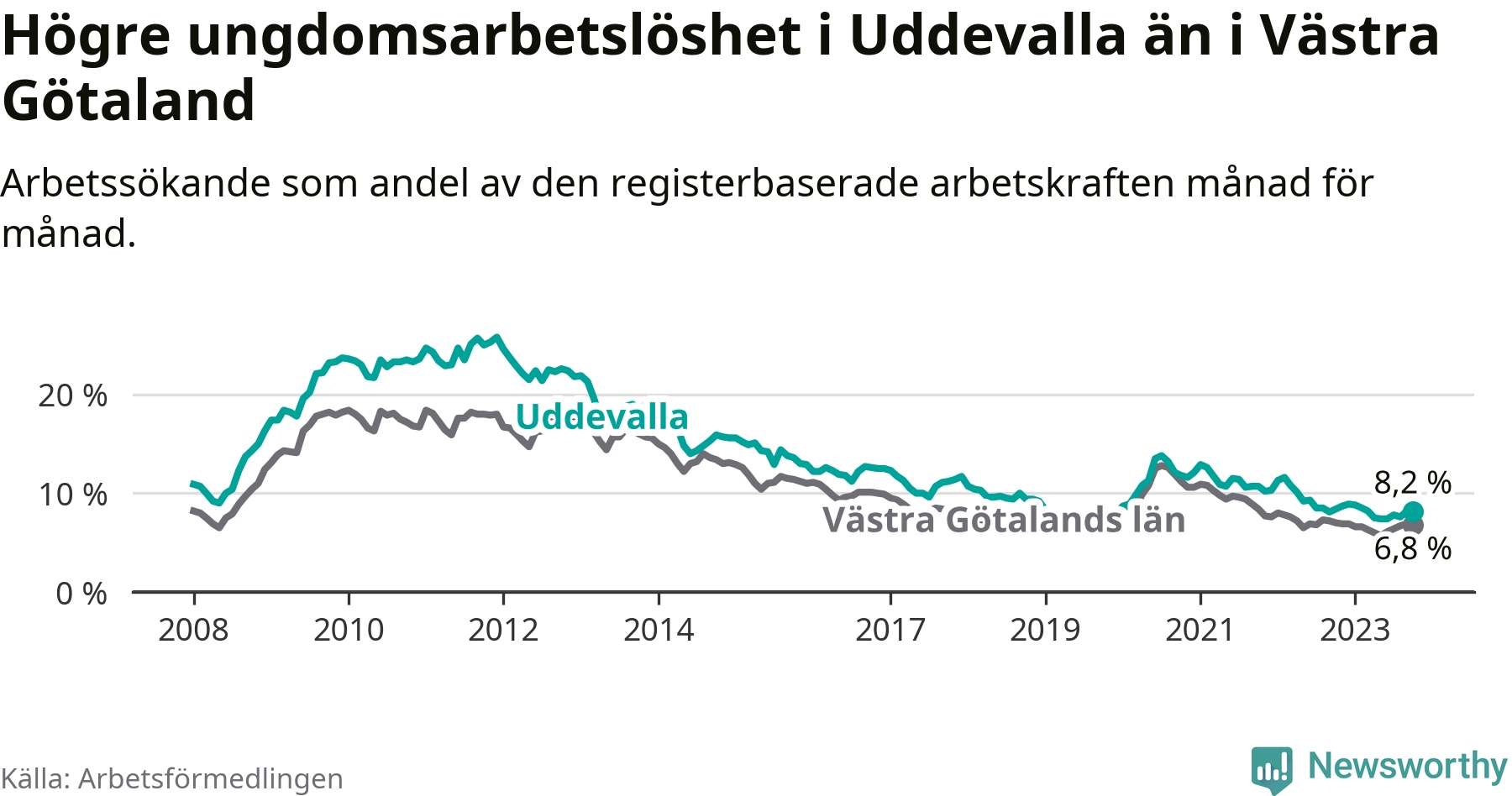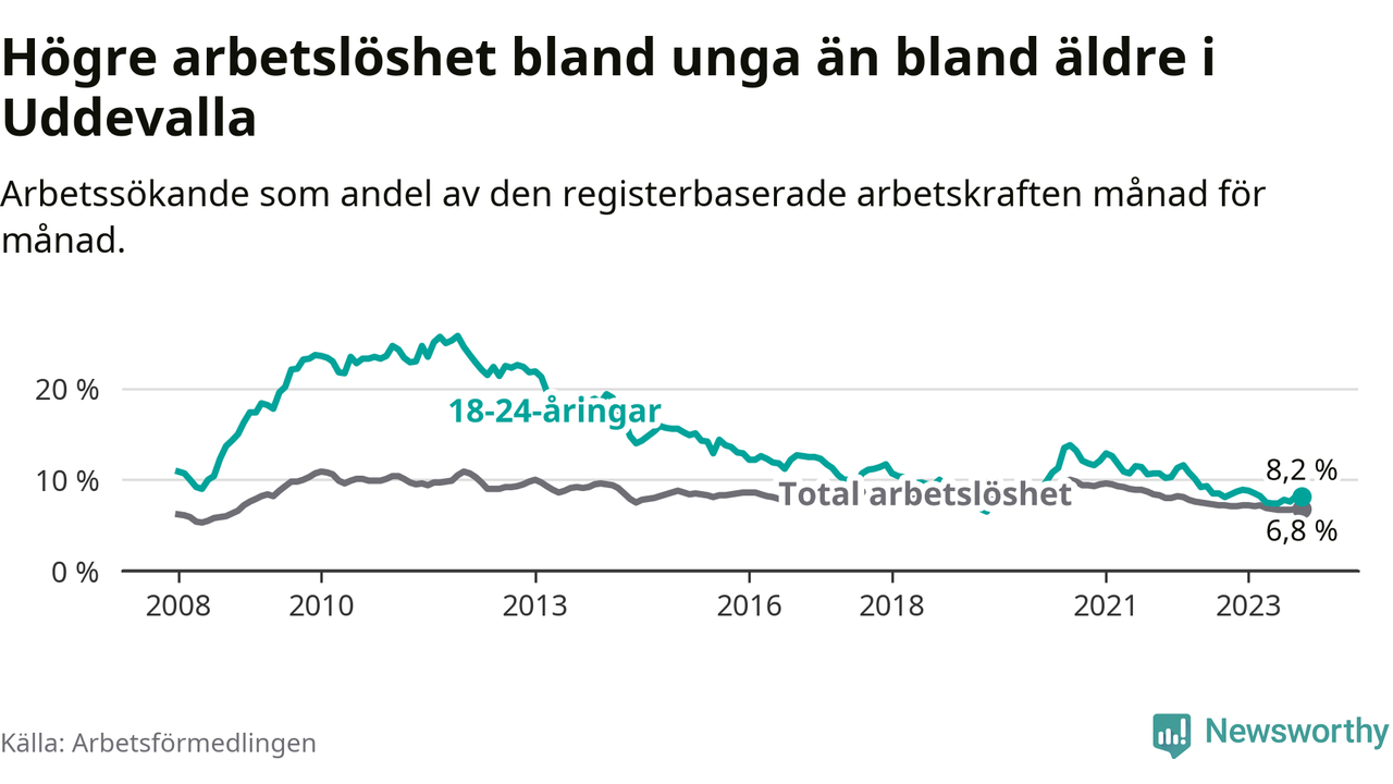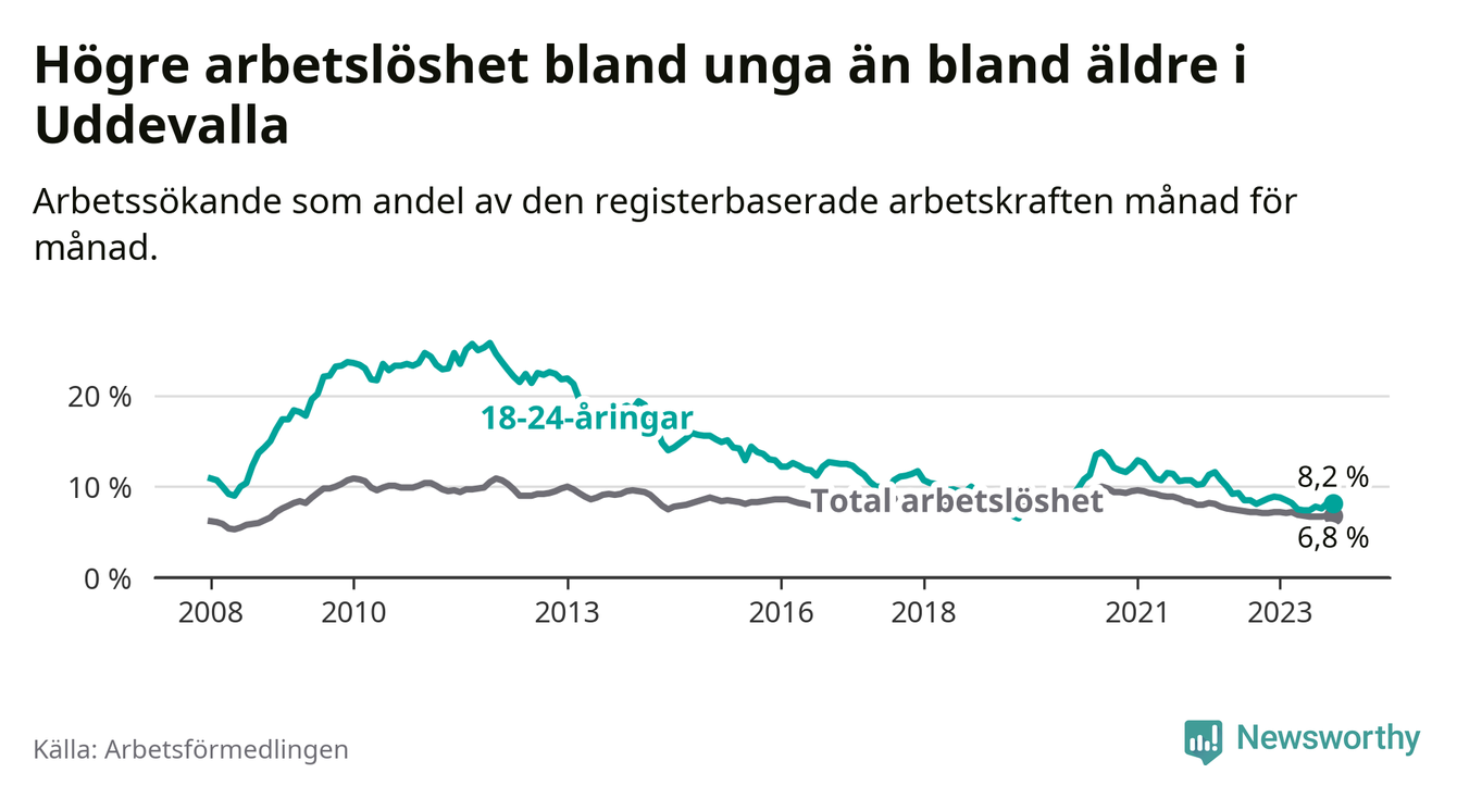 Precis som den totala arbetslösheten ligger ungdomsarbetslösheten i Uddevalla högre än i Västra Götaland som helhet. Skillnaden mellan kommunen och länet är 1,4 procentenheter.
