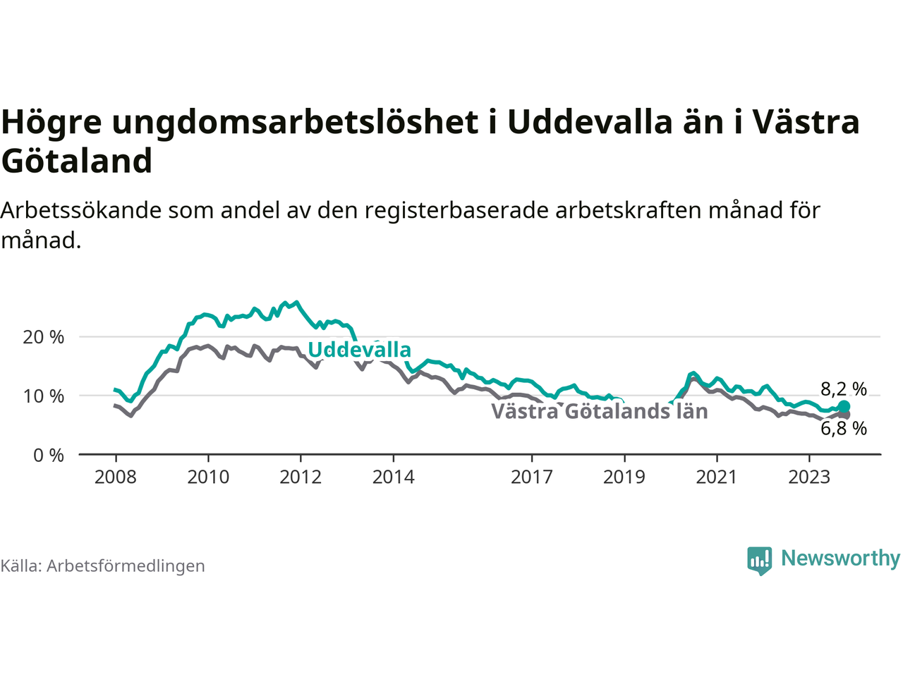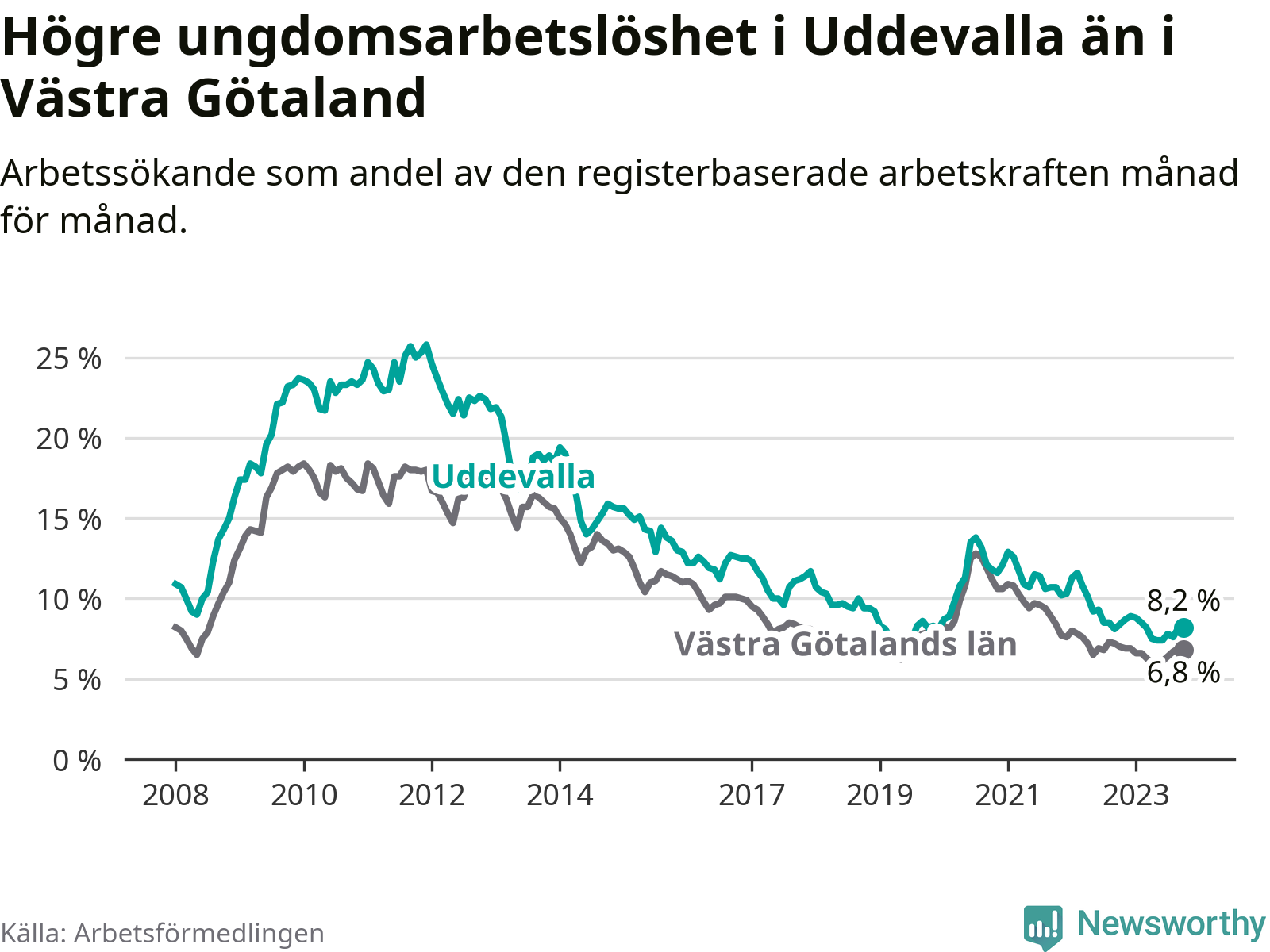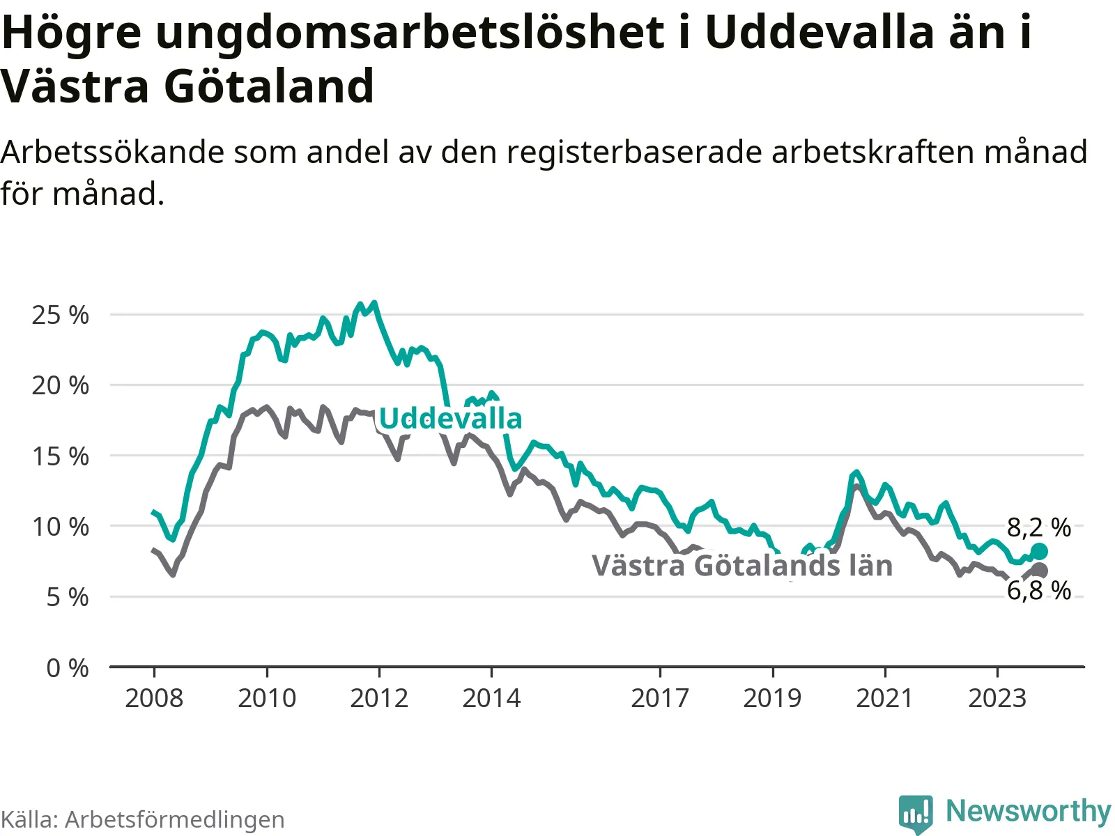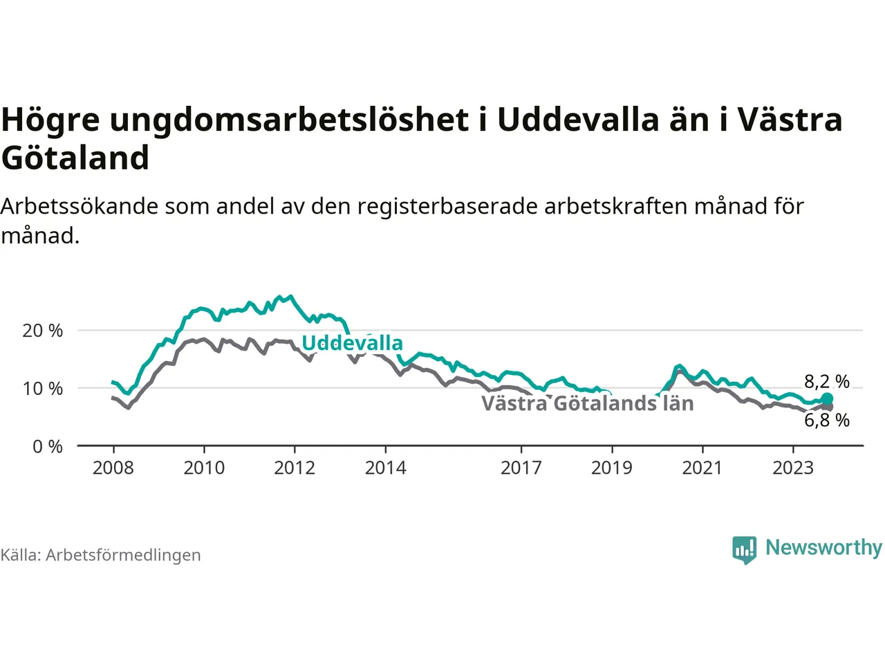 Precis som den totala arbetslösheten ligger ungdomsarbetslösheten i Uddevalla högre än i Västra Götaland som helhet. Skillnaden mellan kommunen och länet är 1,4 procentenheter.