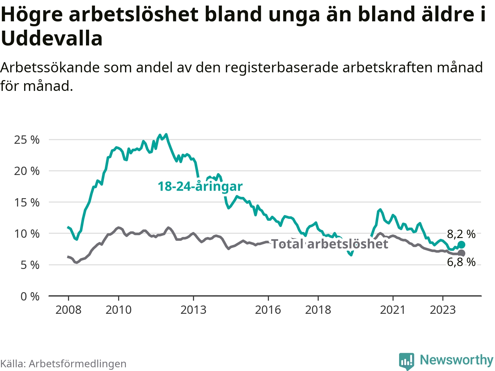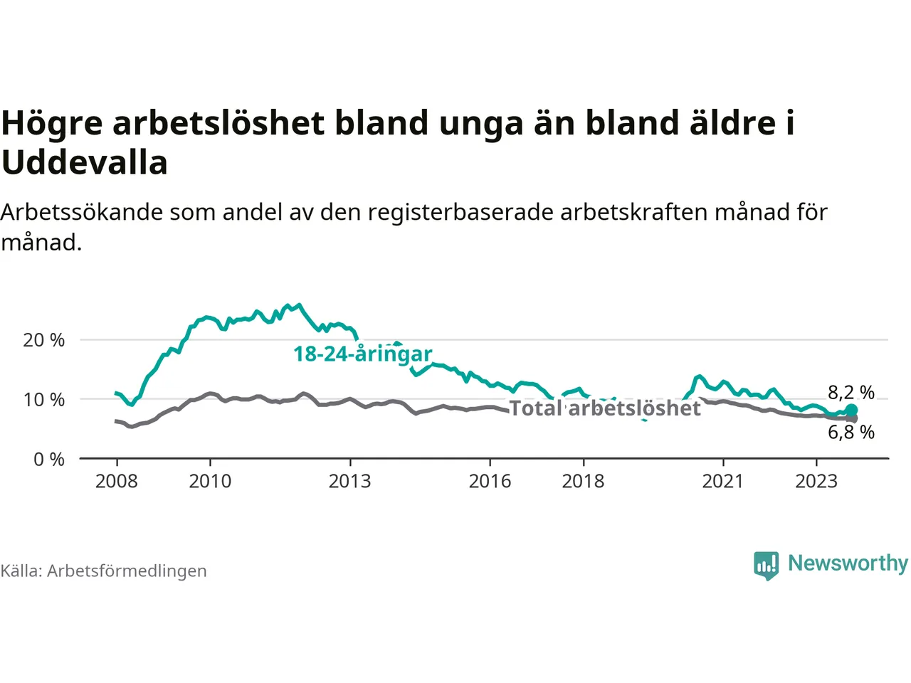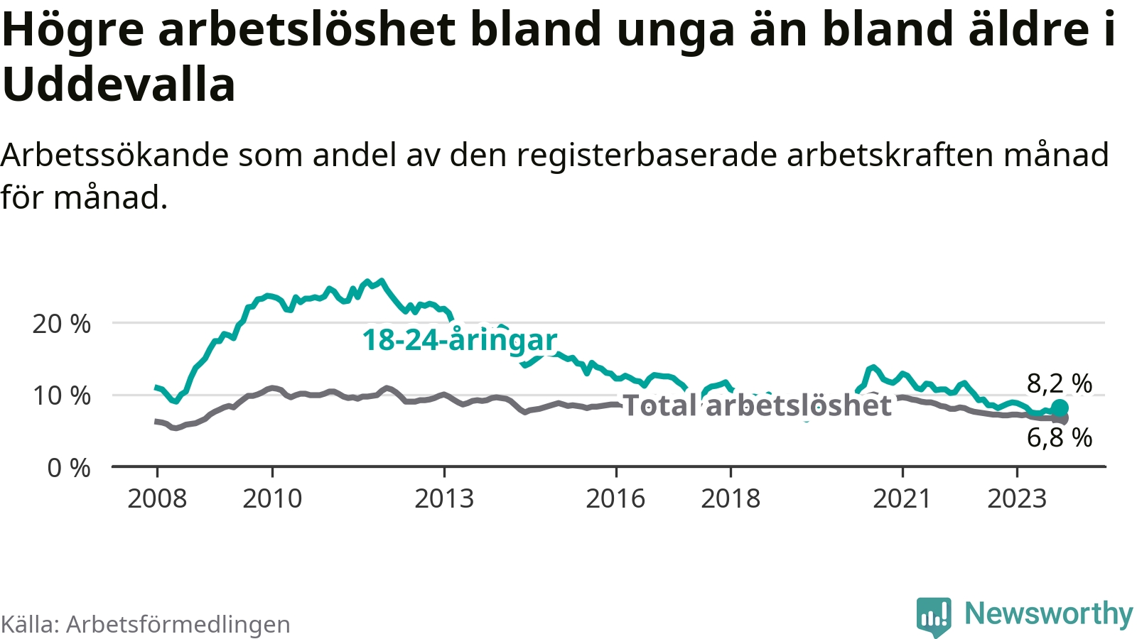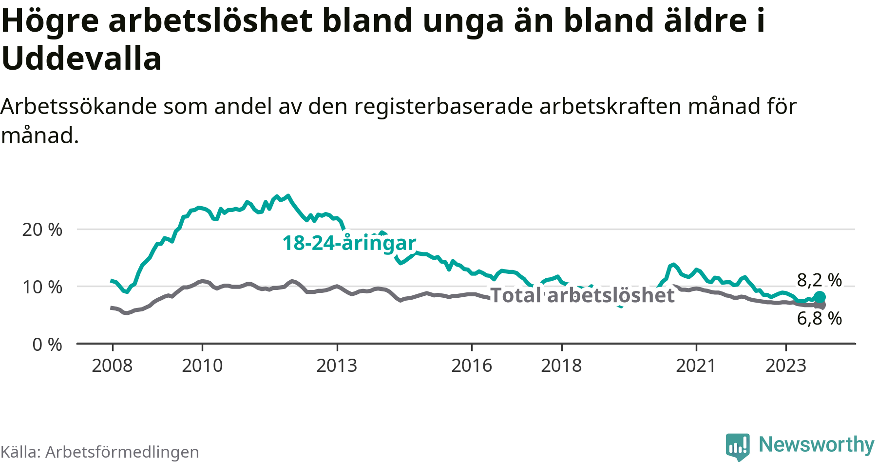 Precis som den totala arbetslösheten ligger ungdomsarbetslösheten i Uddevalla högre än i Västra Götaland som helhet. Skillnaden mellan kommunen och länet är 1,4 procentenheter.