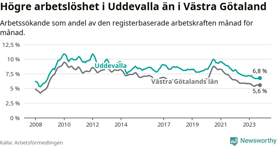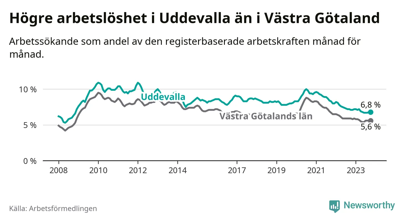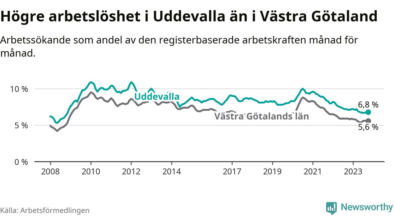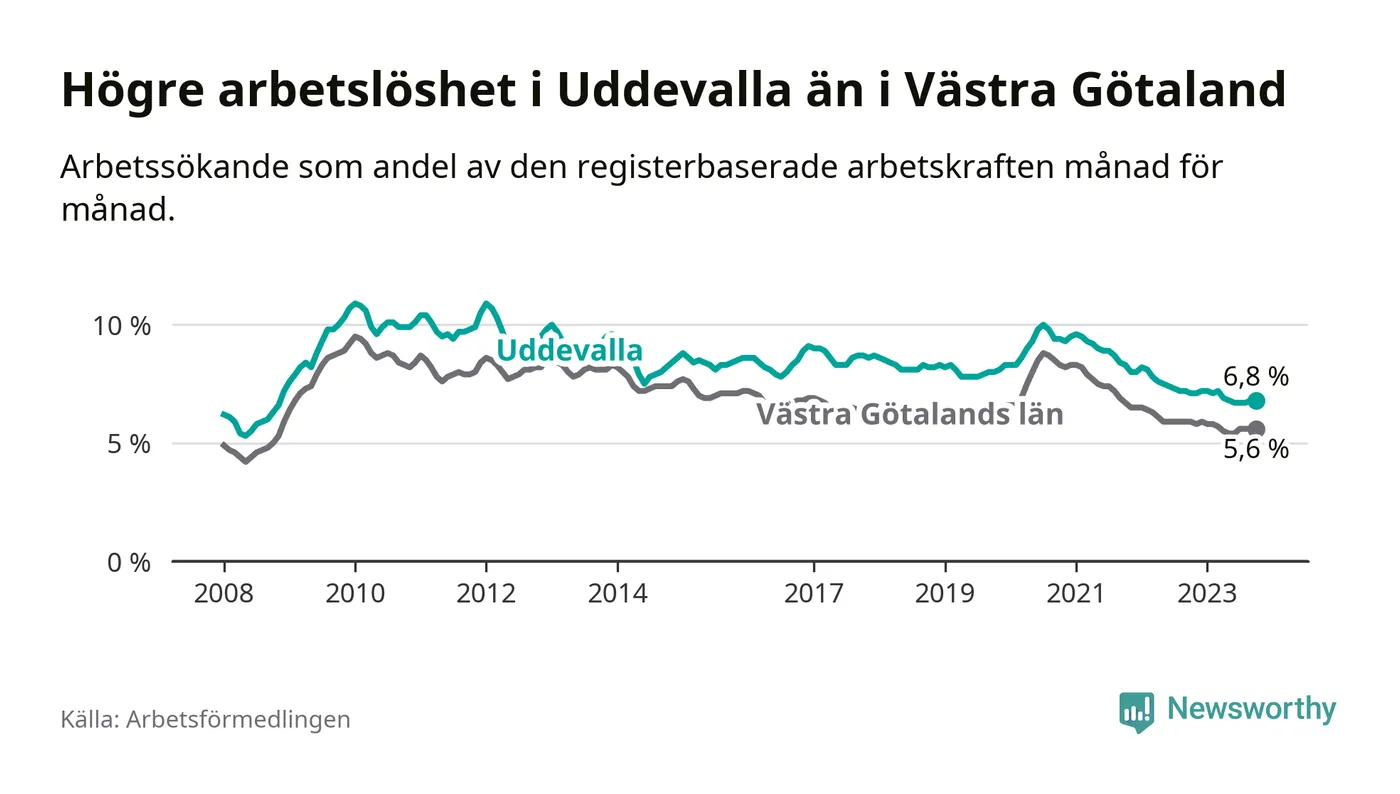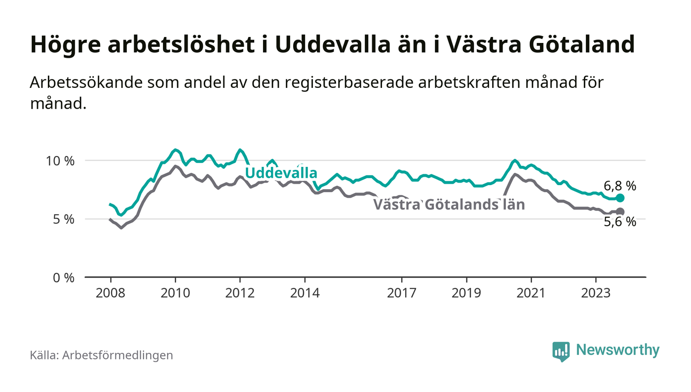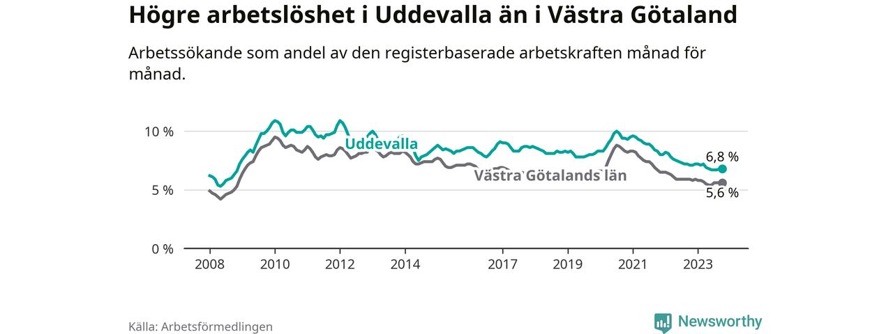 Även om arbetslösheten i Uddevalla alltså minskar, så ligger den fortfarande över snittet i hela Västra Götalands län (6,8 procent i kommunen, jämfört med 5,6 procent i hela länet). Öckerö har den lägsta arbetslösheten i länet (2,4 procent), medan Trollhättan har den högsta (8,4 procent). För att Uddevalla skulle komma ner i samma arbetslöshetsnivå som Öckerö skulle 1 217 personer behöva sysselsättas.