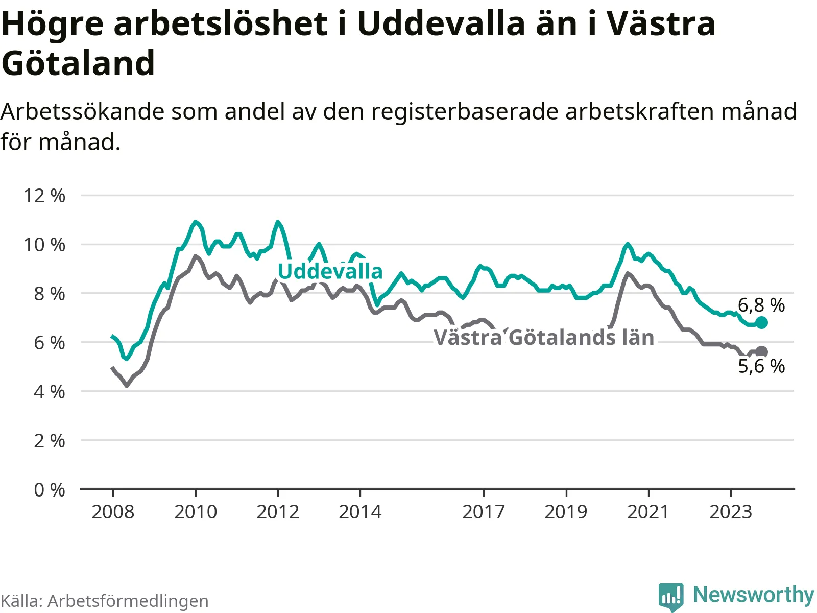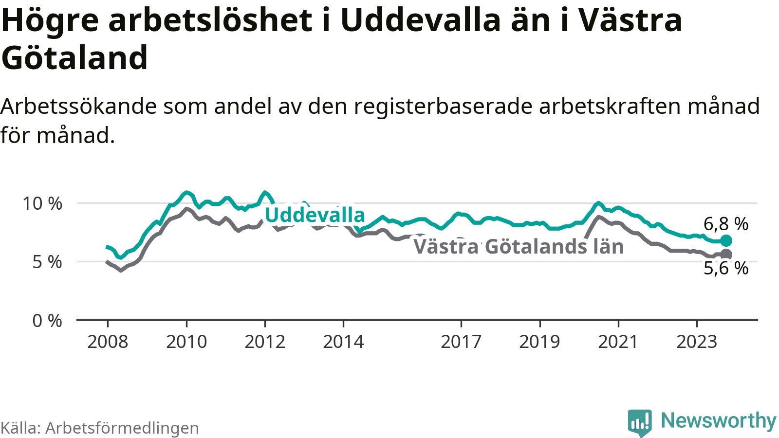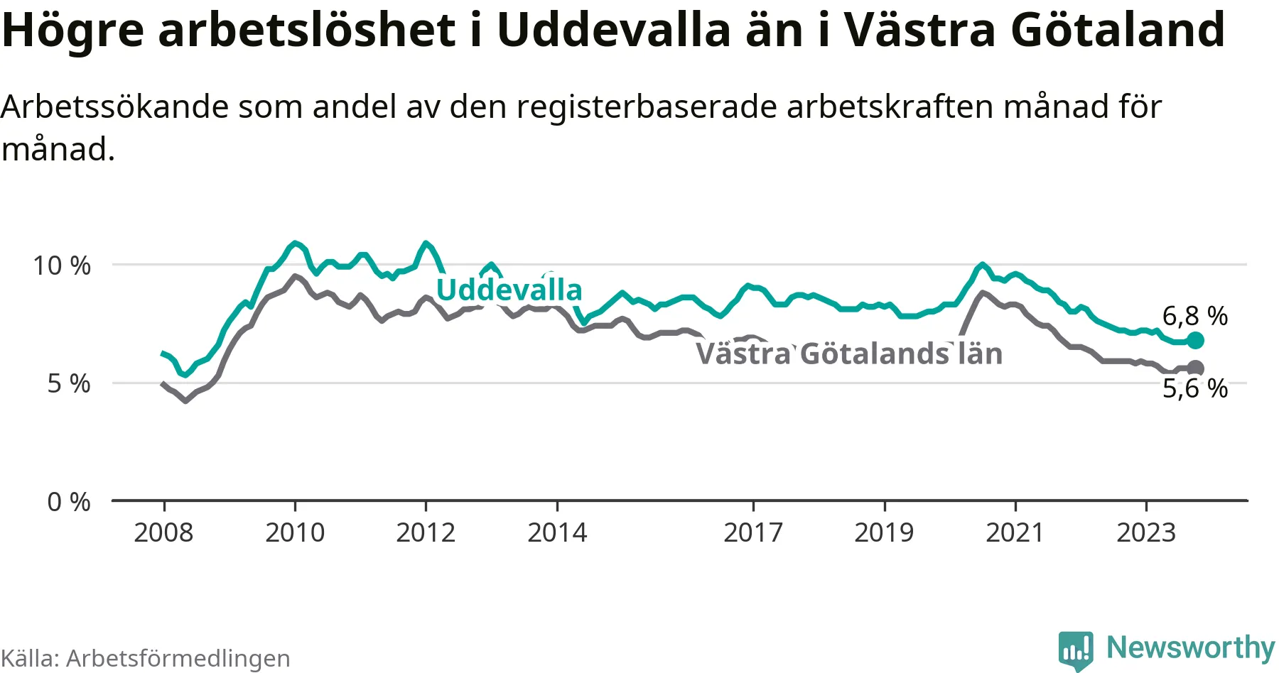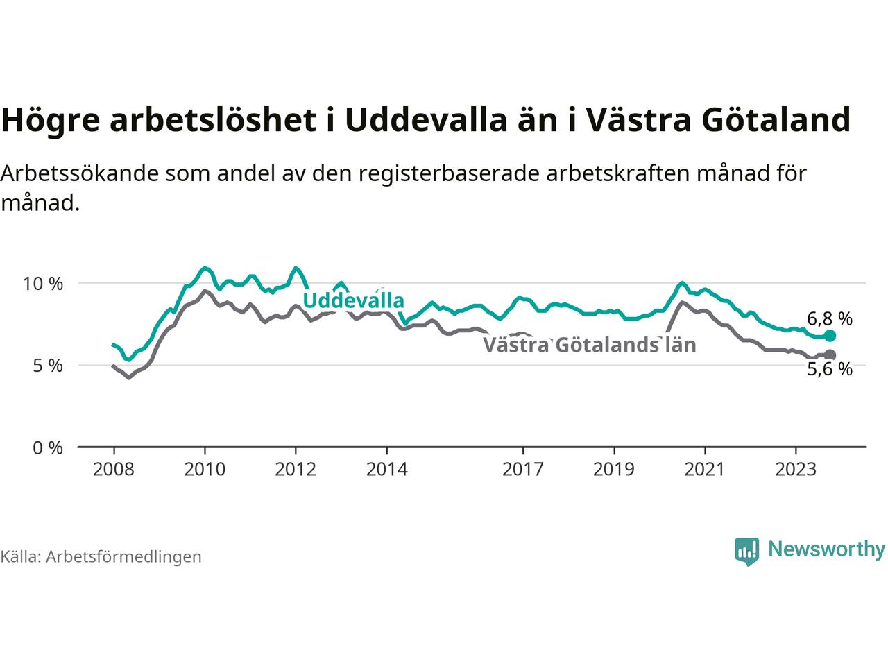 Även om arbetslösheten i Uddevalla alltså minskar, så ligger den fortfarande över snittet i hela Västra Götalands län (6,8 procent i kommunen, jämfört med 5,6 procent i hela länet). Öckerö har den lägsta arbetslösheten i länet (2,4 procent), medan Trollhättan har den högsta (8,4 procent). För att Uddevalla skulle komma ner i samma arbetslöshetsnivå som Öckerö skulle 1 217 personer behöva sysselsättas.
