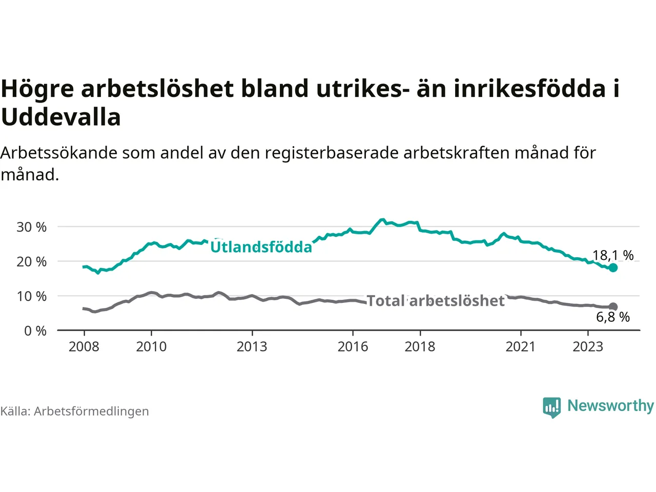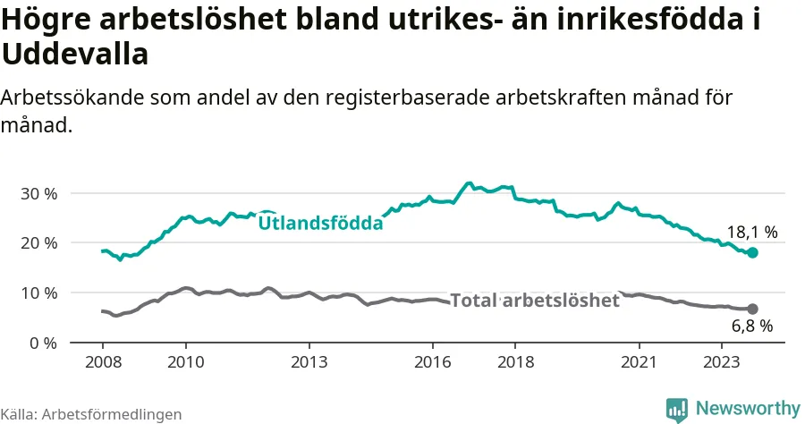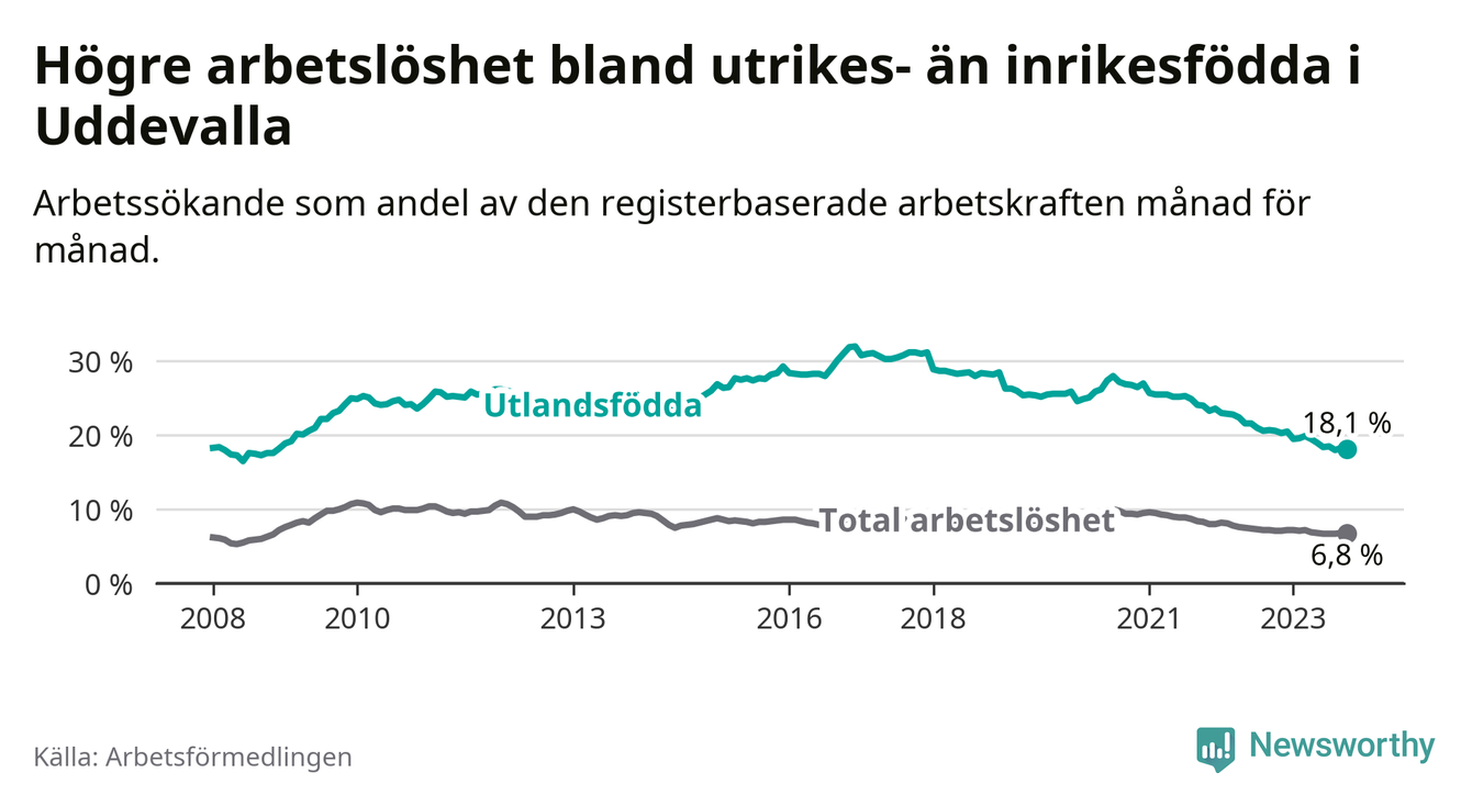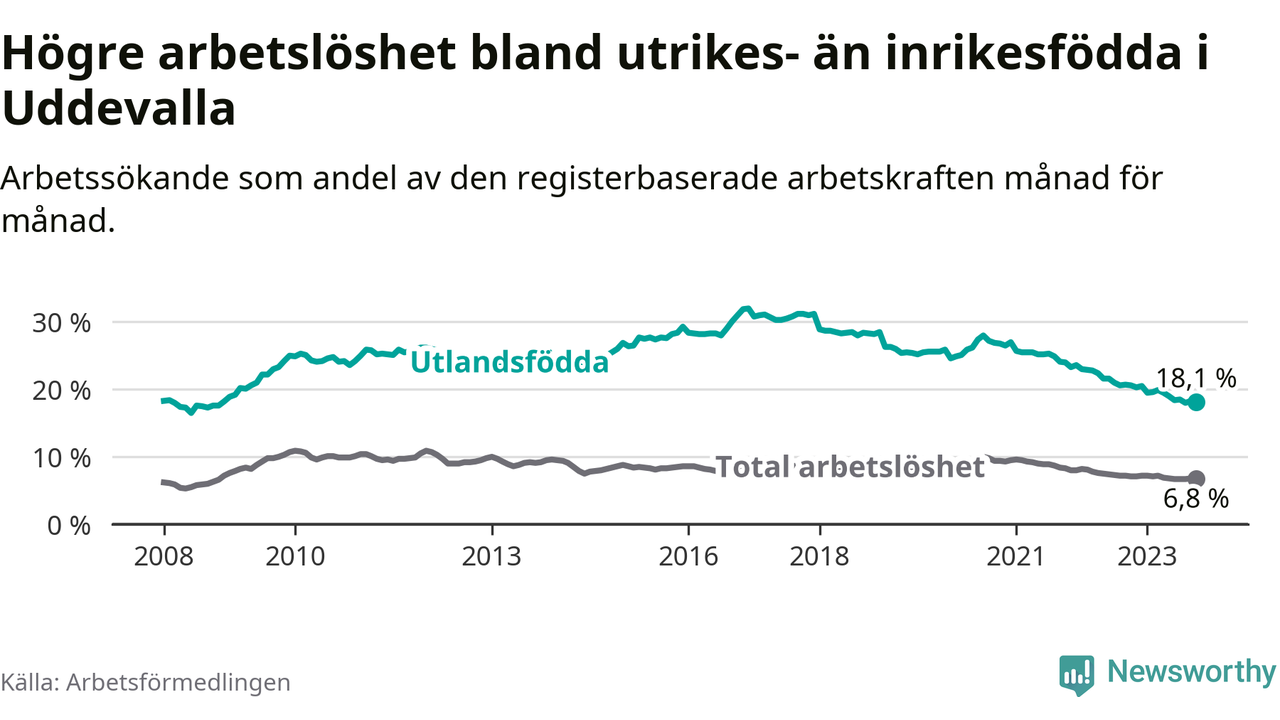 Skillnaden i arbetslöshet mellan utrikesfödda och hela befolkningen är 11,3 procentenheter i Uddevalla. Det är en betydligt mindre skillnad än för ett år sedan (−2,2 procentenheter).