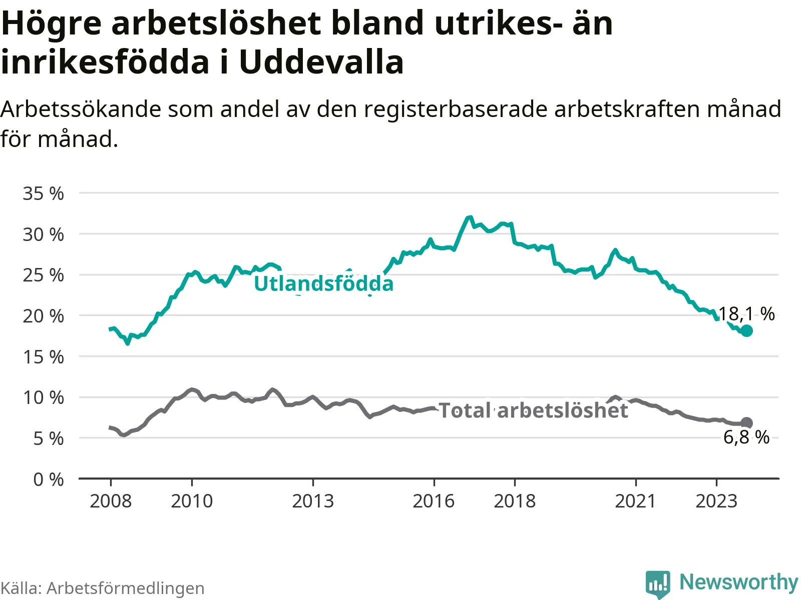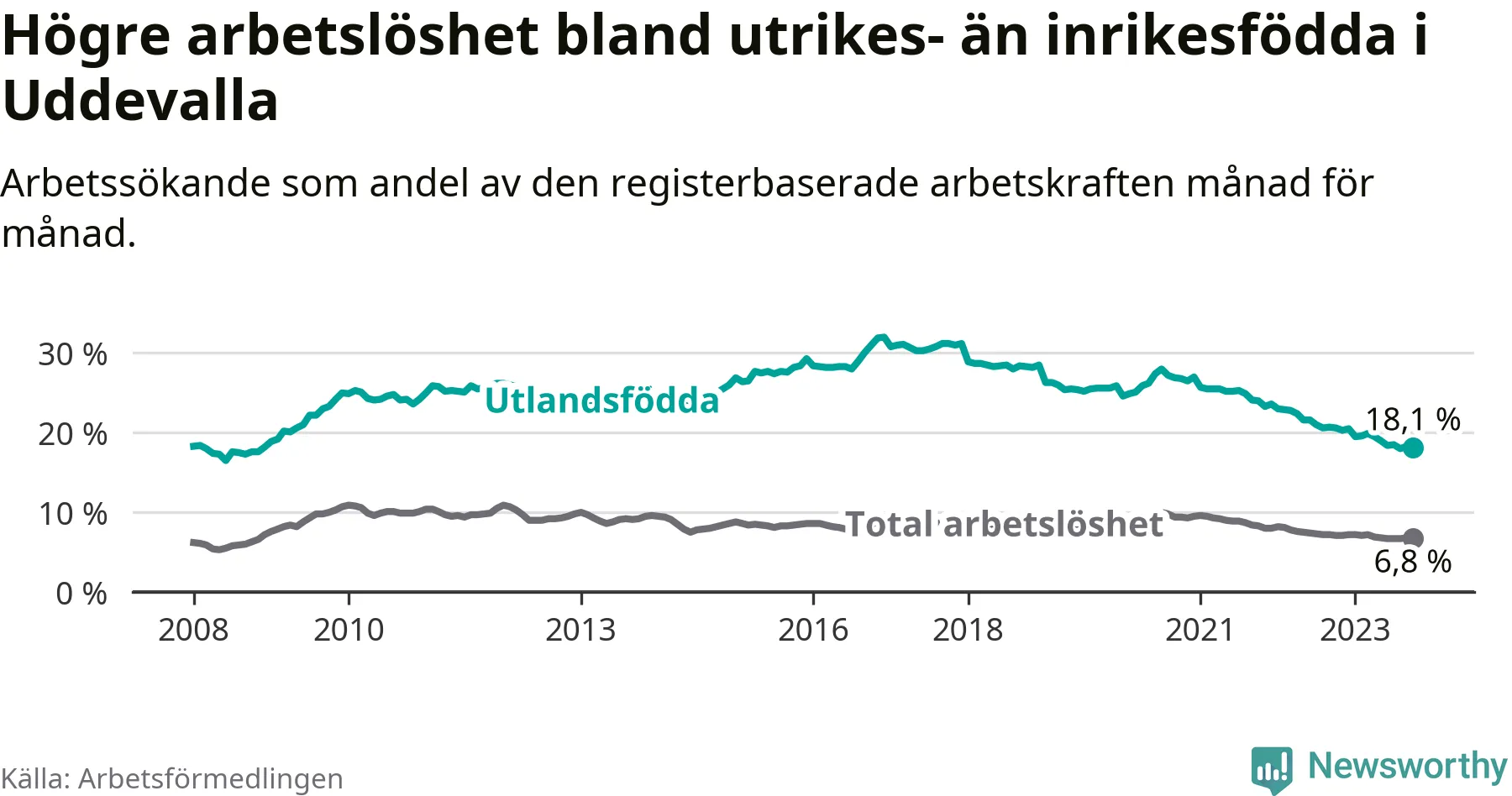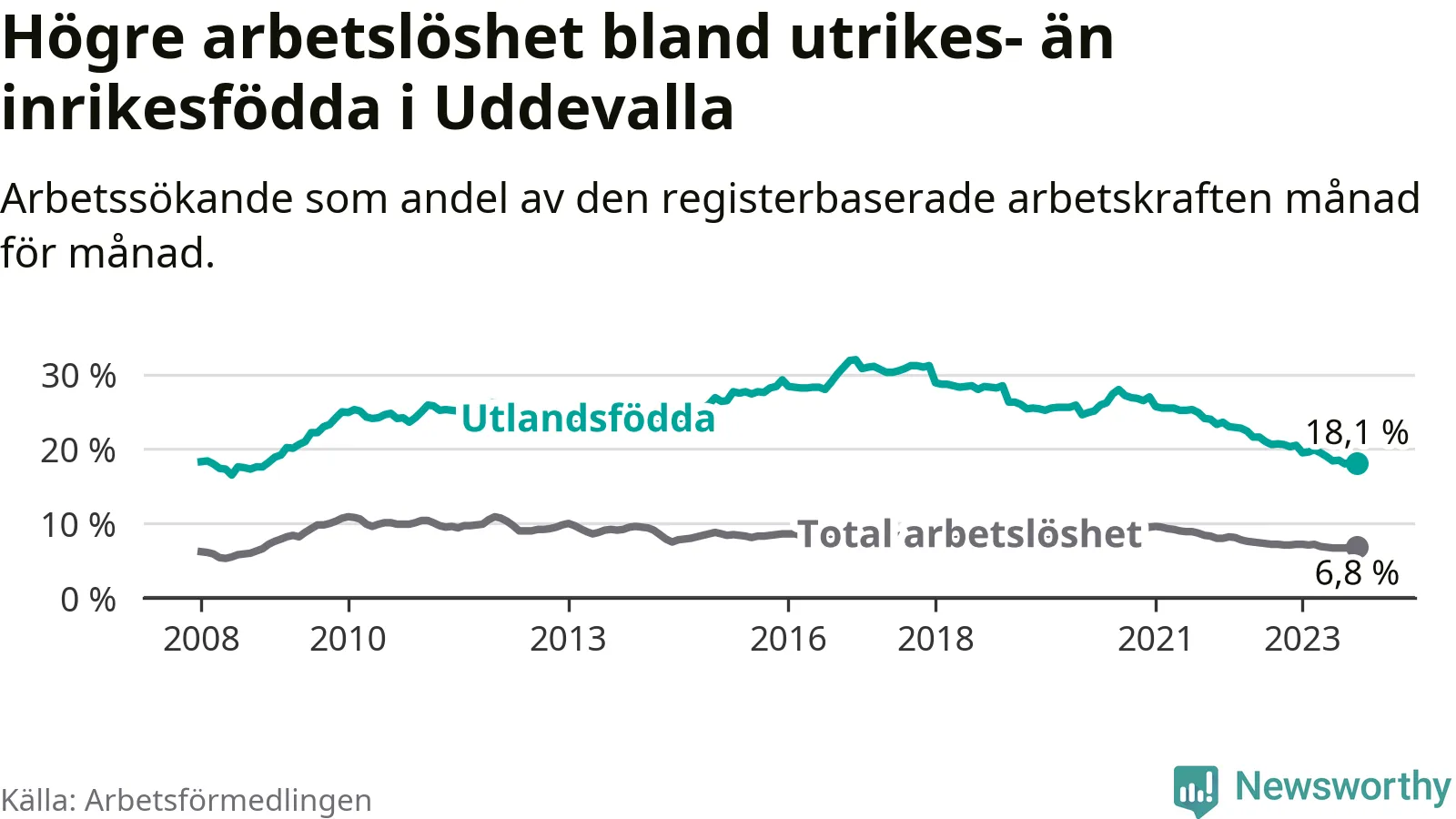 Skillnaden i arbetslöshet mellan utrikesfödda och hela befolkningen är 11,3 procentenheter i Uddevalla. Det är en betydligt mindre skillnad än för ett år sedan (−2,2 procentenheter).