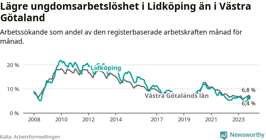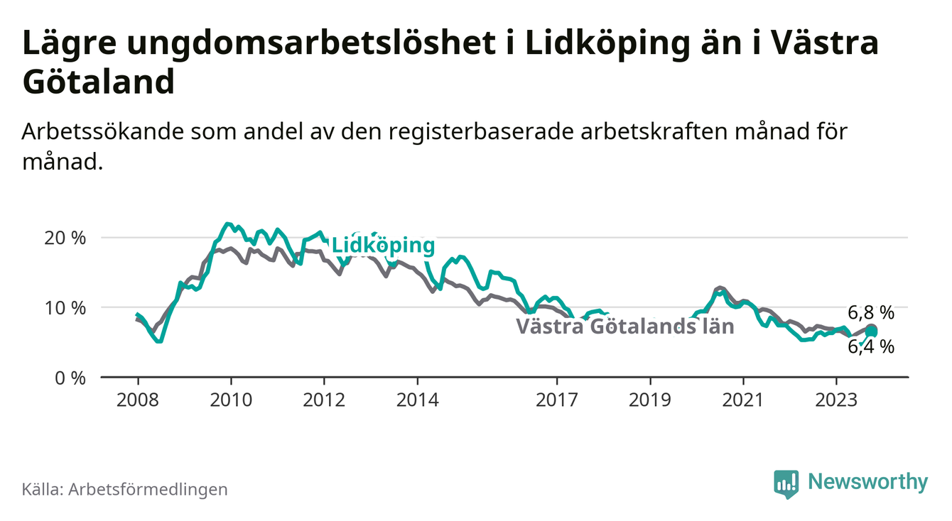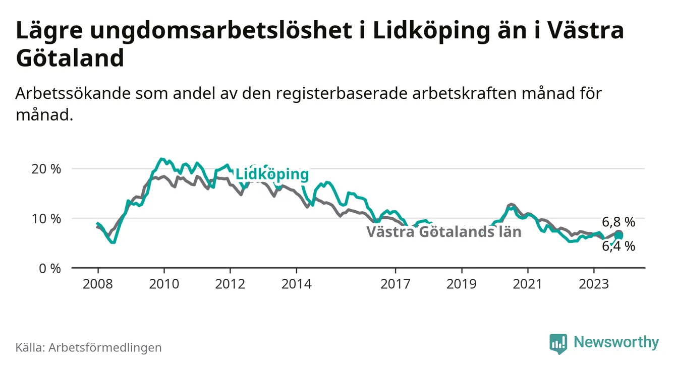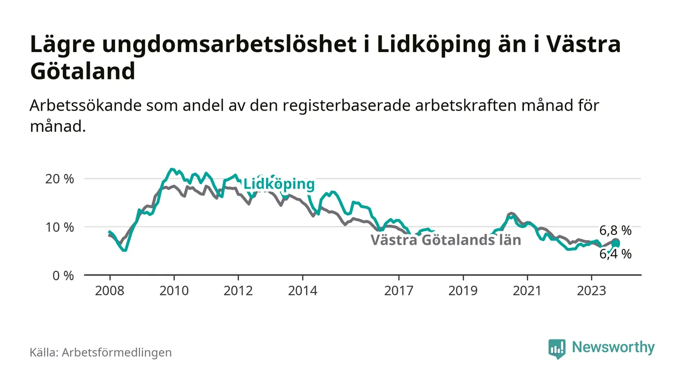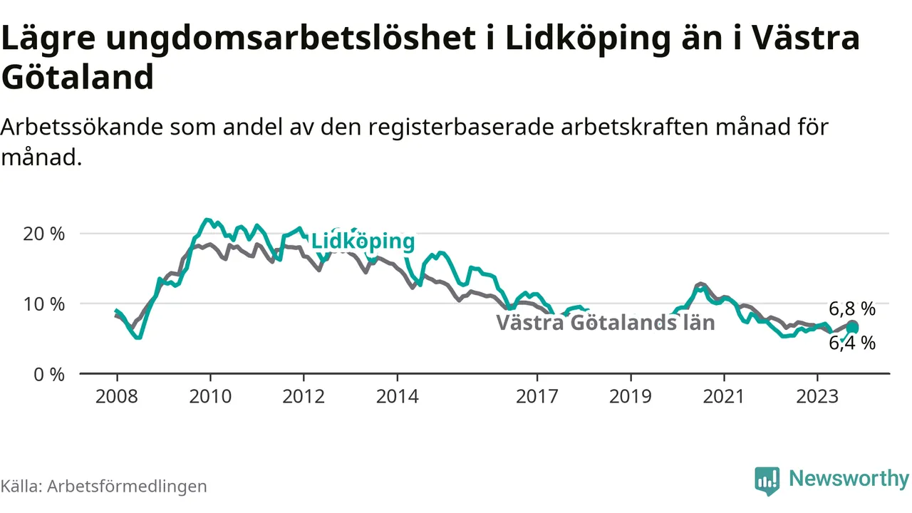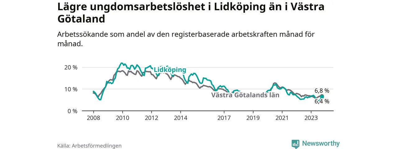 Graf: Arbetslöshet bland unga i Lidköpings kommun och Västra Götalands län