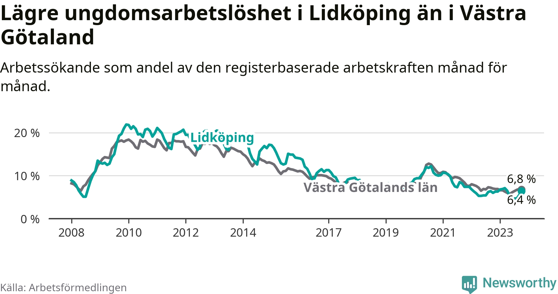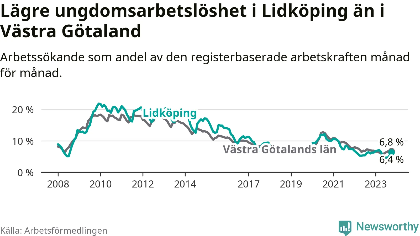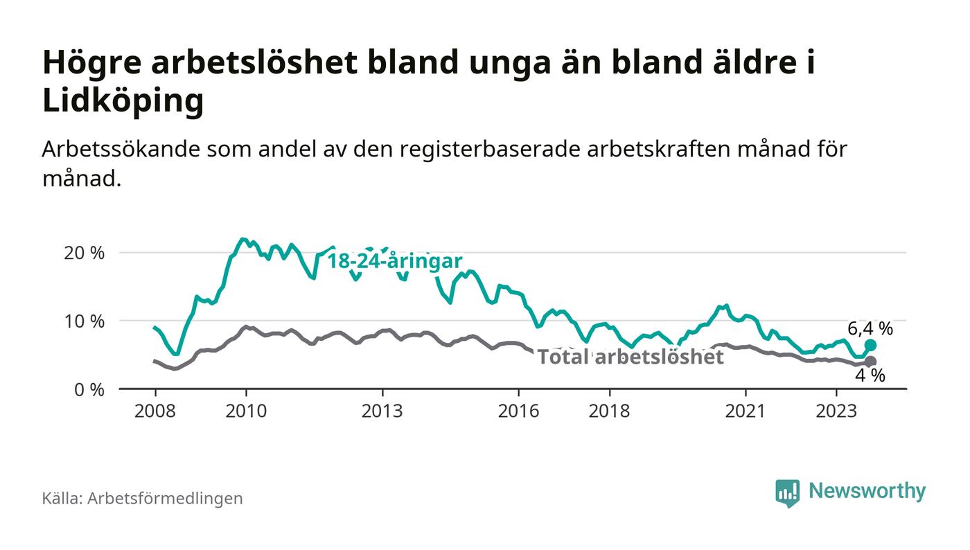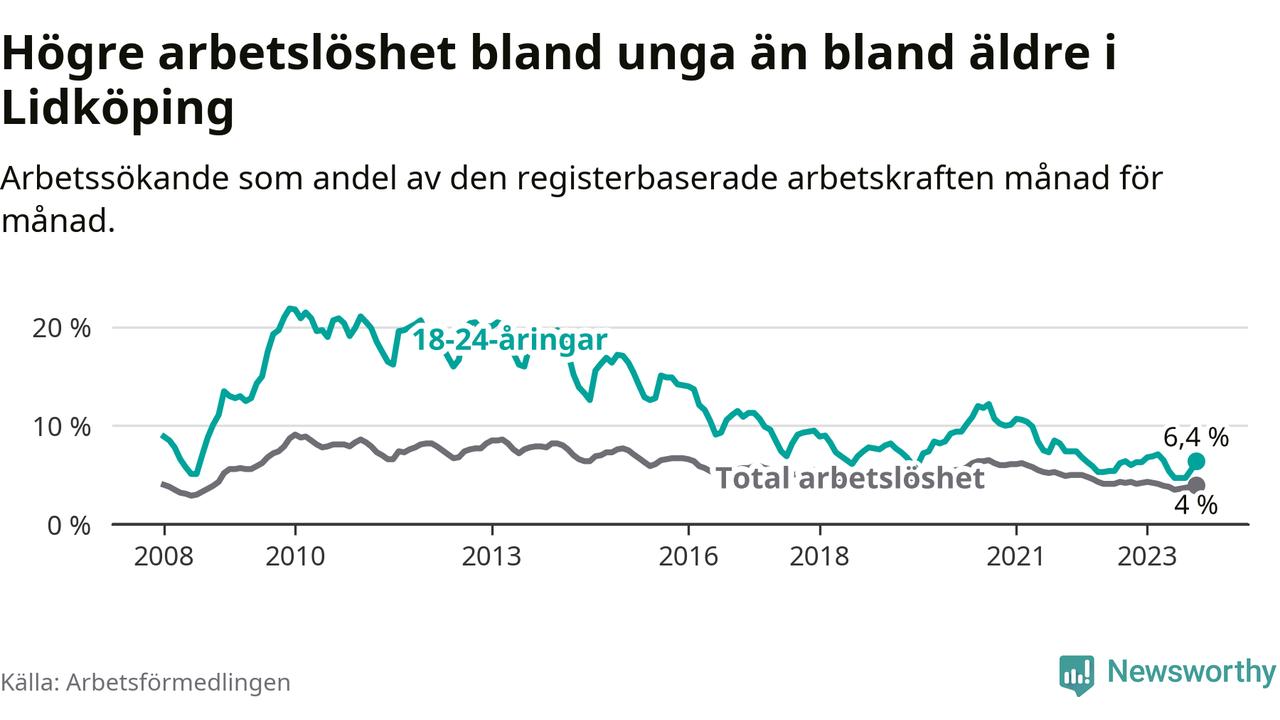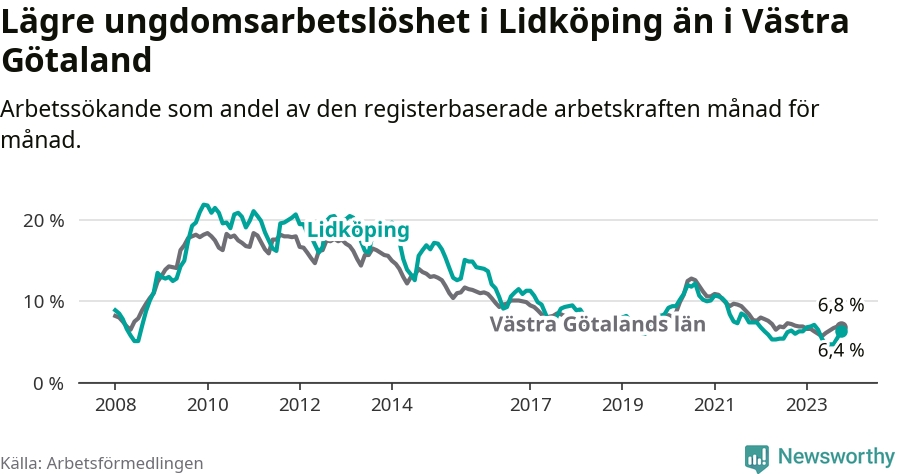 Graf: Arbetslöshet bland unga i Lidköpings kommun och Västra Götalands län