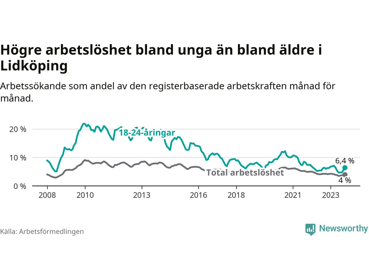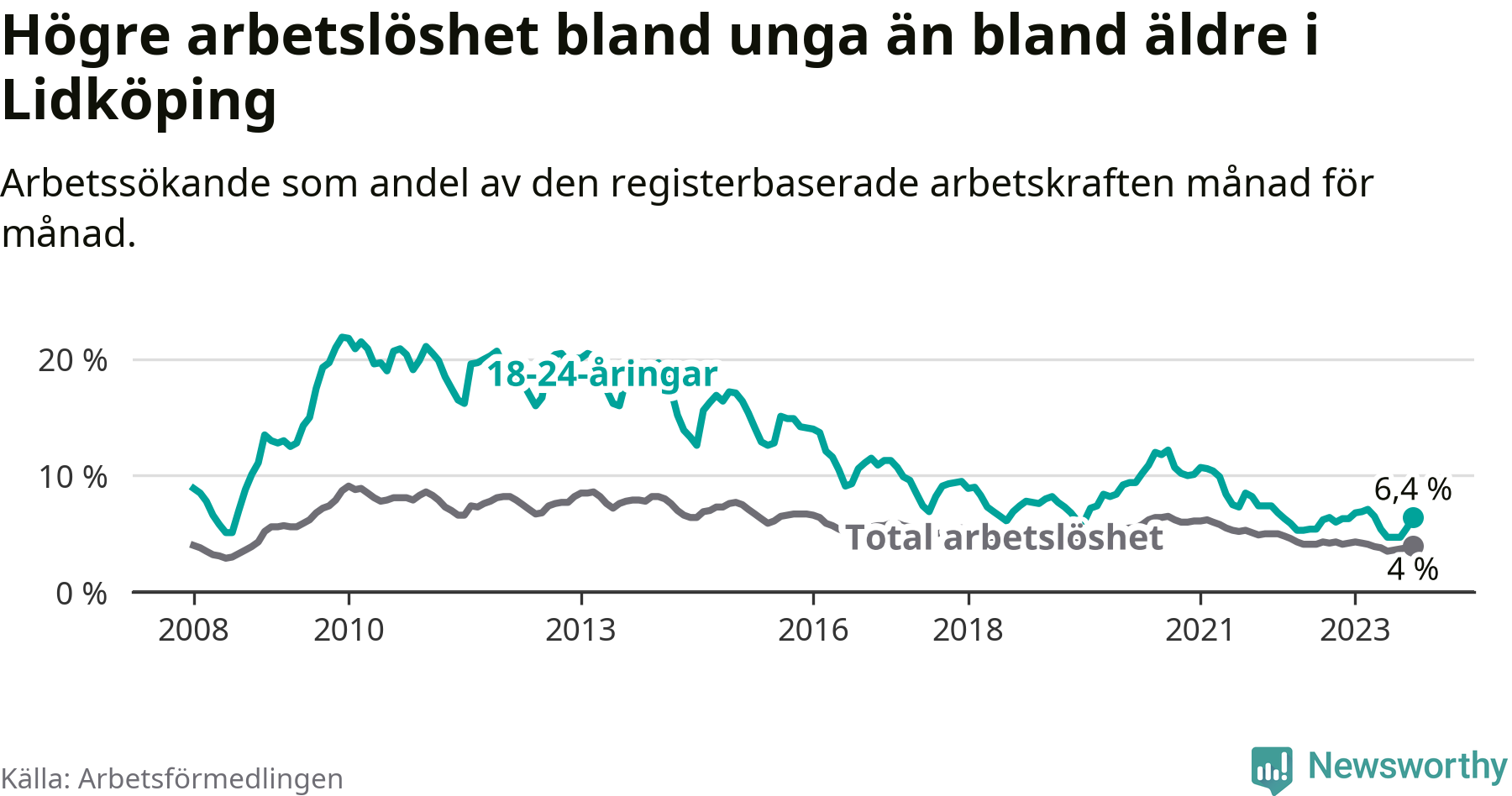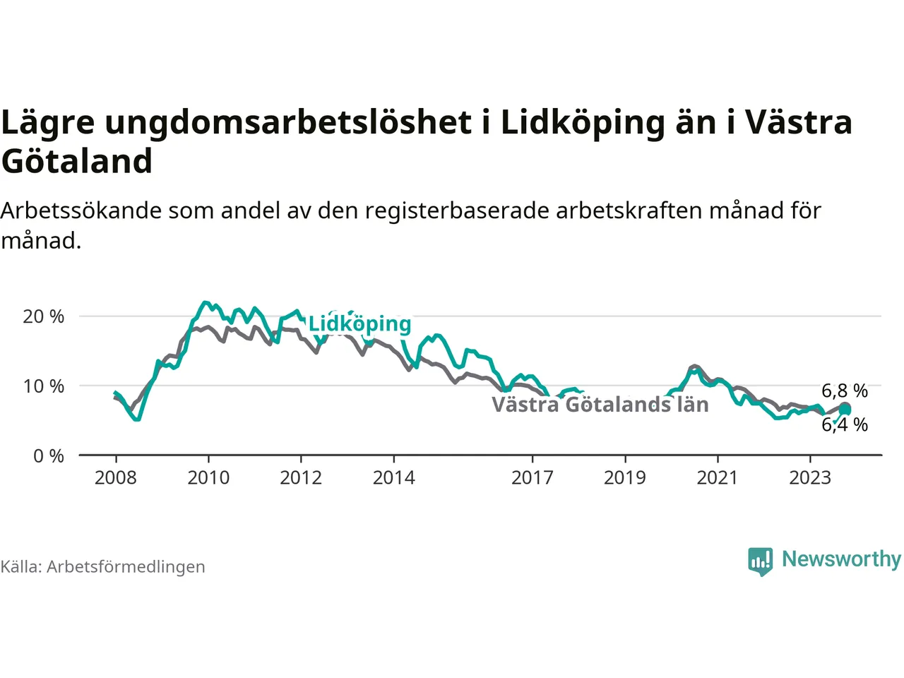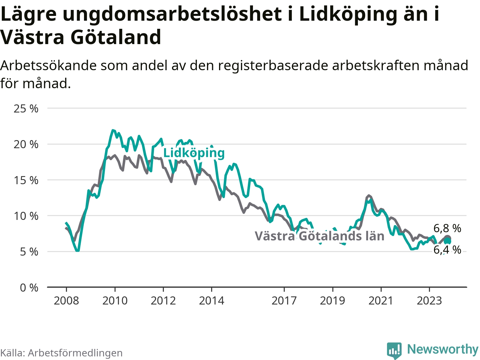 Graf: Arbetslöshet bland unga i Lidköpings kommun och Västra Götalands län