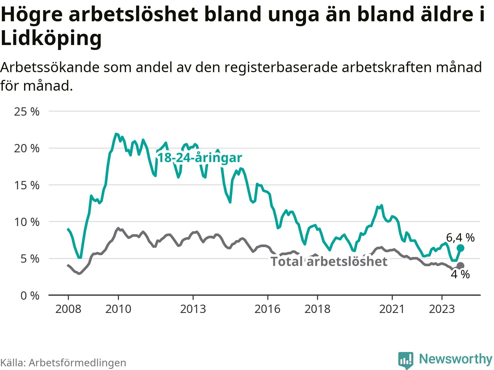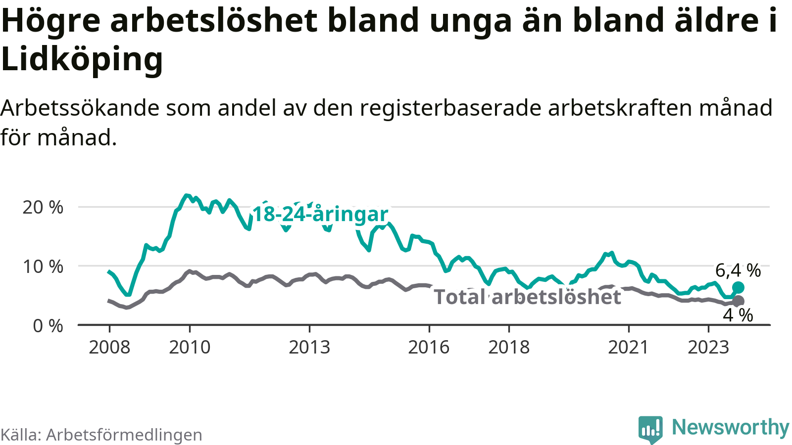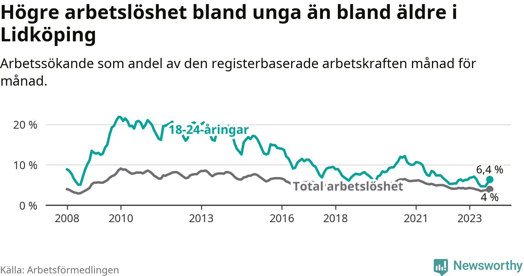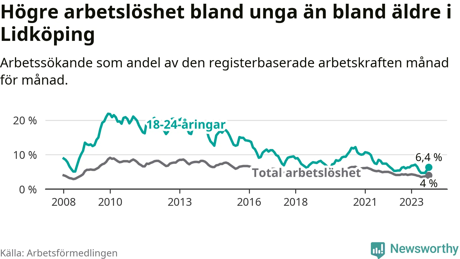 Graf: Arbetslöshet bland unga i Lidköpings kommun och Västra Götalands län