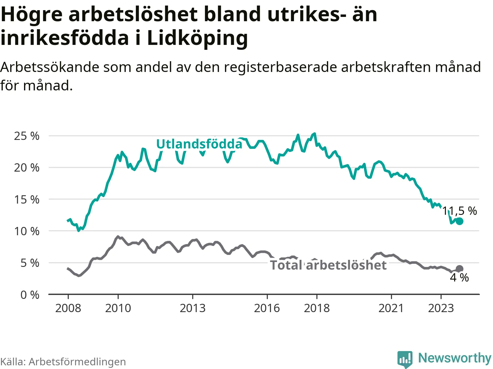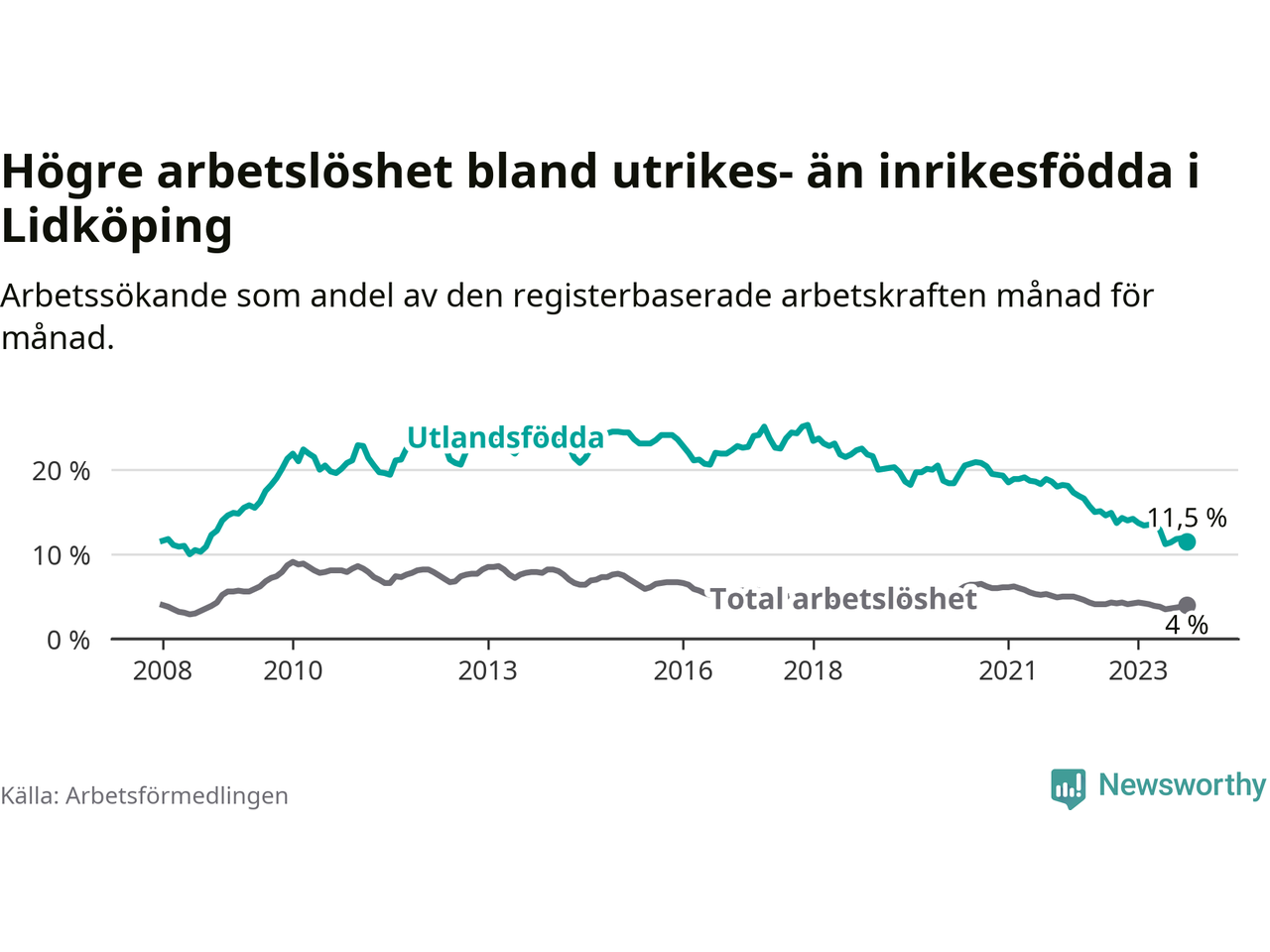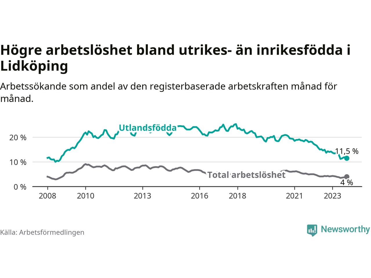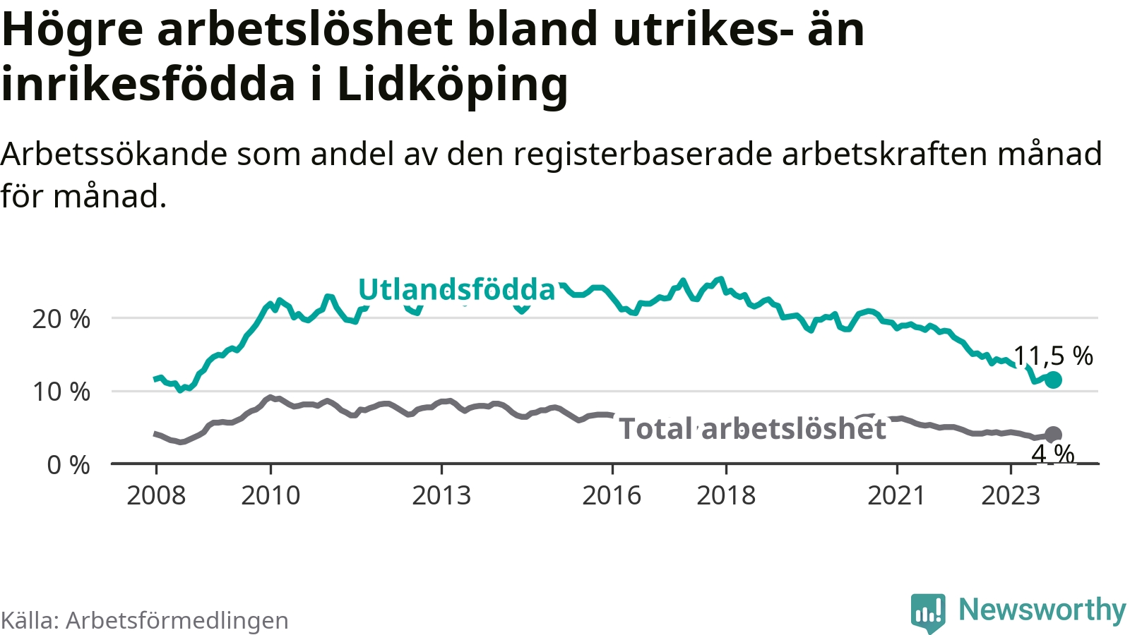 Skillnaden i arbetslöshet mellan utrikesfödda och hela befolkningen är 7,5 procentenheter i Lidköping. Det är en betydligt mindre skillnad än för ett år sedan (−2,5 procentenheter).