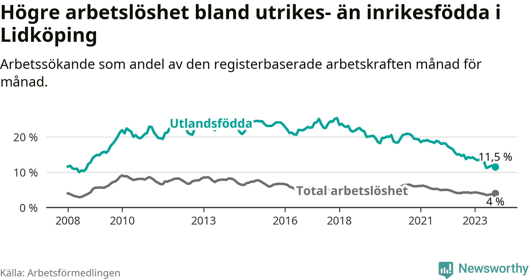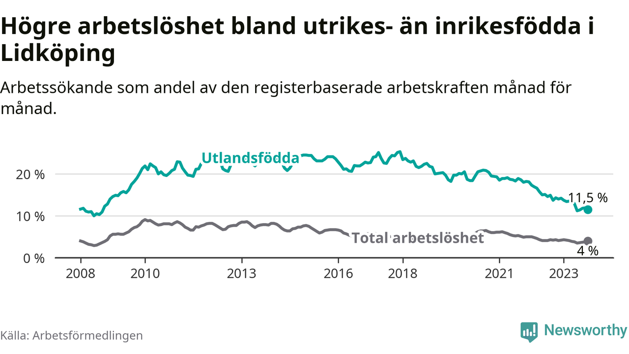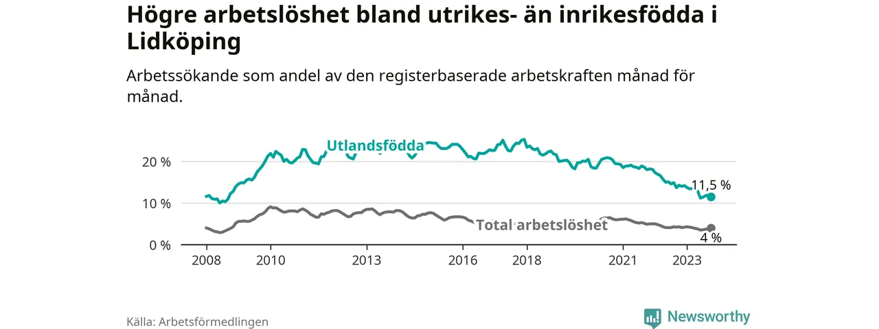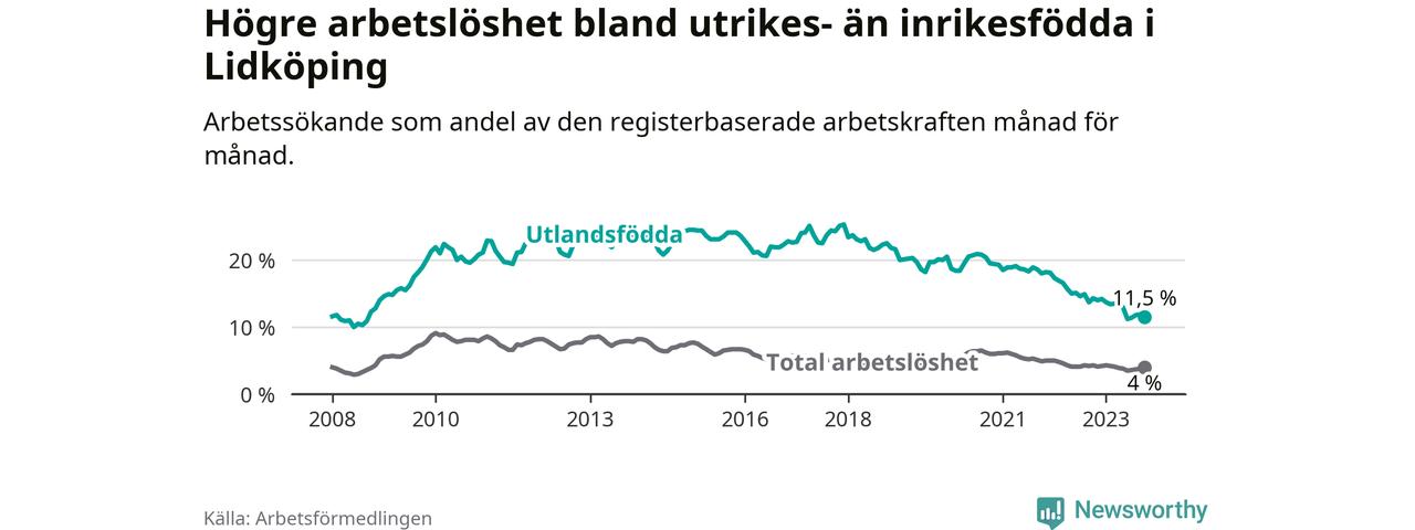 Arbetslösheten bland utlandsfödda var 11,5 procent i Lidköping under oktober månad, motsvarande 296 av 2 574 personer. Det är 2,8 procentenheter färre än vid samma tidpunkt i fjol (−57 om man räknar personer). Därmed har de utlandsföddas arbetslöshet varit lägre än vid samma tidpunkt i fjol i över två år i sträck. Sedan mars 2021 har arbetslösheten bland utlandsfödda minskat från 18,9 till 11,5 procent.