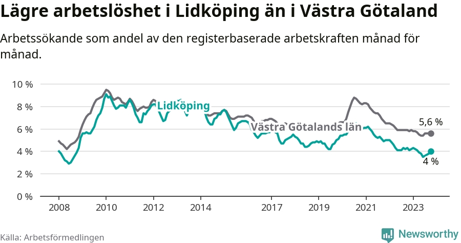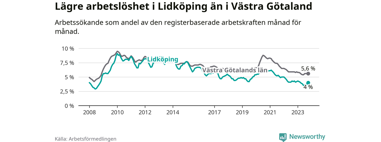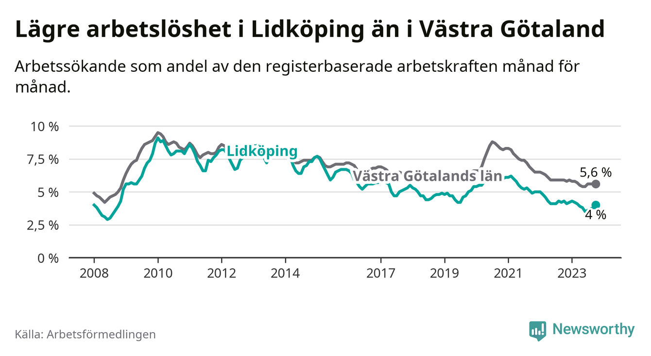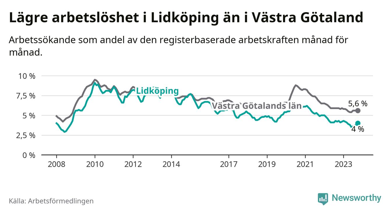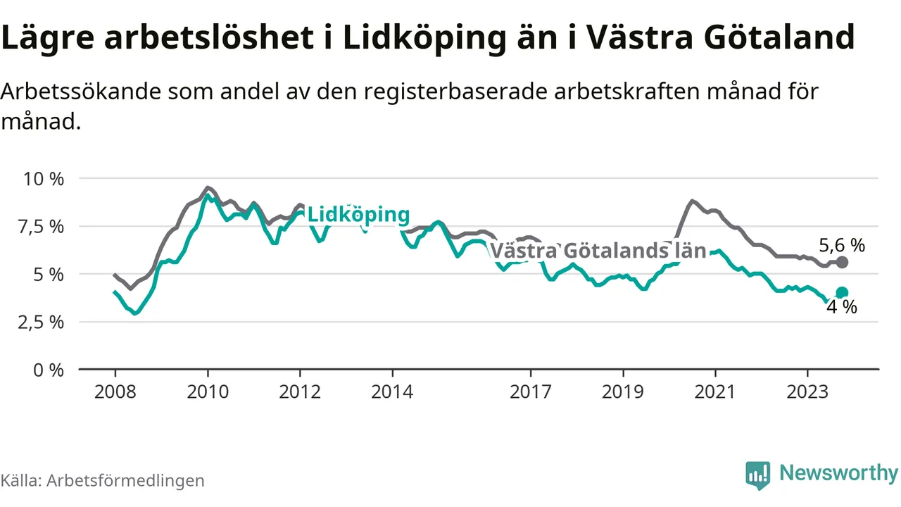 Graf: Arbetslöshet i Lidköpings kommun och Västra Götalands län