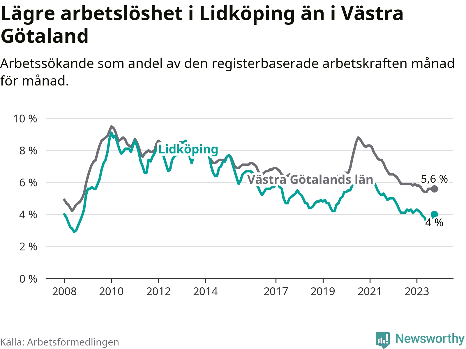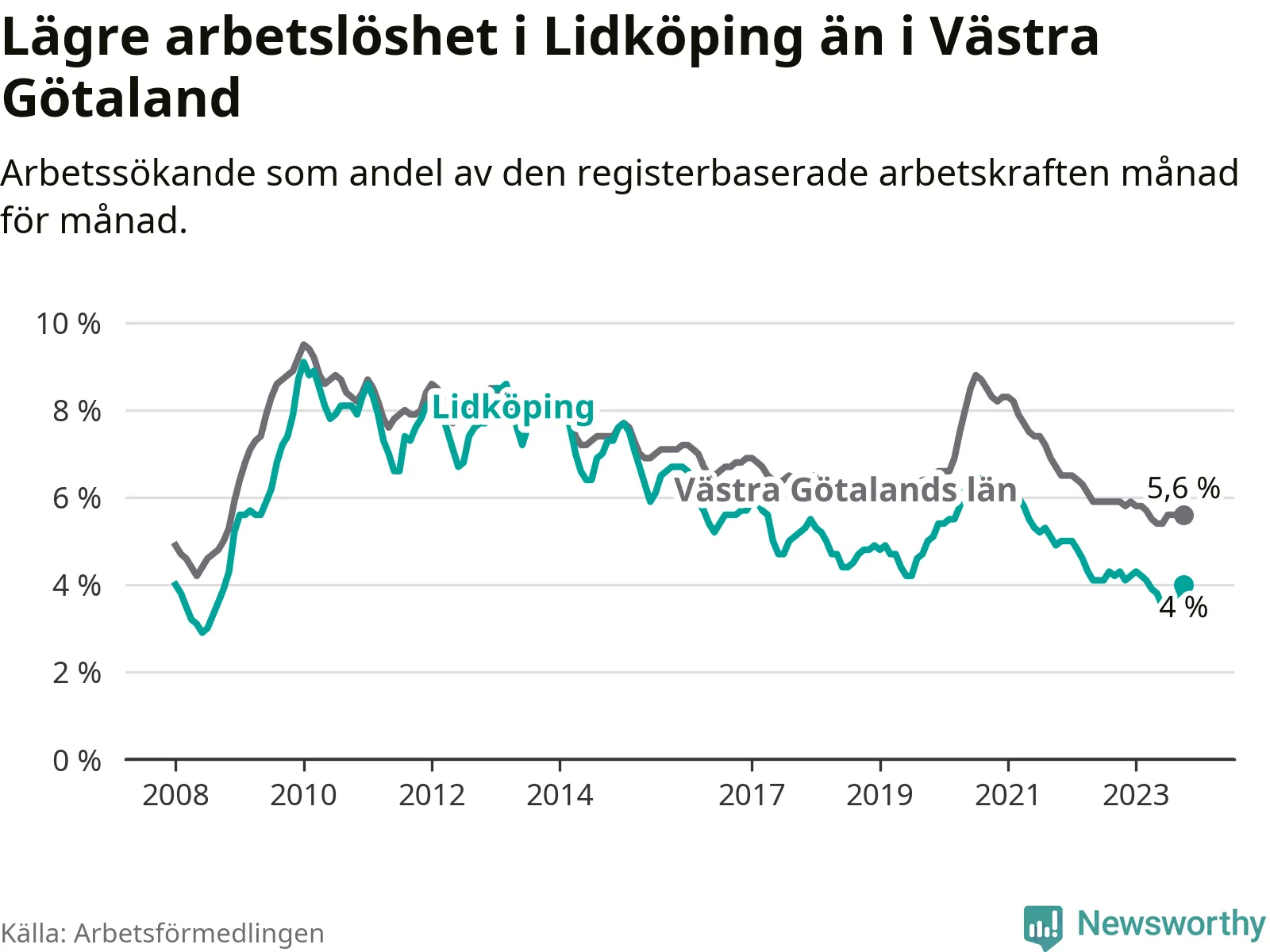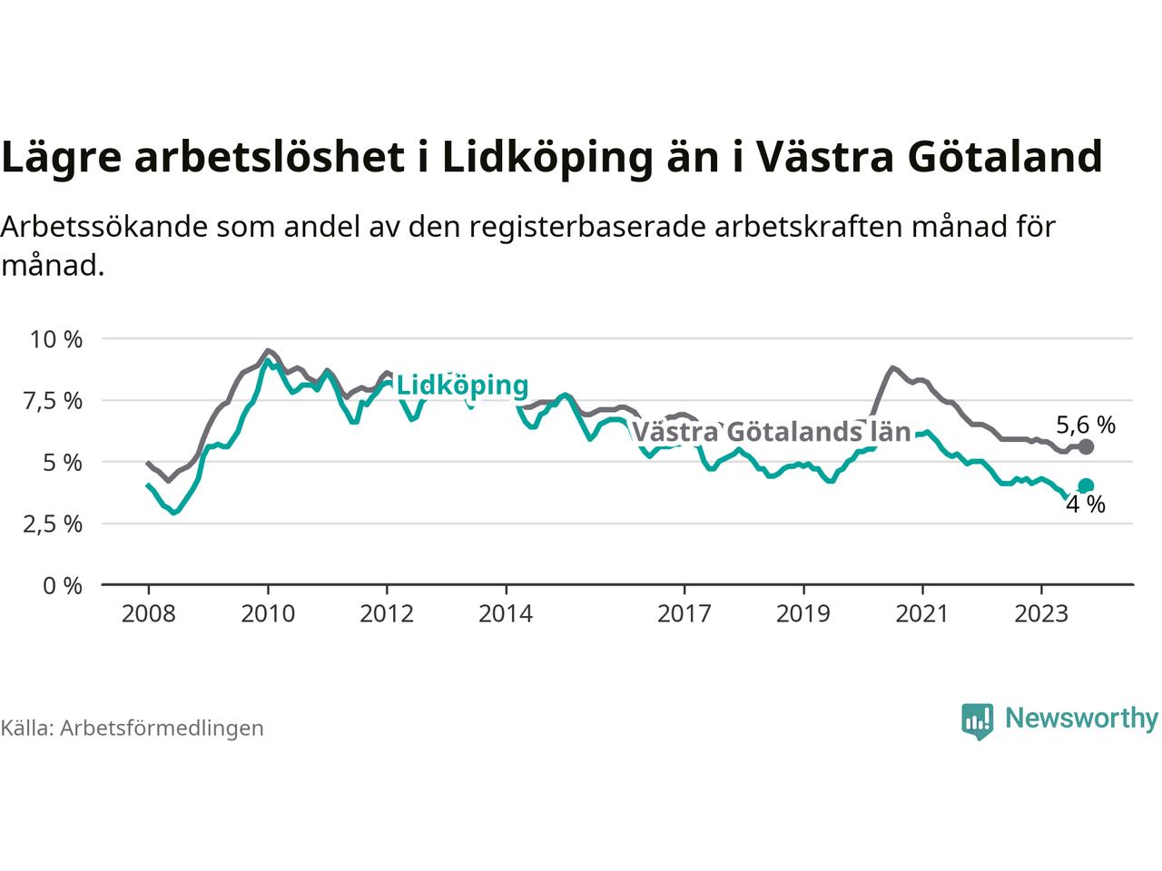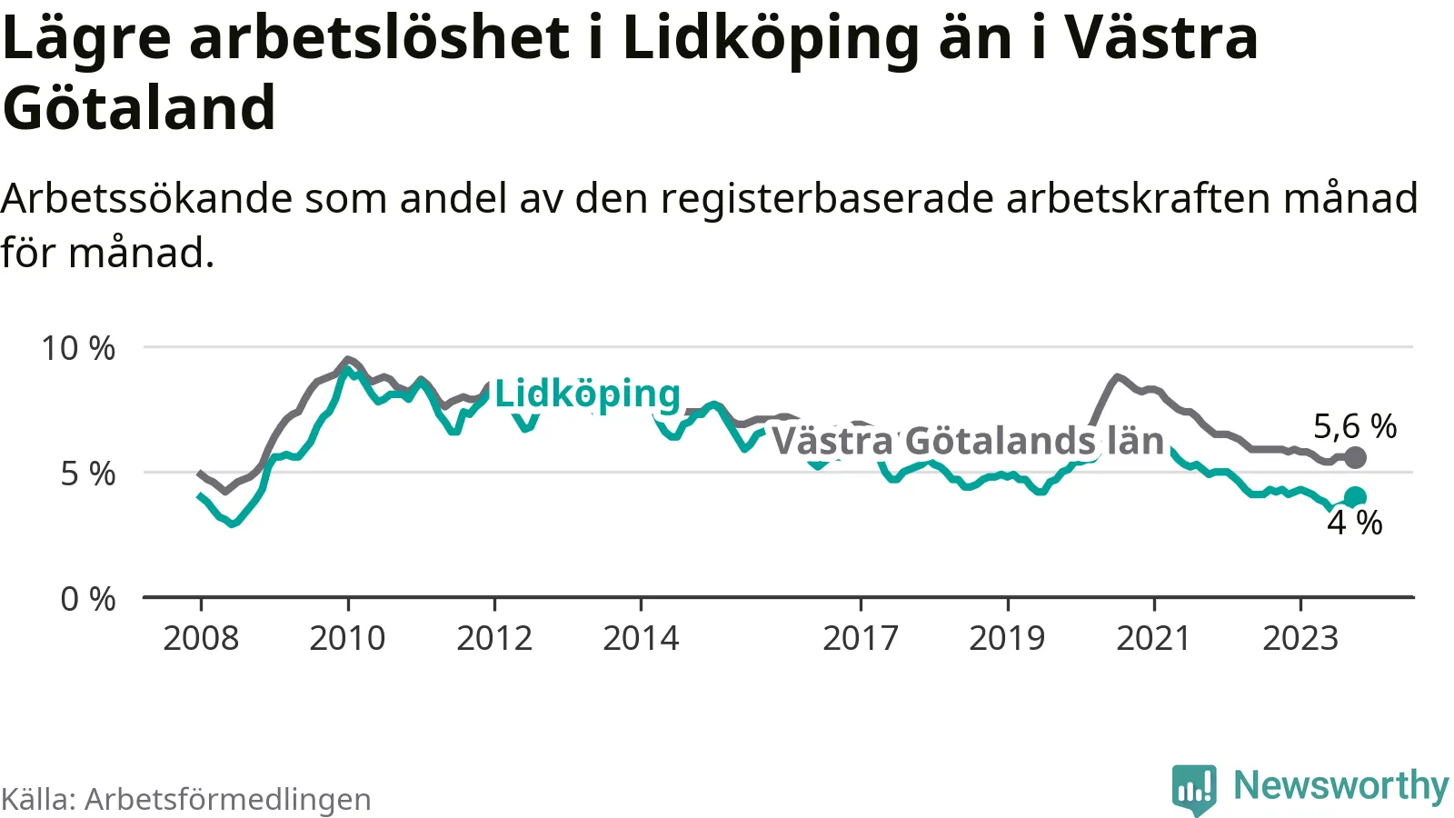 Graf: Arbetslöshet i Lidköpings kommun och Västra Götalands län