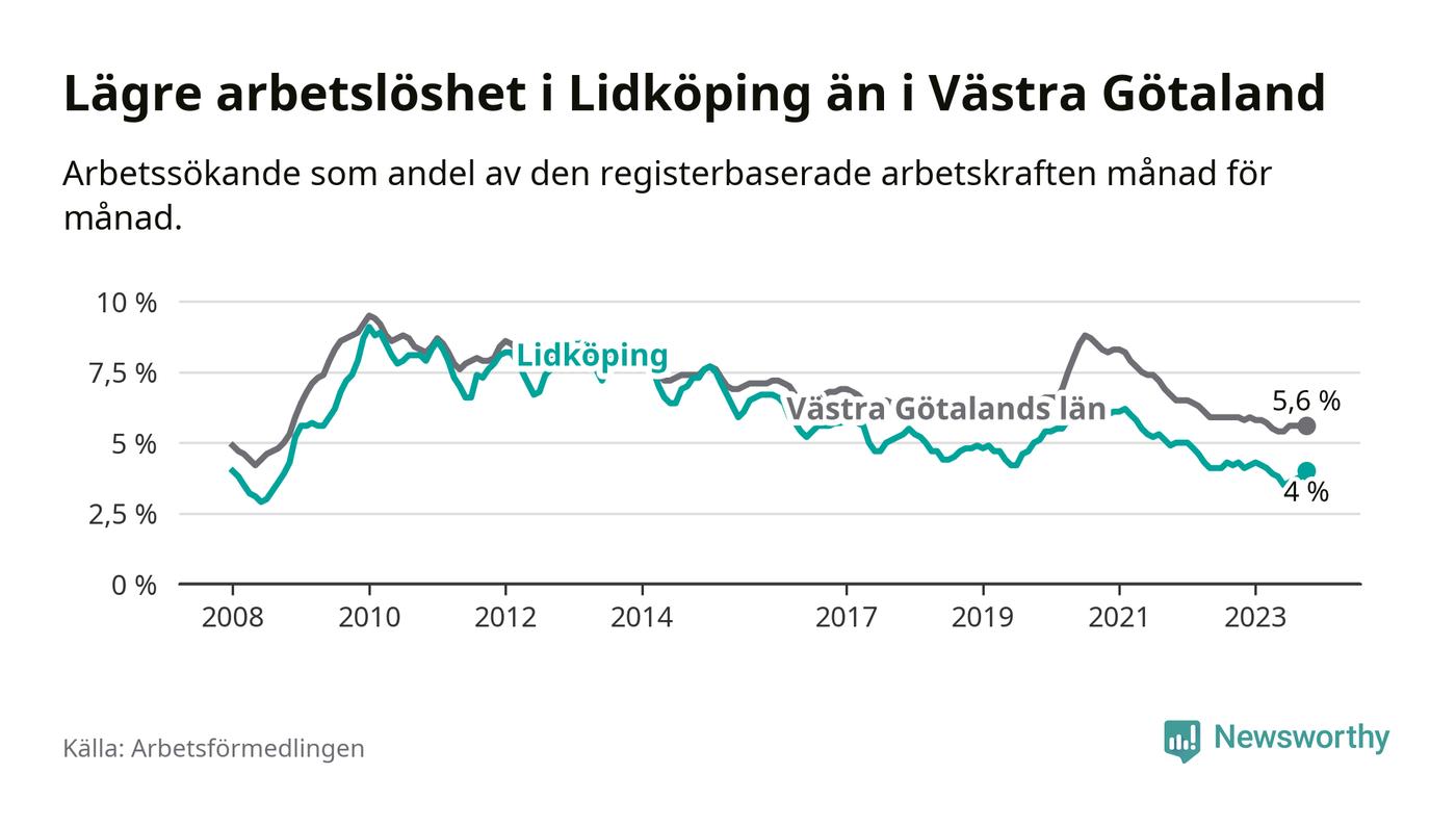 Lidköping hade redan tidigare lägre arbetslöshet än snittet i hela Västra Götalands län och nu växer klyftan (4,0 procent i kommunen, jämfört med 5,6 procent i hela länet). Öckerö har den lägsta arbetslösheten i länet (2,4 procent), medan Trollhättan har den högsta (8,4 procent). För att Lidköping skulle komma ner i samma arbetslöshetsnivå som Öckerö skulle 316 personer behöva sysselsättas.