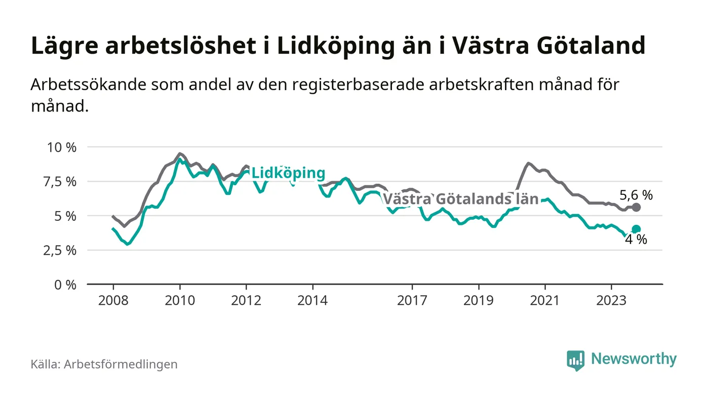 Det är 30:e månaden i följd som arbetslösheten i Lidköping är lägre än den var under samma tidpunkt året innan. Sedan april 2021 har arbetslösheten gått ner från 5,8 till 4,0 procent.