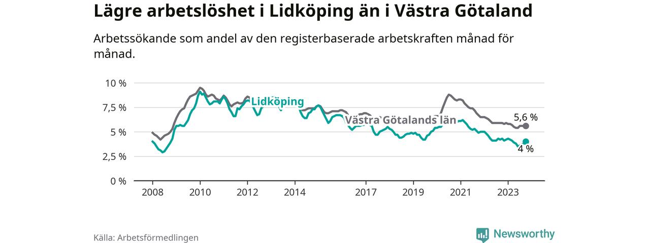 Under oktober månad rapporterade Lidköpings kommun en total arbetslöshet på 4,0 procent. Det är en minskning jämfört med samma tidpunkt i fjol (−0,3 procentenheter). Även i Västra Götalands län sjunker arbetslösheten .