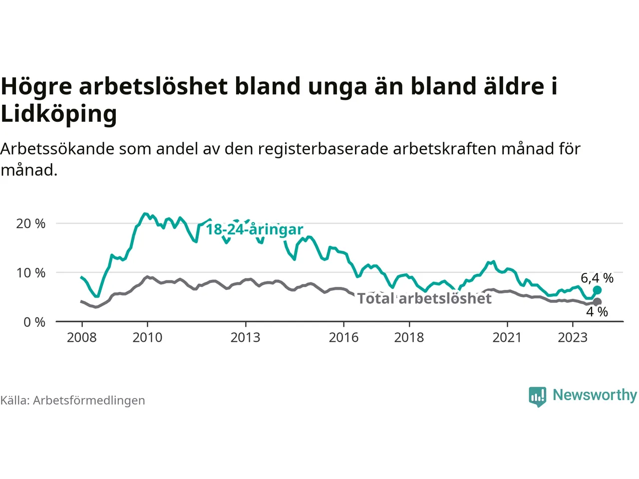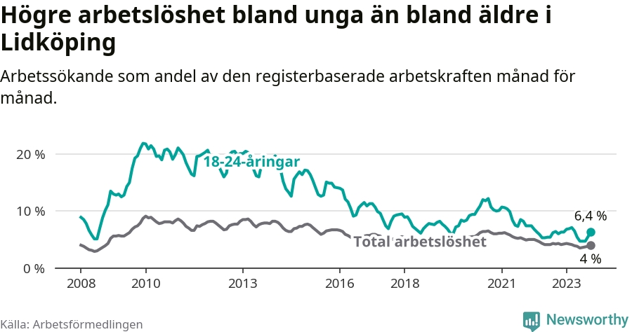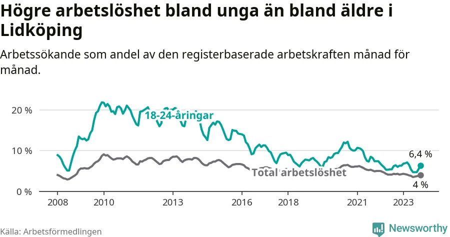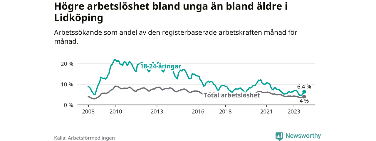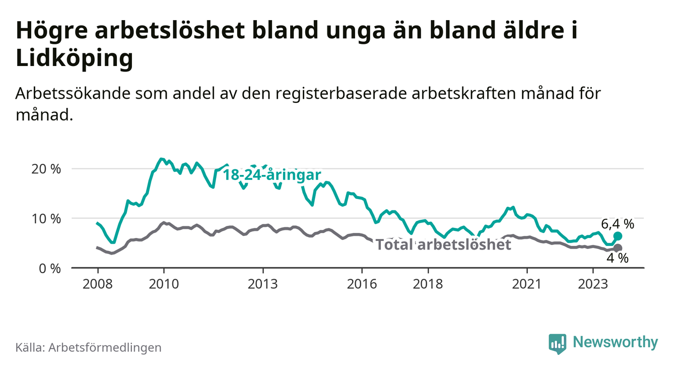 Till skillnad från den totala arbetslösheten stiger arbetslösheten bland unga (+0,4 procentenheter). I oktober var 6,4 procent av 18–24-åringarna inskrivna som arbetssökande (motsvarande 134 personer). Mäter vi antalet inskrivna ser vi en ökning med 16 personer på ett års sikt.