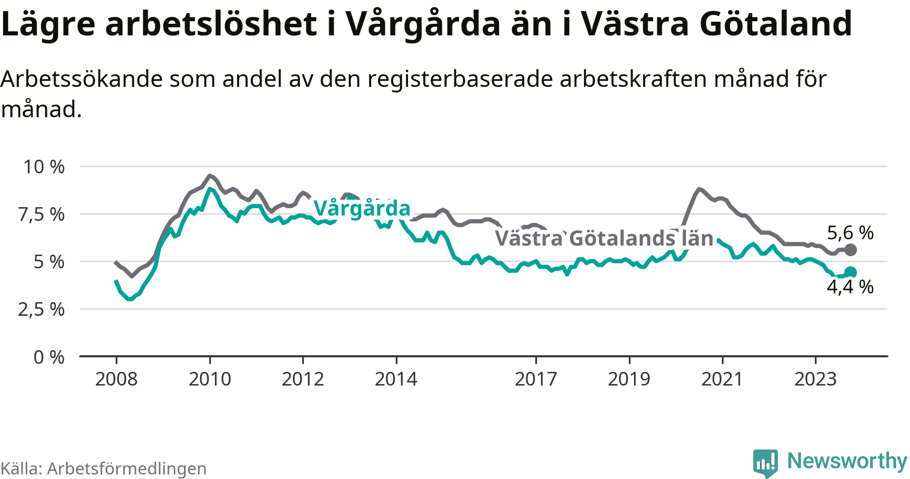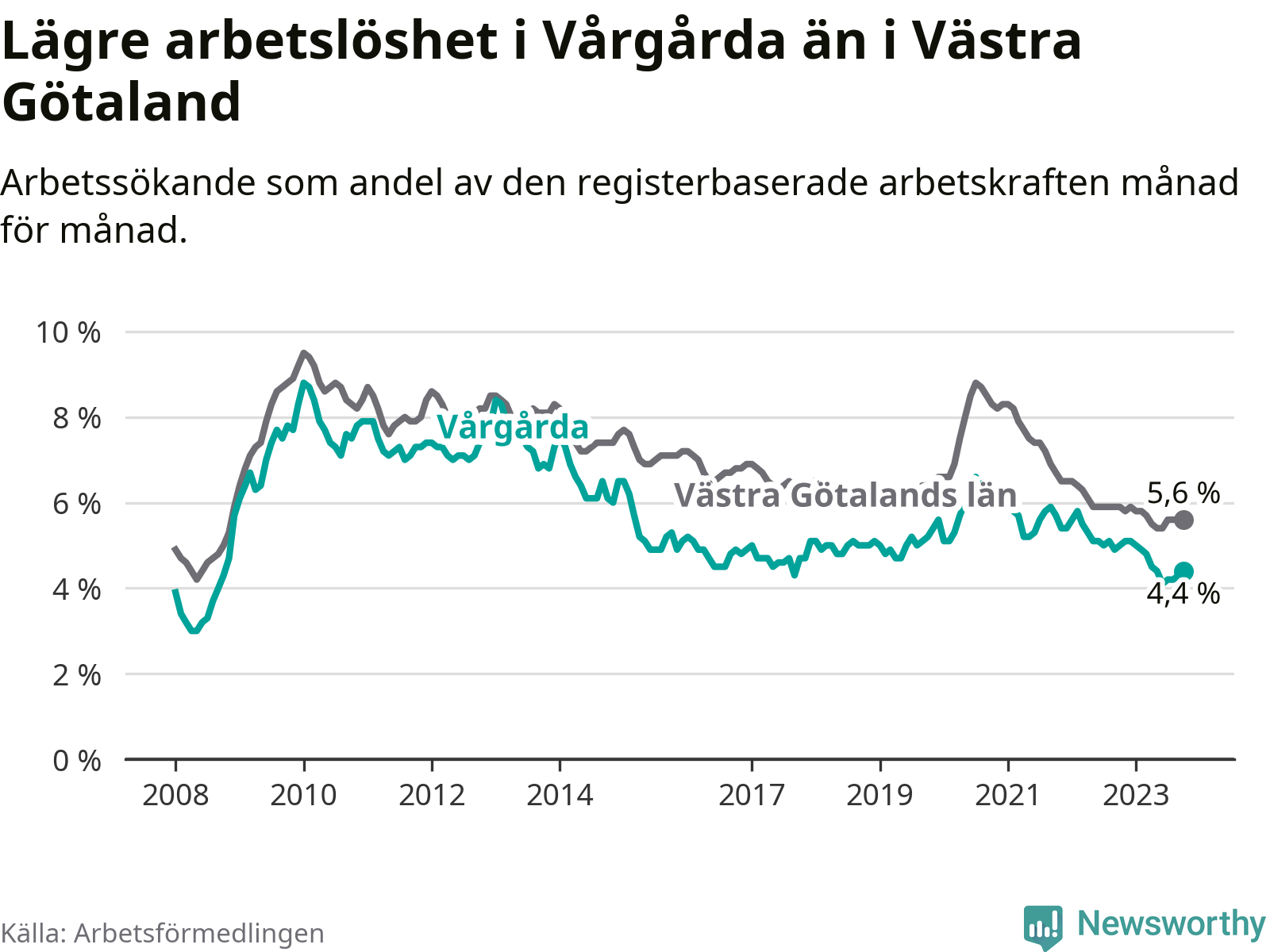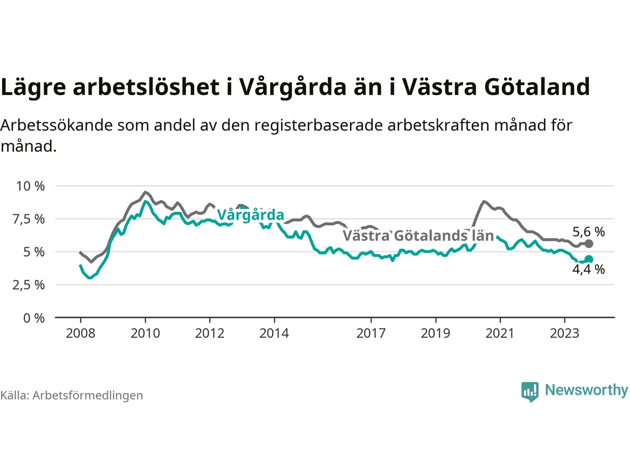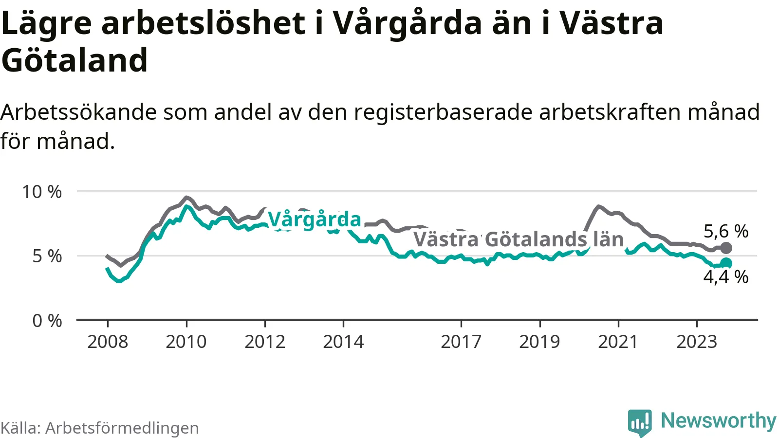 Graf: Arbetslöshet i Vårgårda kommun och Västra Götalands län