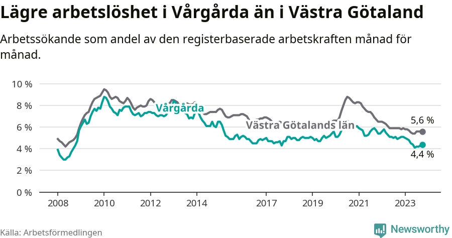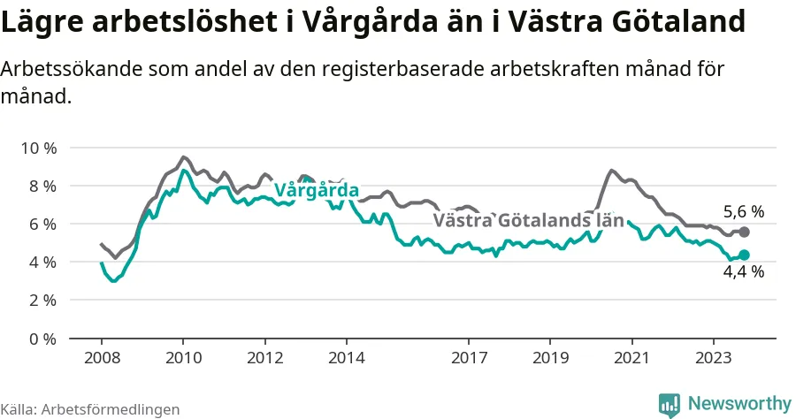 Under oktober månad rapporterade Vårgårda kommun en total arbetslöshet på 4,4 procent. Det är en minskning jämfört med samma tidpunkt i fjol (−0,6 procentenheter). Även i Västra Götalands län sjunker arbetslösheten .