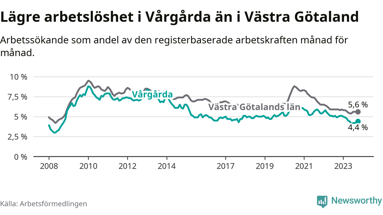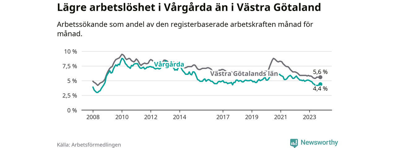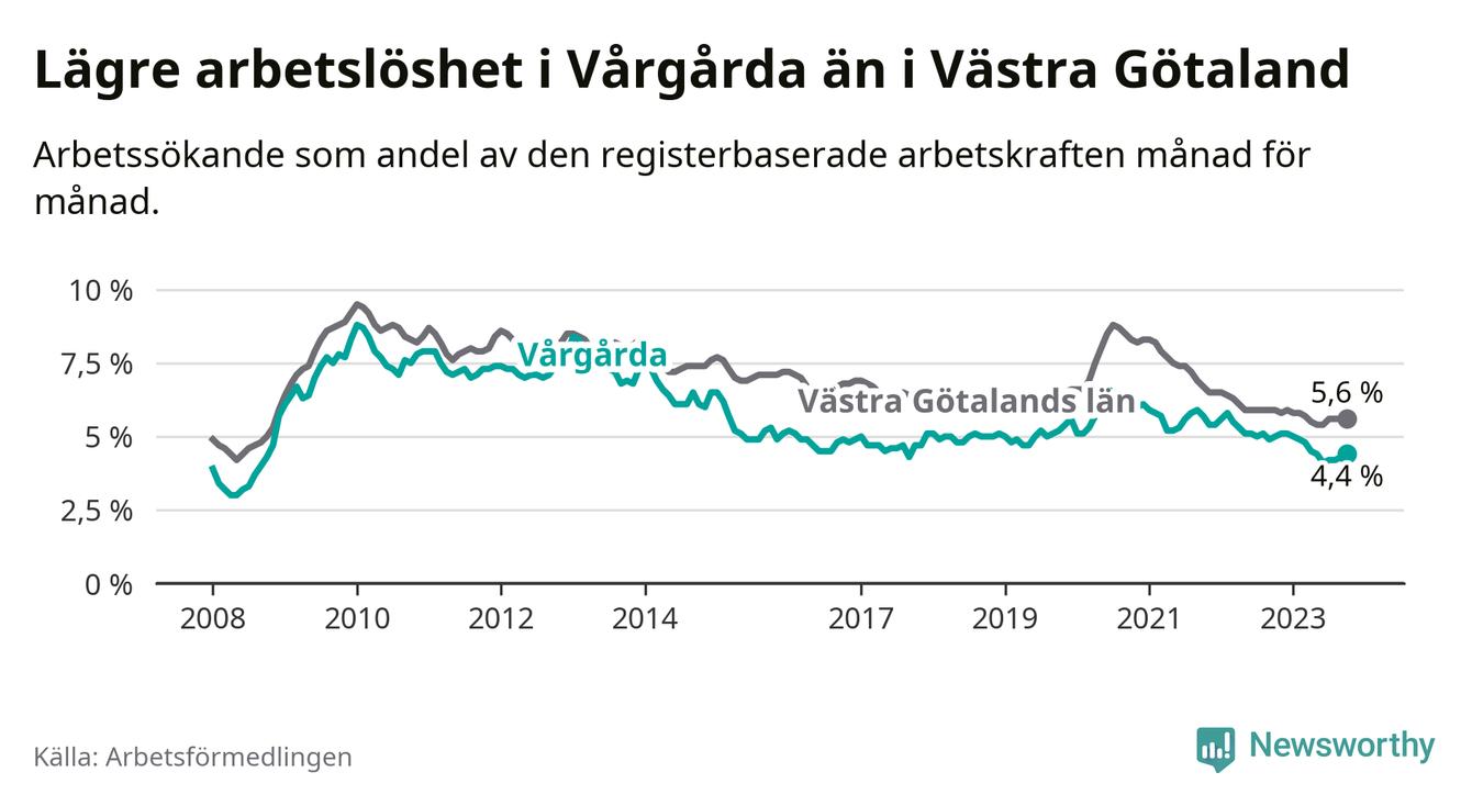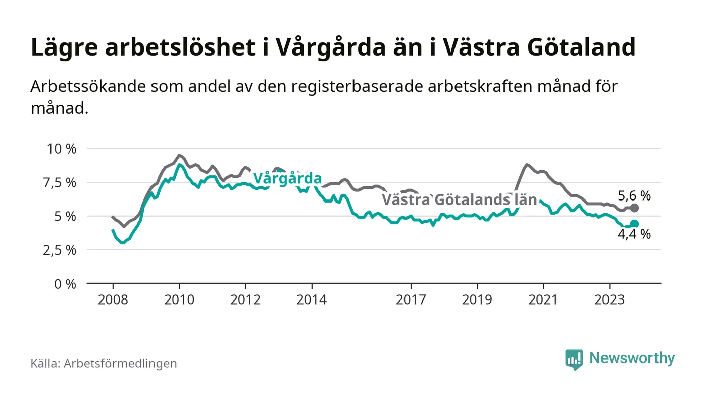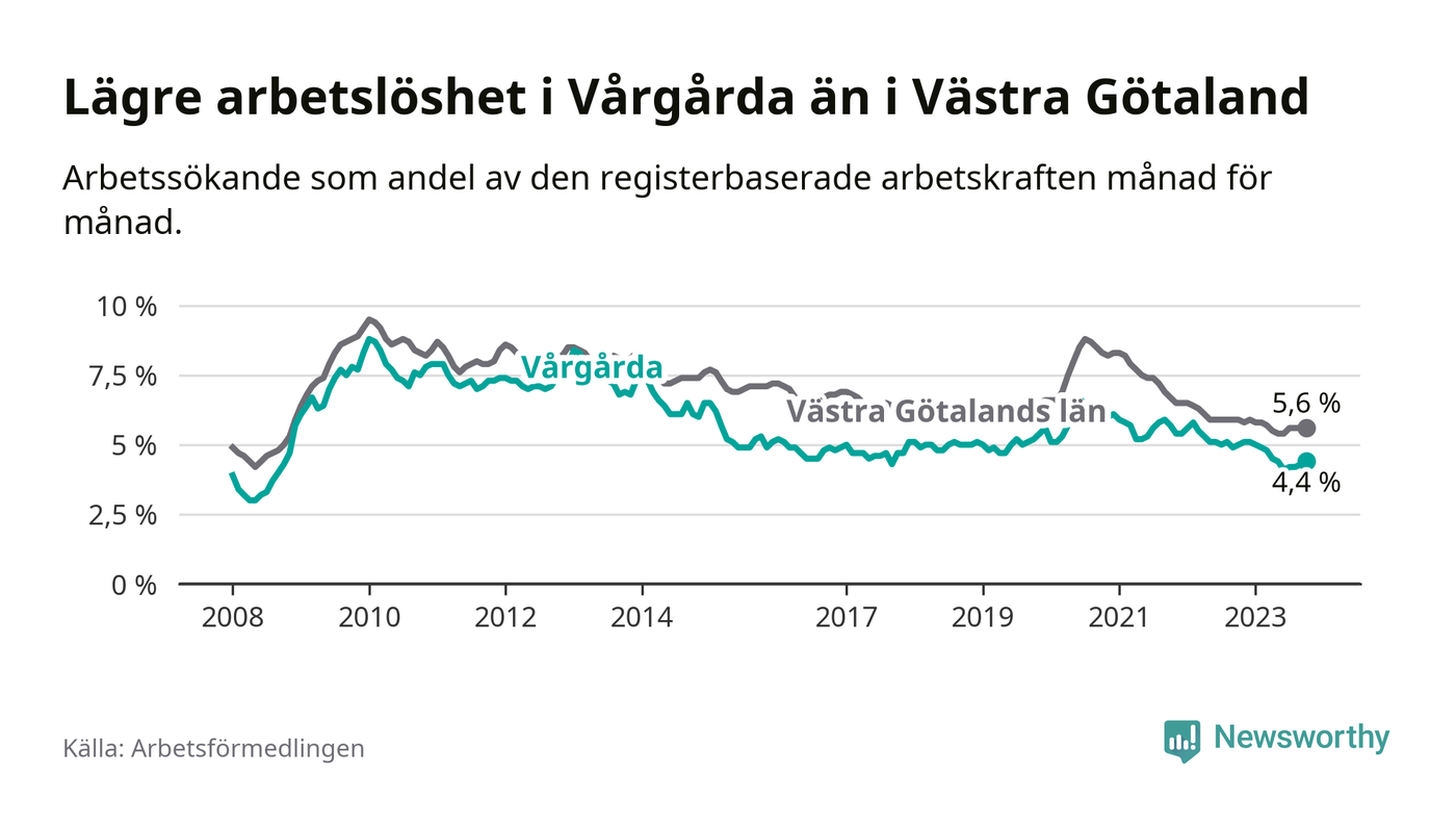 Vårgårda hade redan tidigare lägre arbetslöshet än snittet i hela Västra Götalands län och nu växer klyftan (4,4 procent i kommunen, jämfört med 5,6 procent i hela länet). Öckerö har den lägsta arbetslösheten i länet (2,4 procent), medan Trollhättan har den högsta (8,4 procent). För att Vårgårda skulle komma ner i samma arbetslöshetsnivå som Öckerö skulle 122 personer behöva sysselsättas.