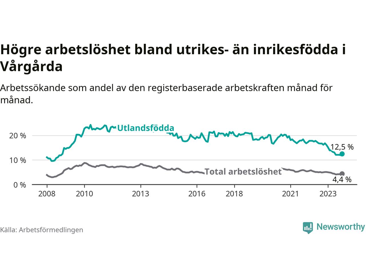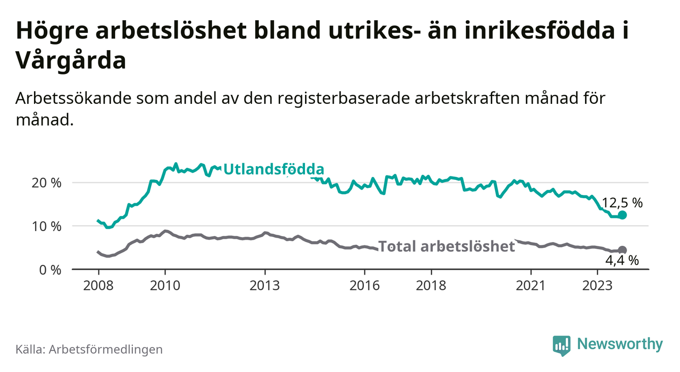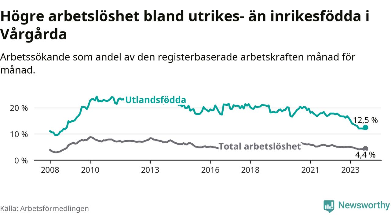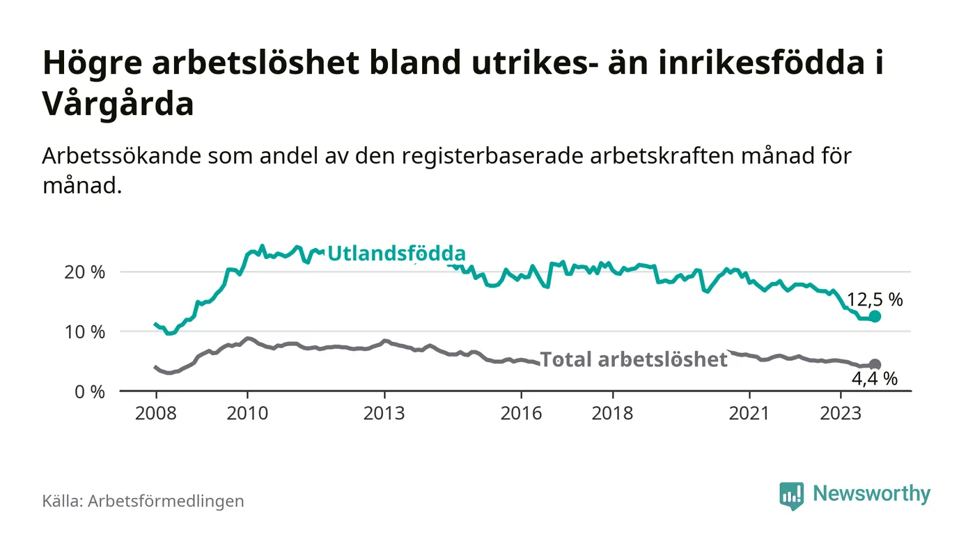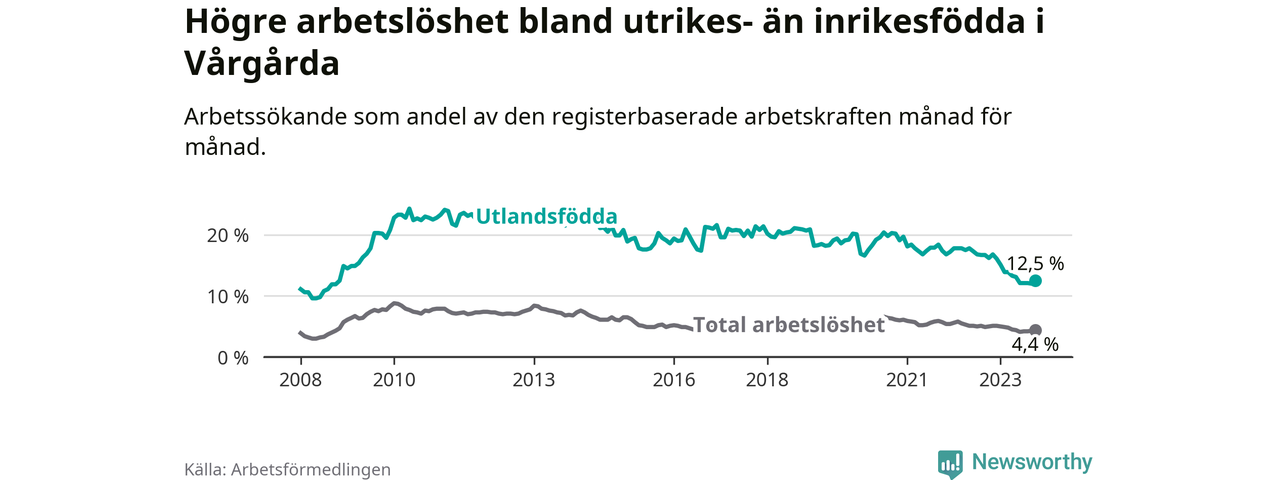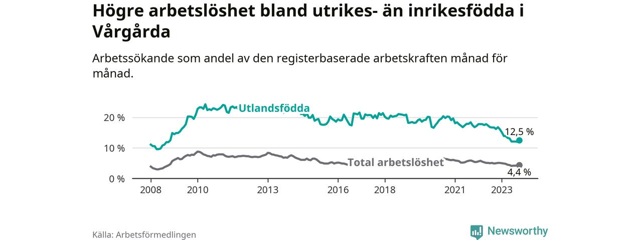 Arbetslösheten bland utlandsfödda var 12,5 procent i Vårgårda under oktober månad, motsvarande 132 av 1 056 personer. Det är 3,7 procentenheter färre än vid samma tidpunkt i fjol (−26 om man räknar personer). Därmed är de utlandsföddas arbetslöshet lägre än vid samma tidpunkt i fjol för elfte månaden i följd. Sedan november 2022 har arbetslösheten bland utlandsfödda minskat från 16,8 till 12,5 procent.