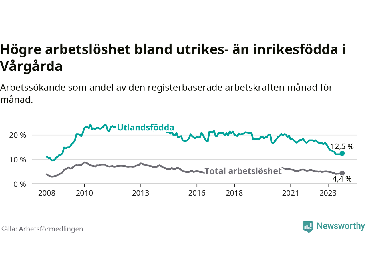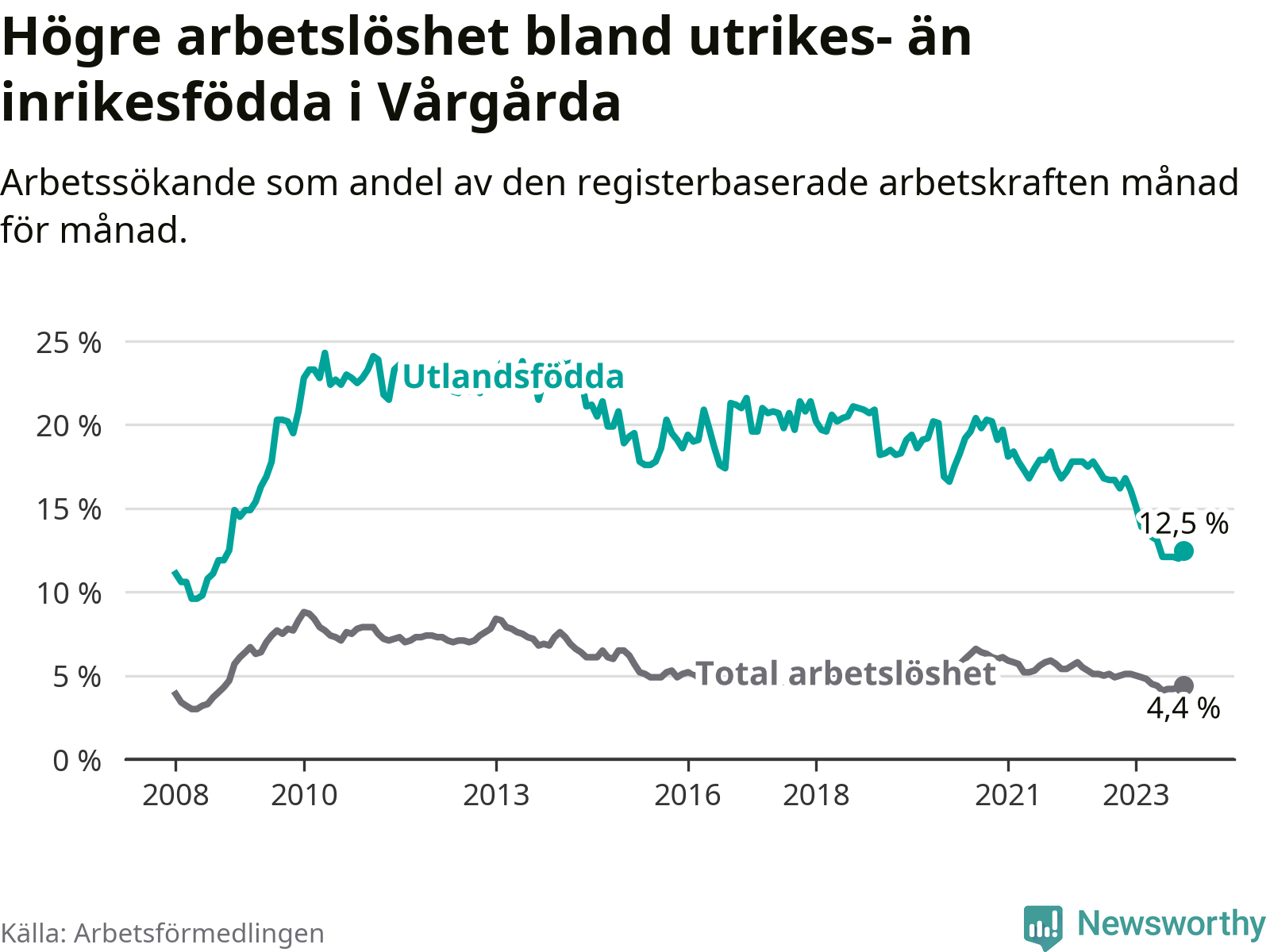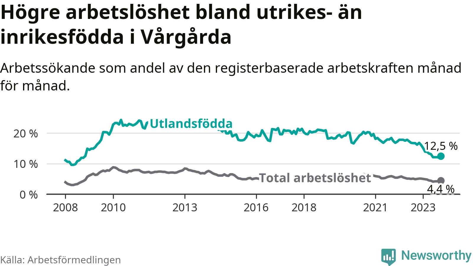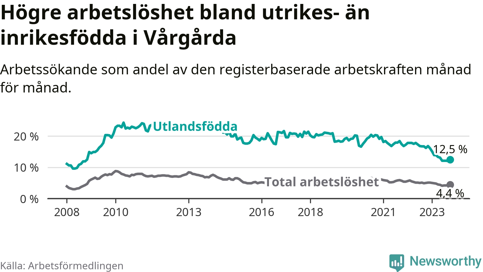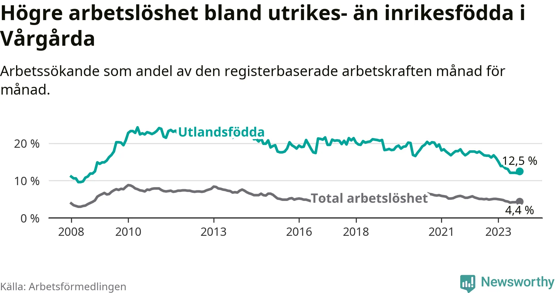Arbetslösheten bland utlandsfödda var 12,5 procent i Vårgårda under oktober månad, motsvarande 132 av 1 056 personer. Det är 3,7 procentenheter färre än vid samma tidpunkt i fjol (−26 om man räknar personer). Därmed är de utlandsföddas arbetslöshet lägre än vid samma tidpunkt i fjol för elfte månaden i följd. Sedan november 2022 har arbetslösheten bland utlandsfödda minskat från 16,8 till 12,5 procent.