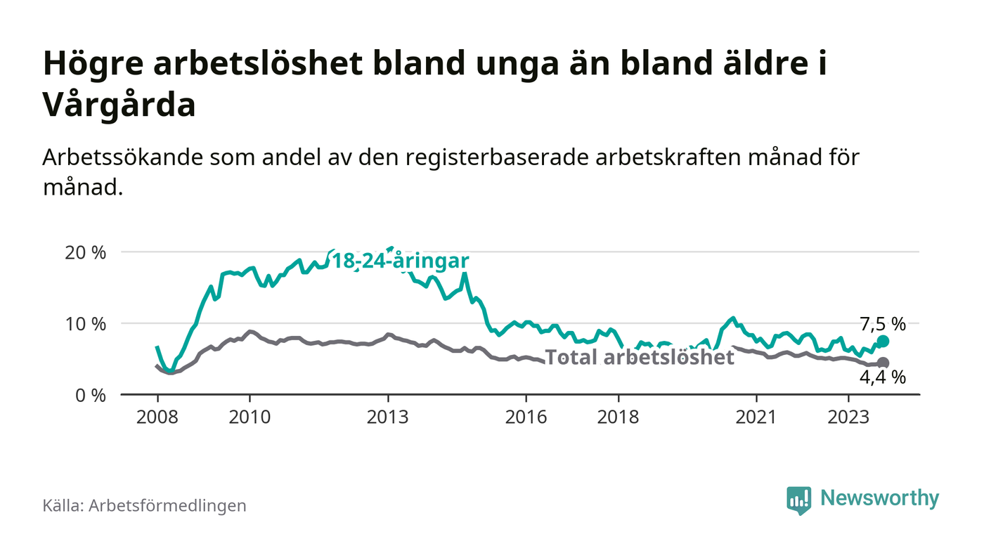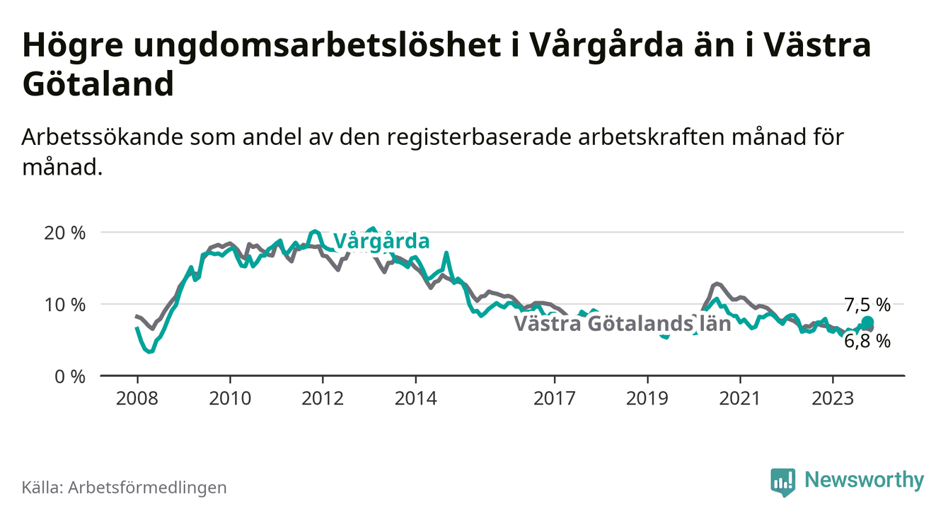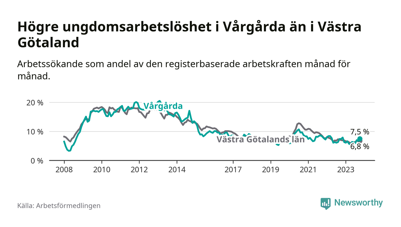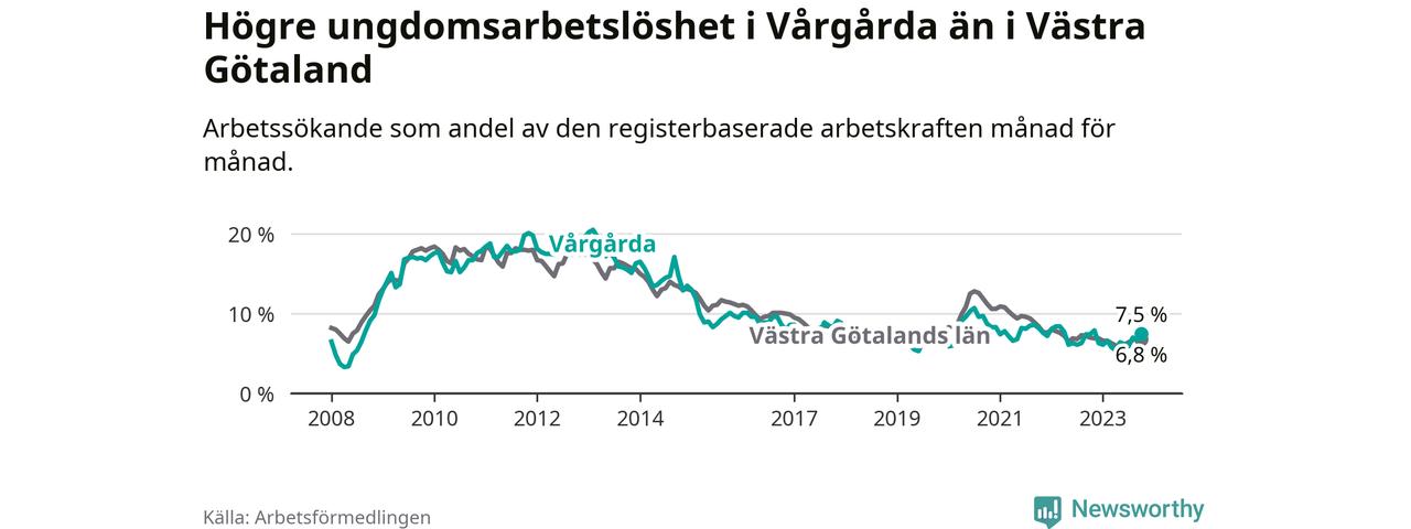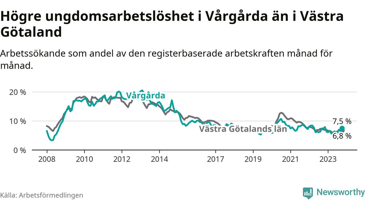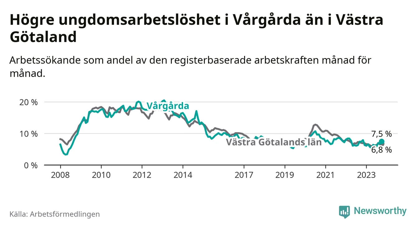 Medan Vårgårda har lägre total arbetslöshet än Västra Götaland, ligger ungdomsarbetslösheten 0,7 procentenheter högre i Vårgårda.