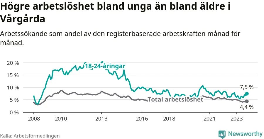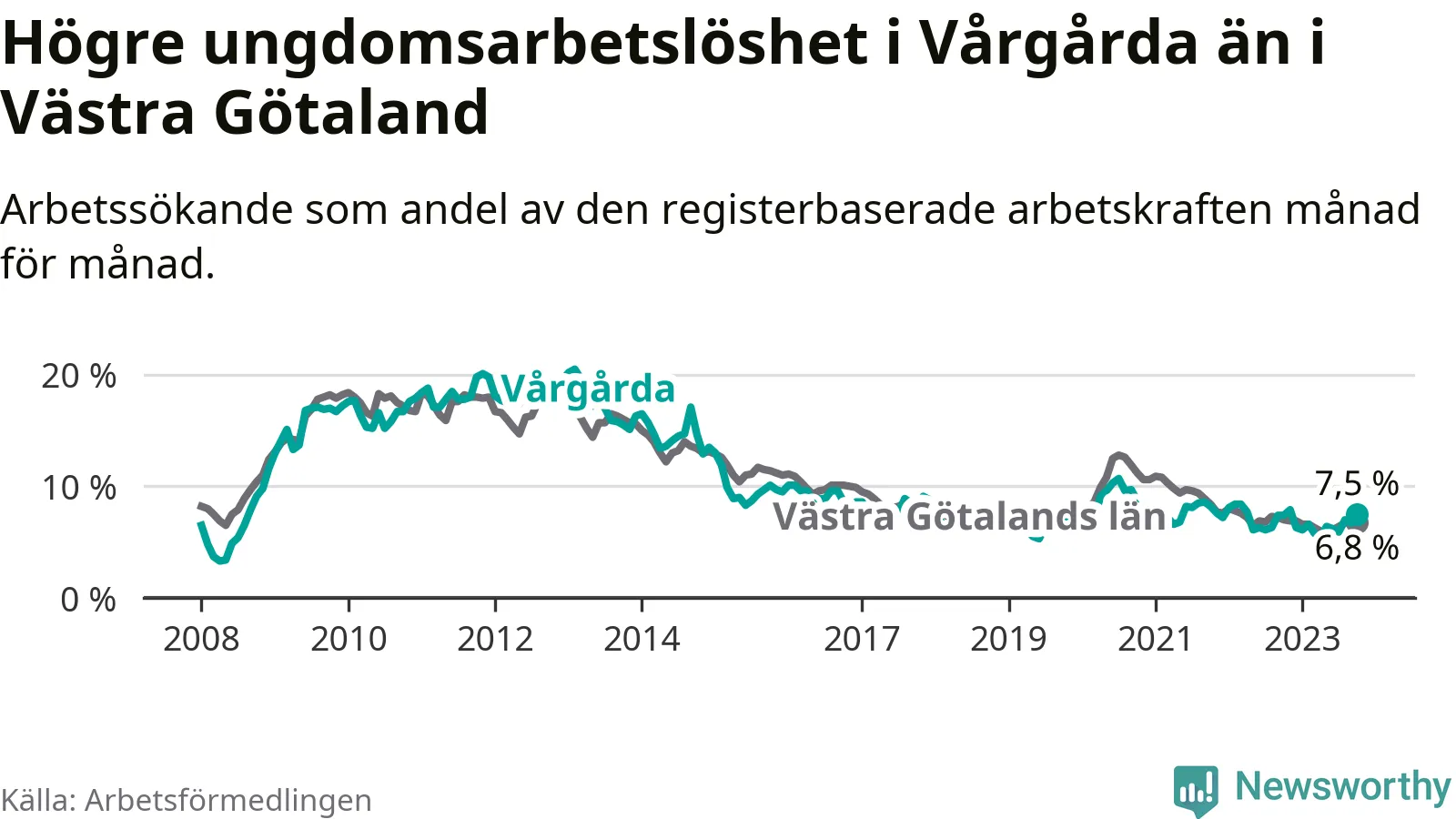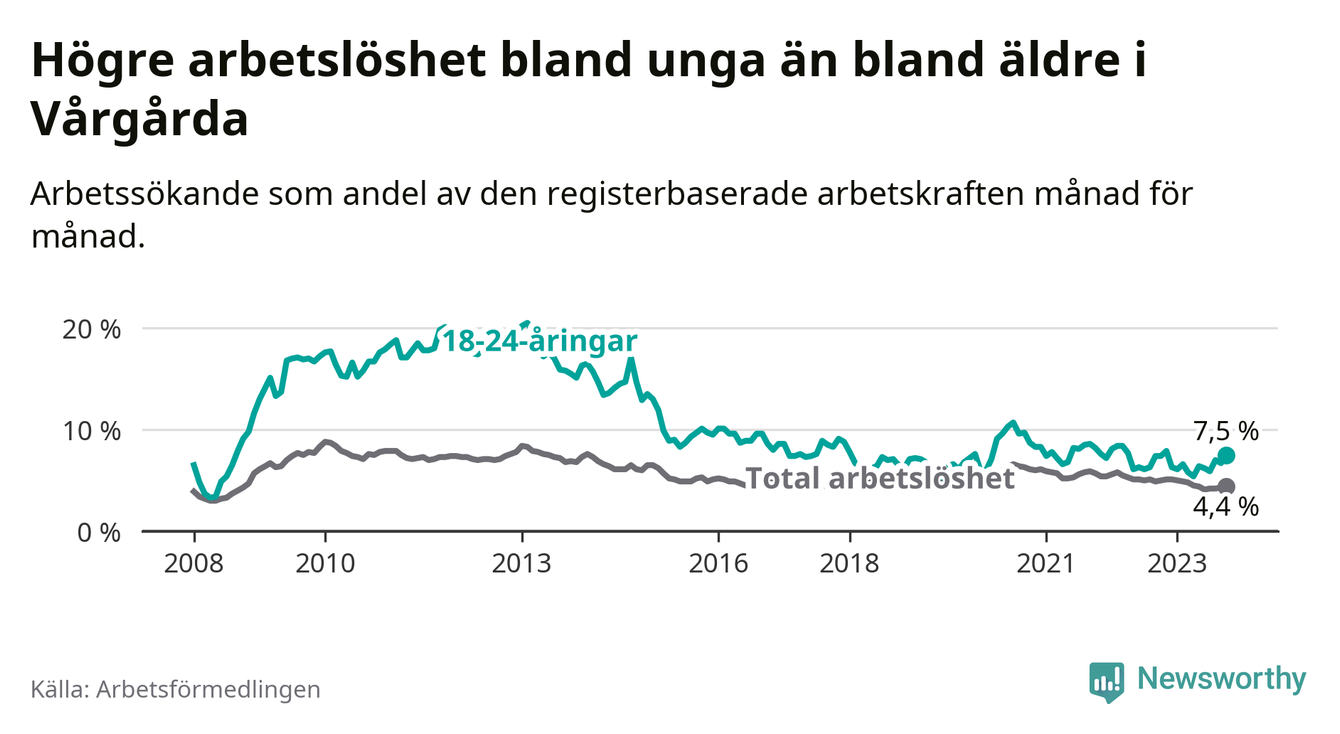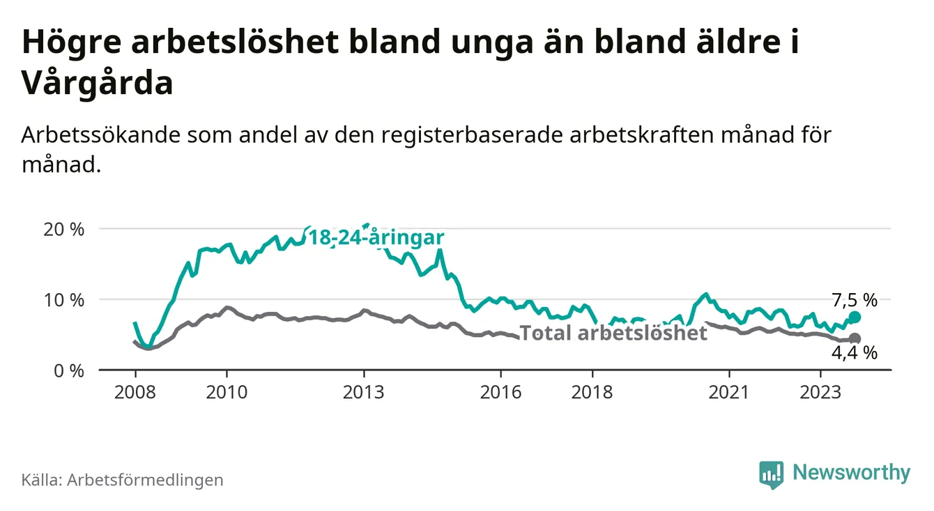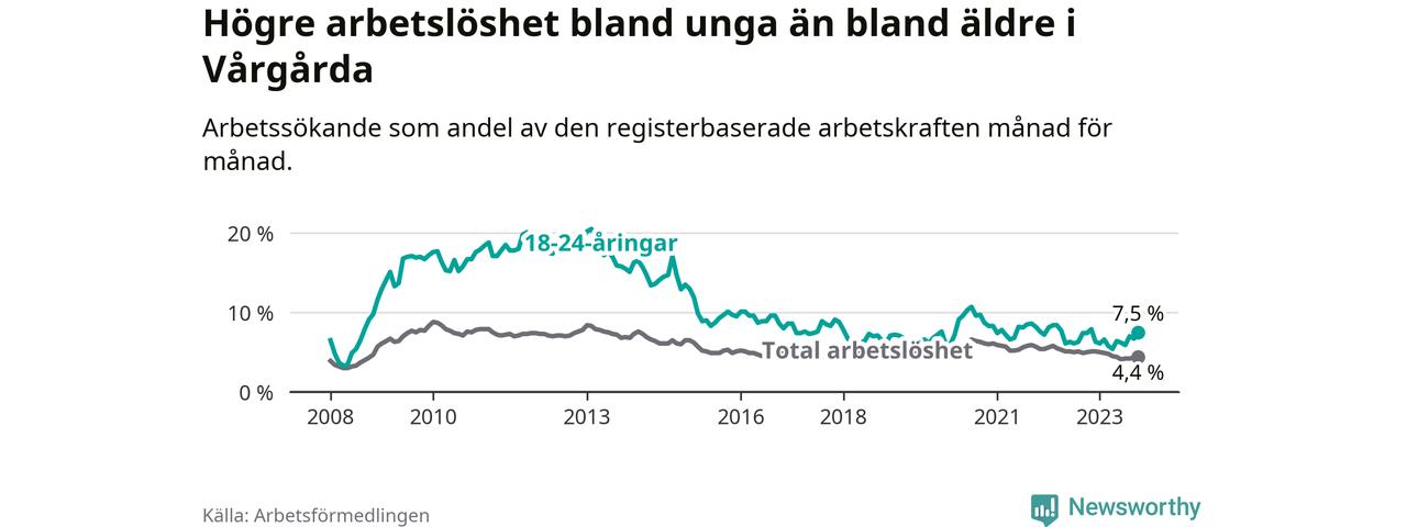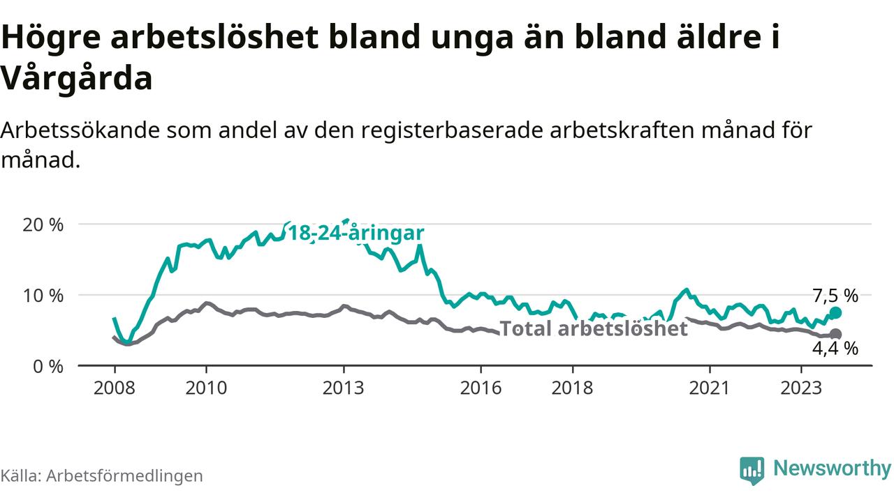Medan Vårgårda har lägre total arbetslöshet än Västra Götaland, ligger ungdomsarbetslösheten 0,7 procentenheter högre i Vårgårda.