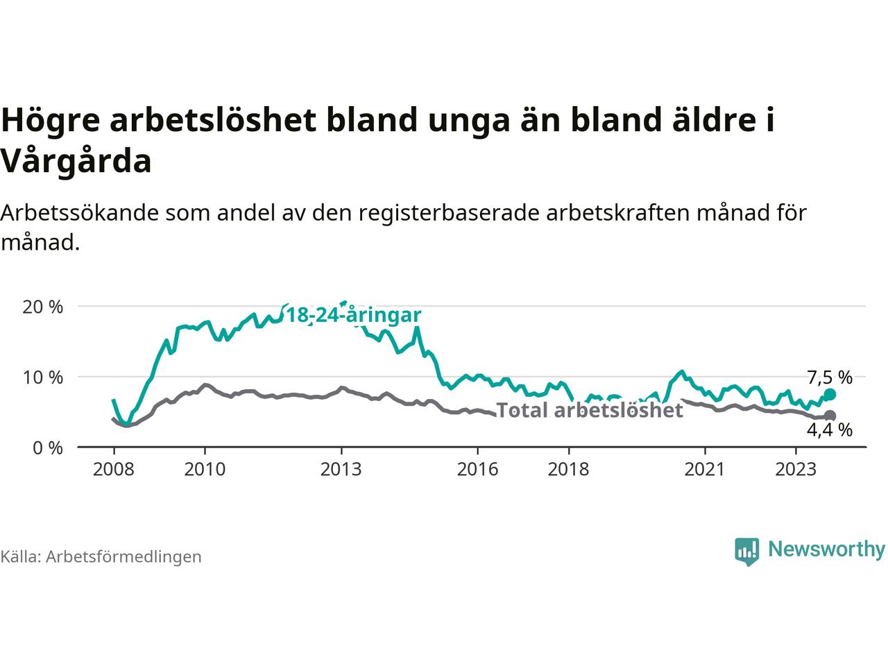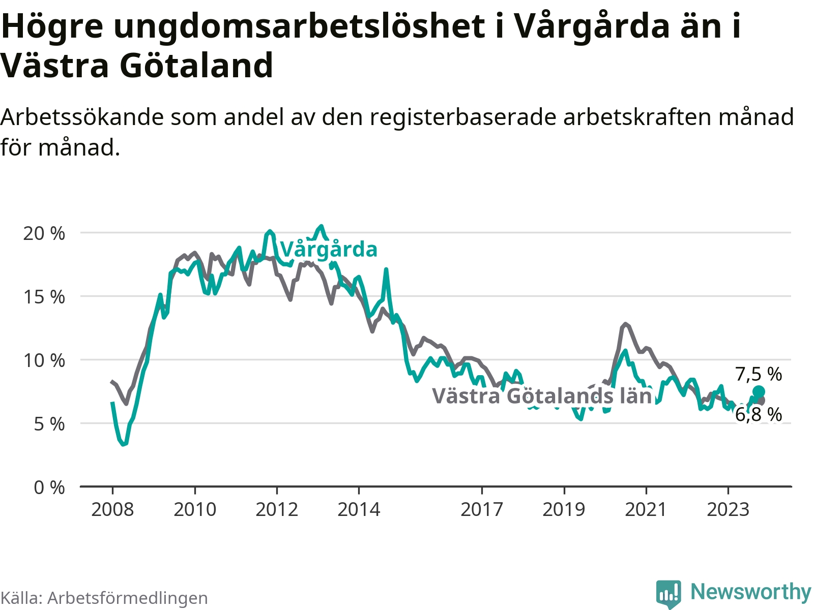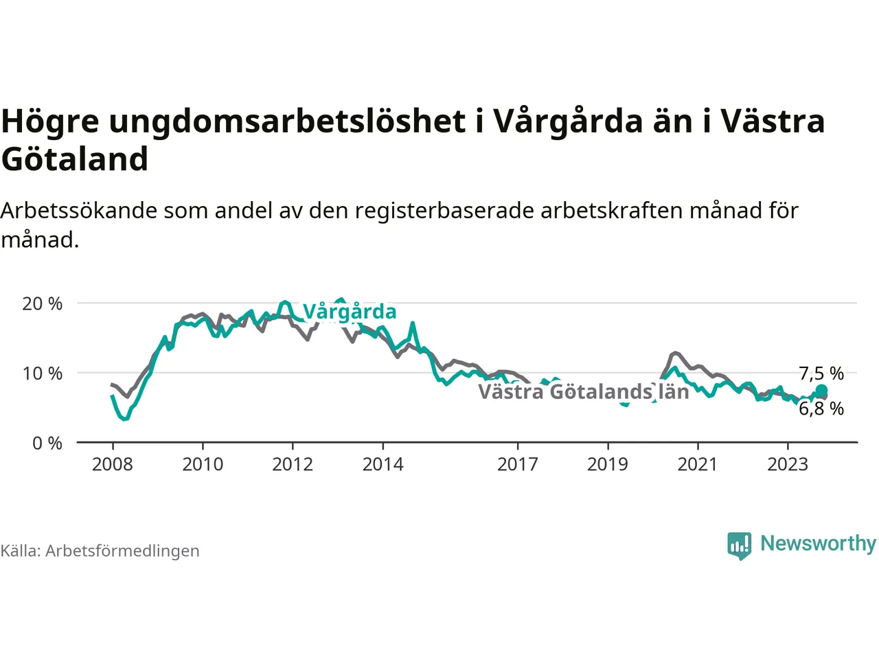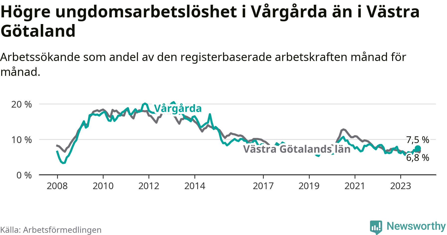 Medan Vårgårda har lägre total arbetslöshet än Västra Götaland, ligger ungdomsarbetslösheten 0,7 procentenheter högre i Vårgårda.