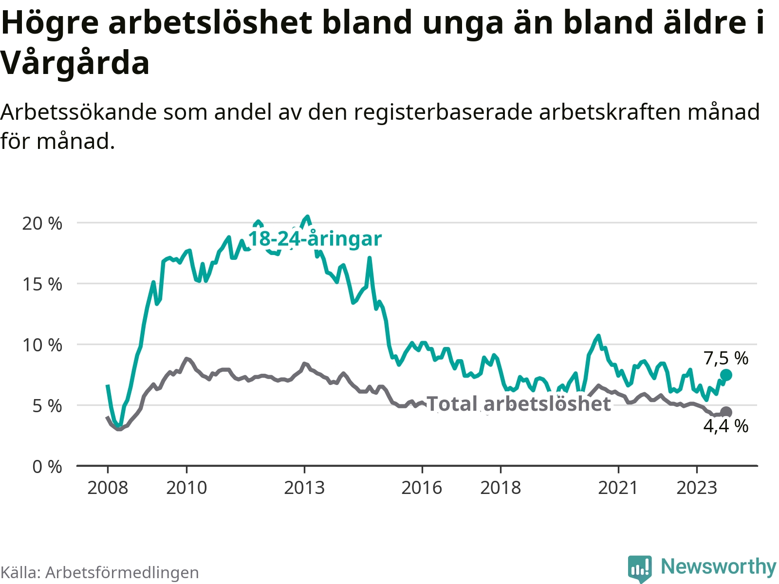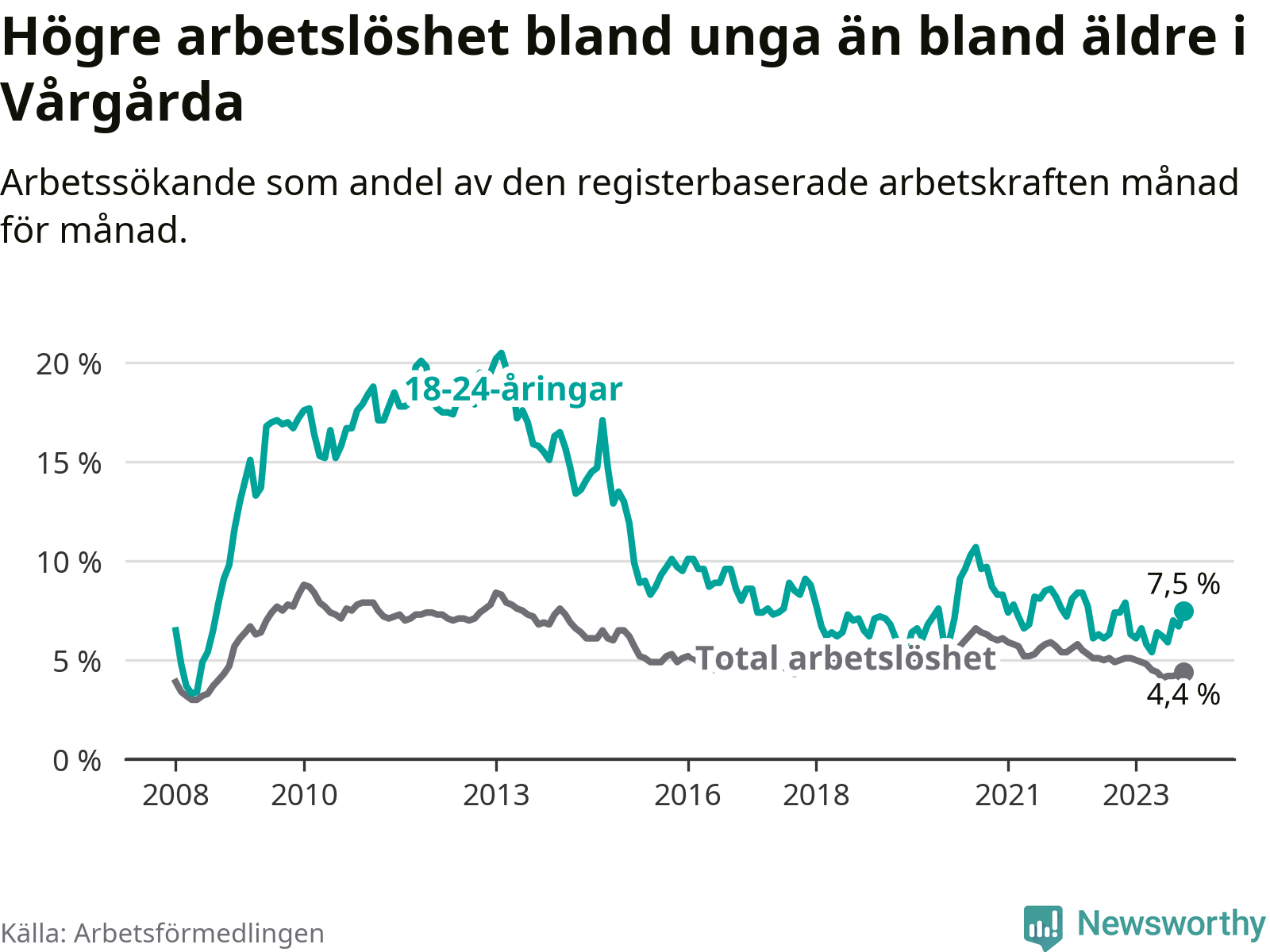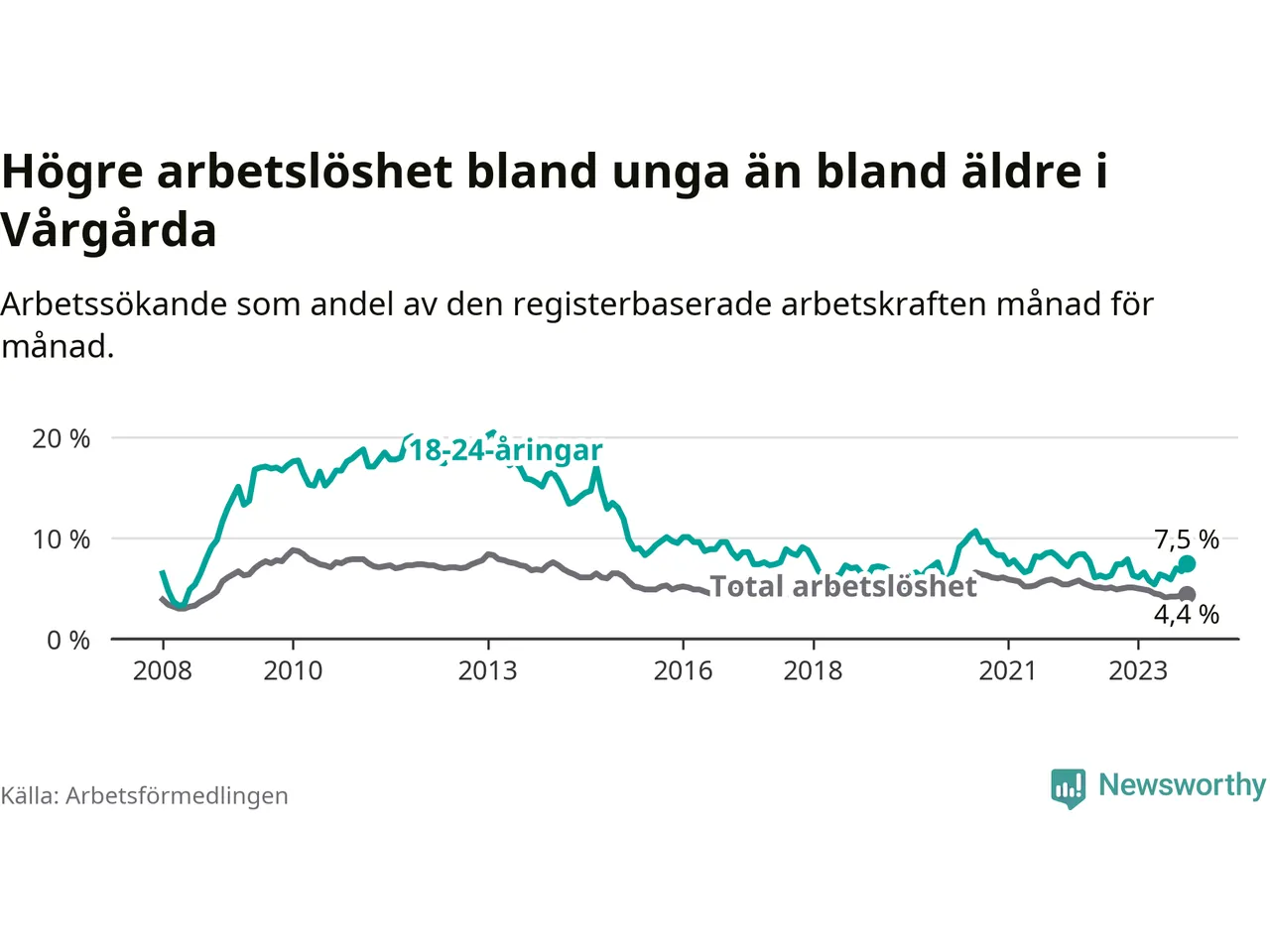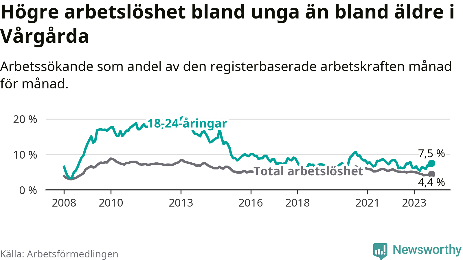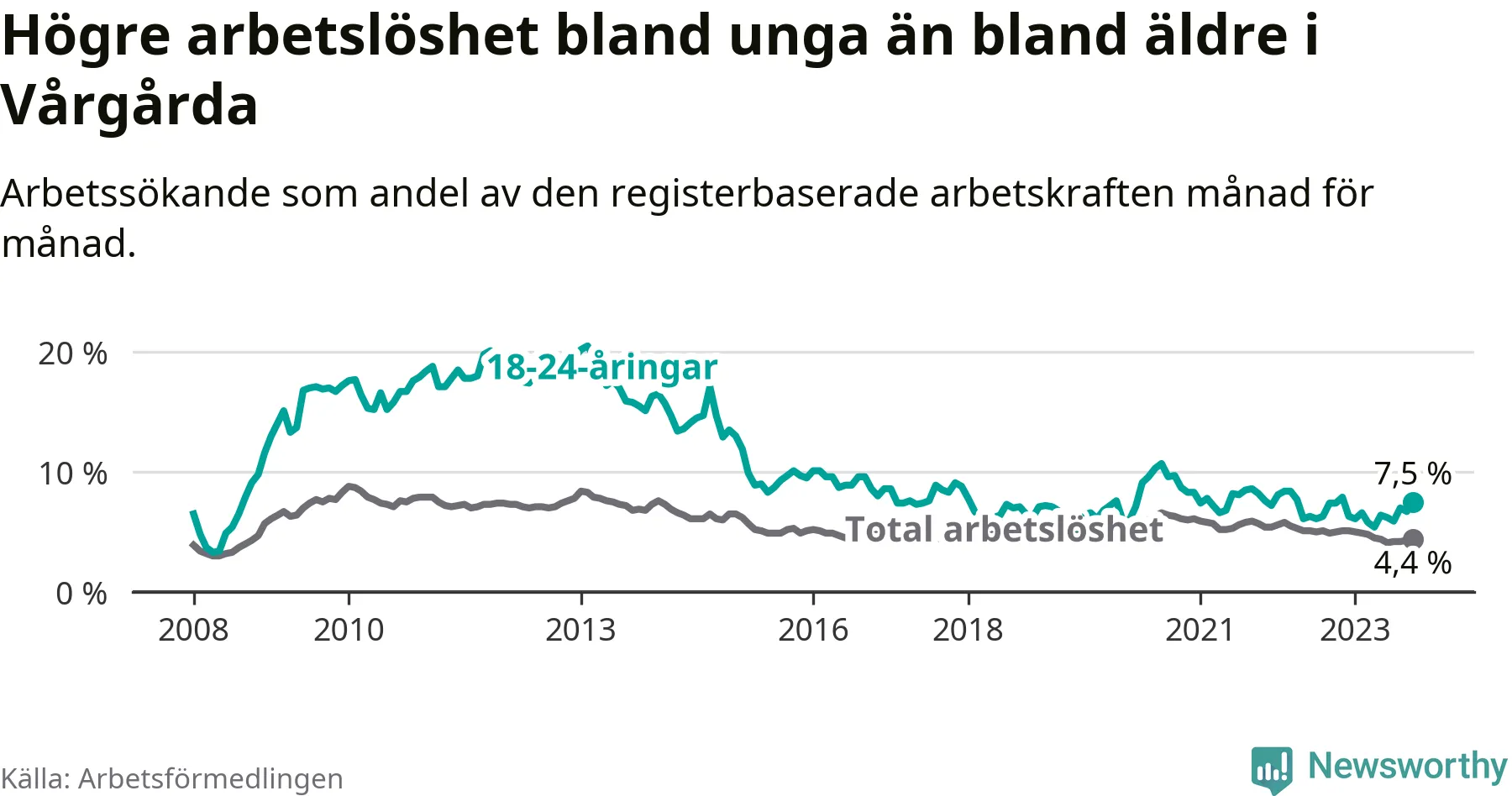 Medan Vårgårda har lägre total arbetslöshet än Västra Götaland, ligger ungdomsarbetslösheten 0,7 procentenheter högre i Vårgårda.