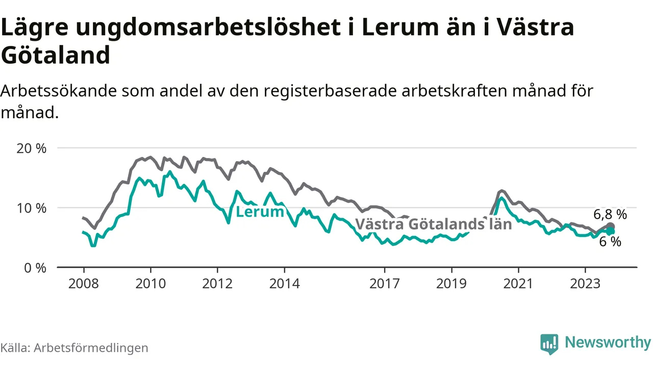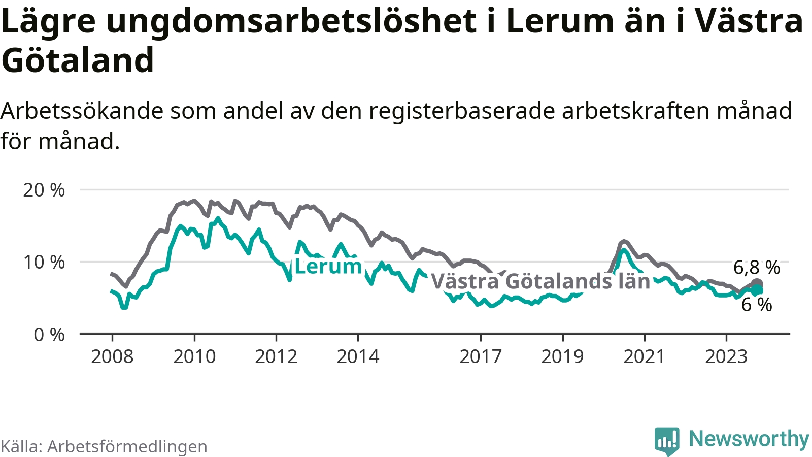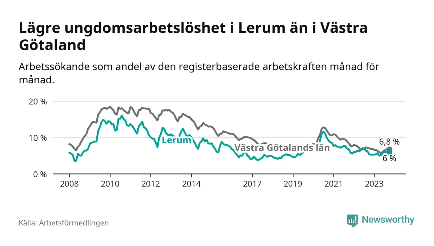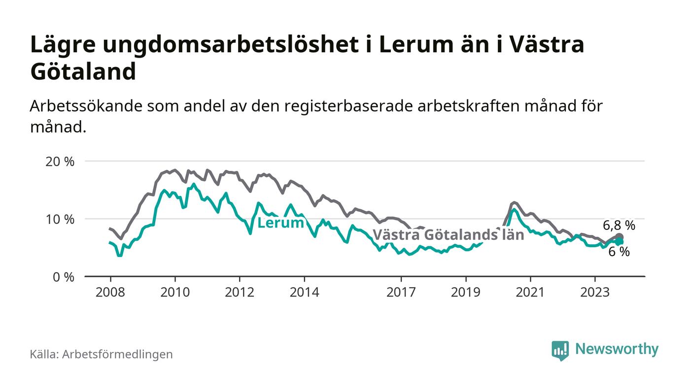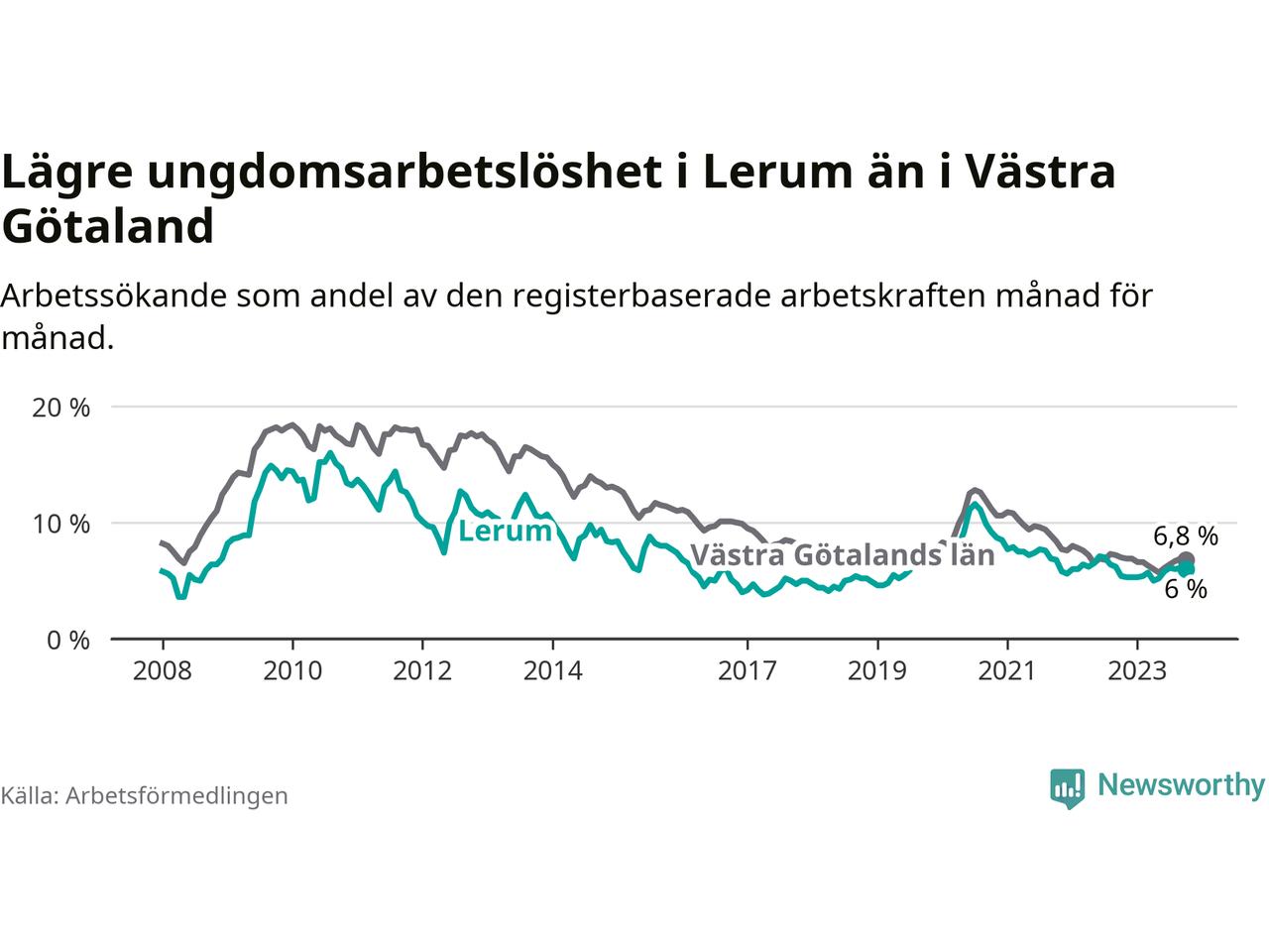 Precis som den totala arbetslösheten ligger ungdomsarbetslösheten i Lerum lägre än i Västra Götaland som helhet. Skillnaden mellan kommunen och länet är 0,8 procentenheter.
