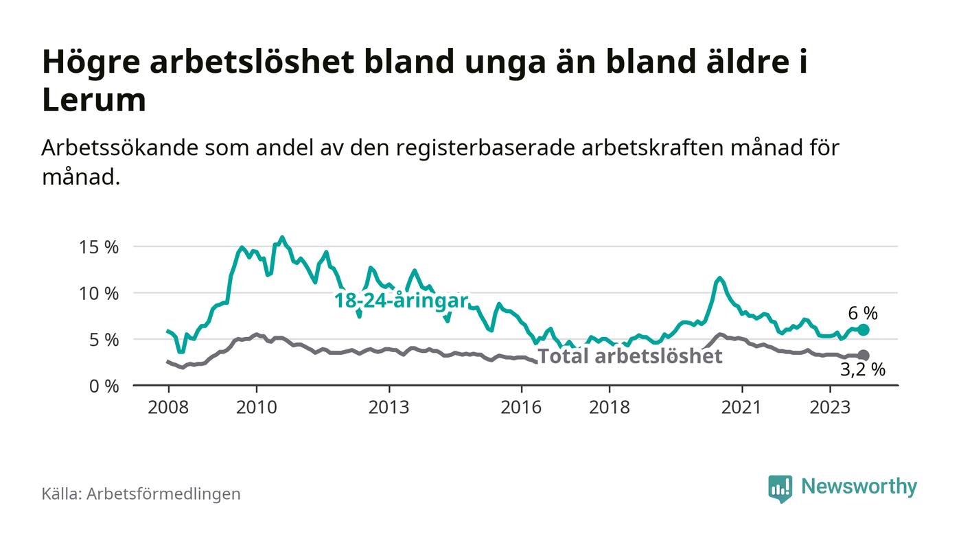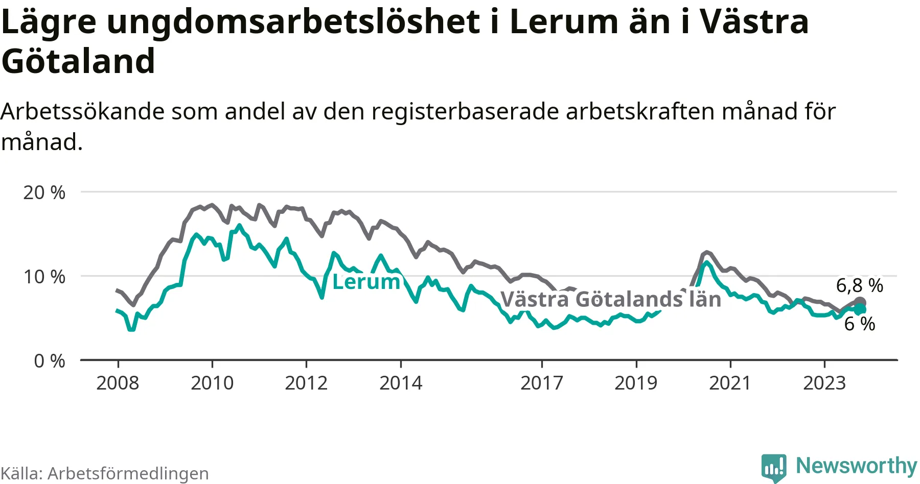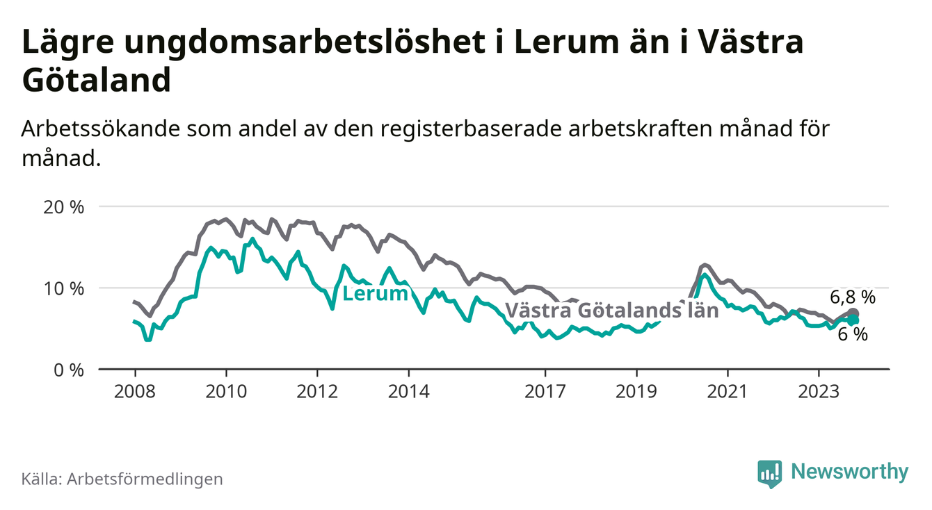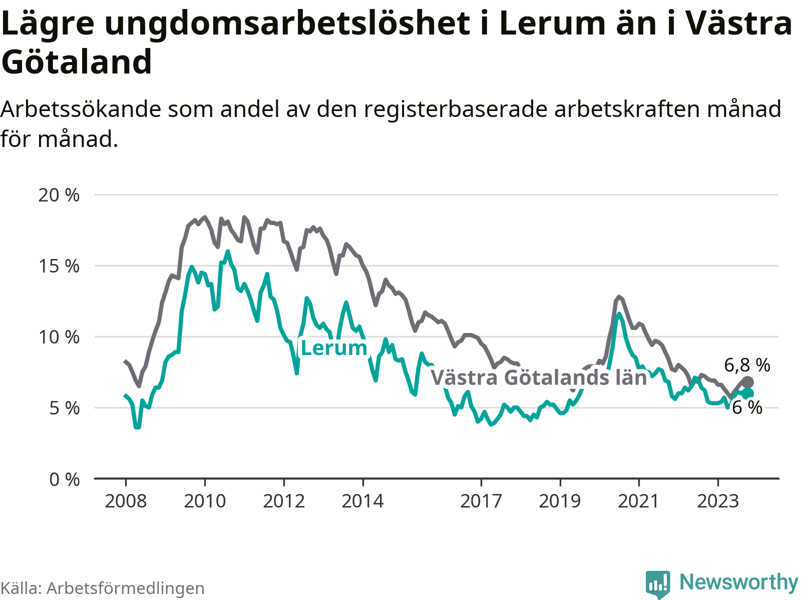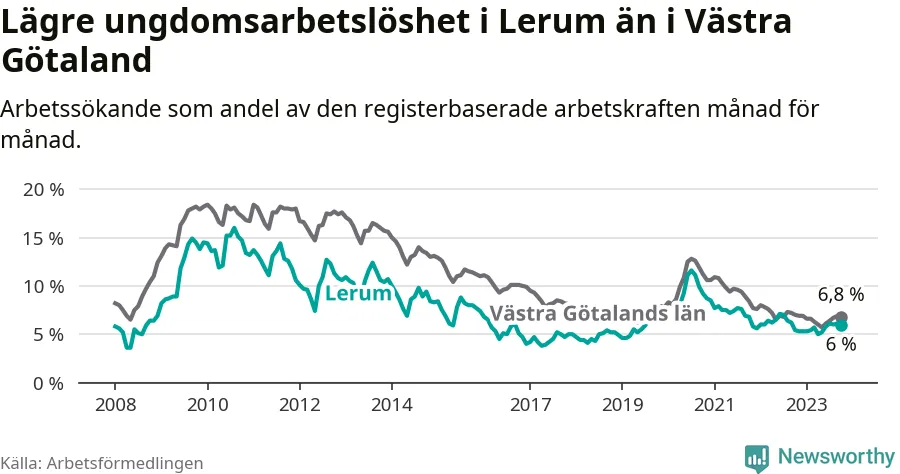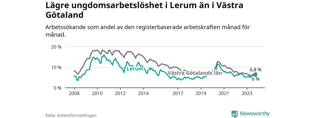 Precis som den totala arbetslösheten ligger ungdomsarbetslösheten i Lerum lägre än i Västra Götaland som helhet. Skillnaden mellan kommunen och länet är 0,8 procentenheter.