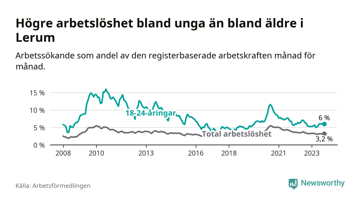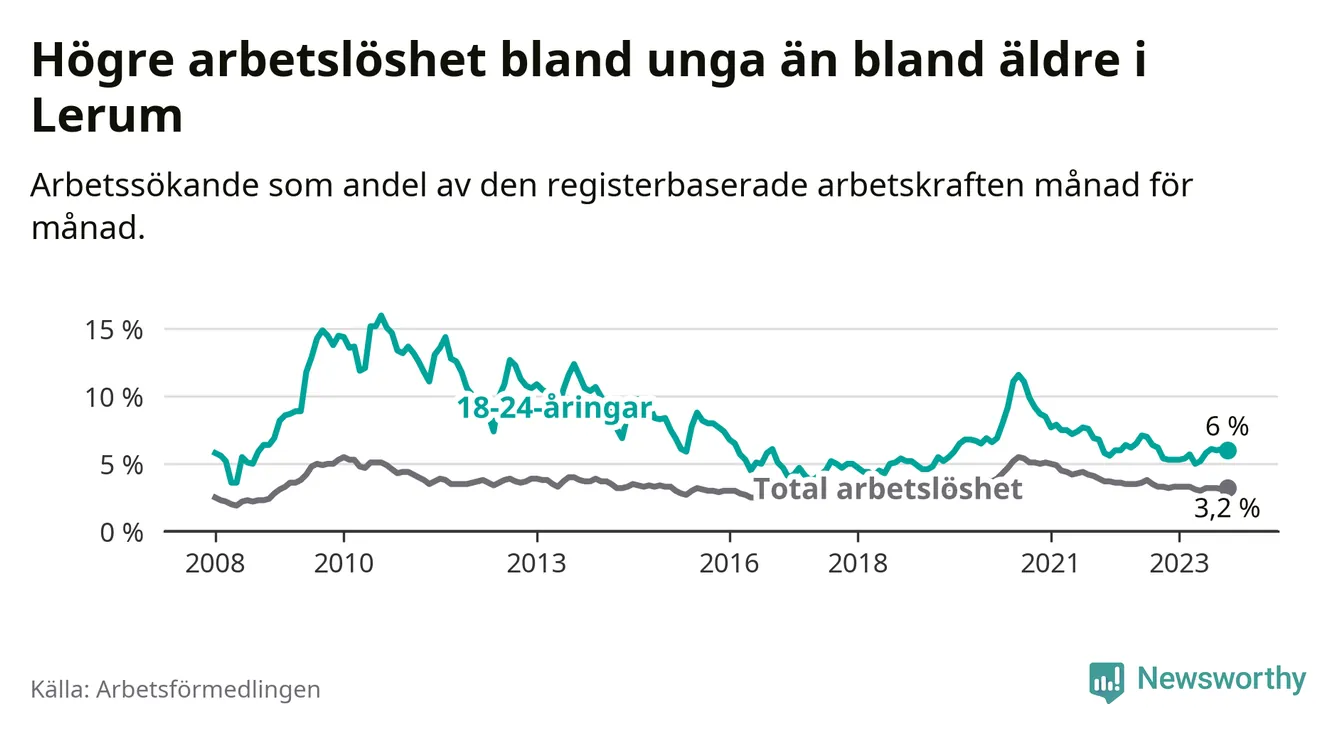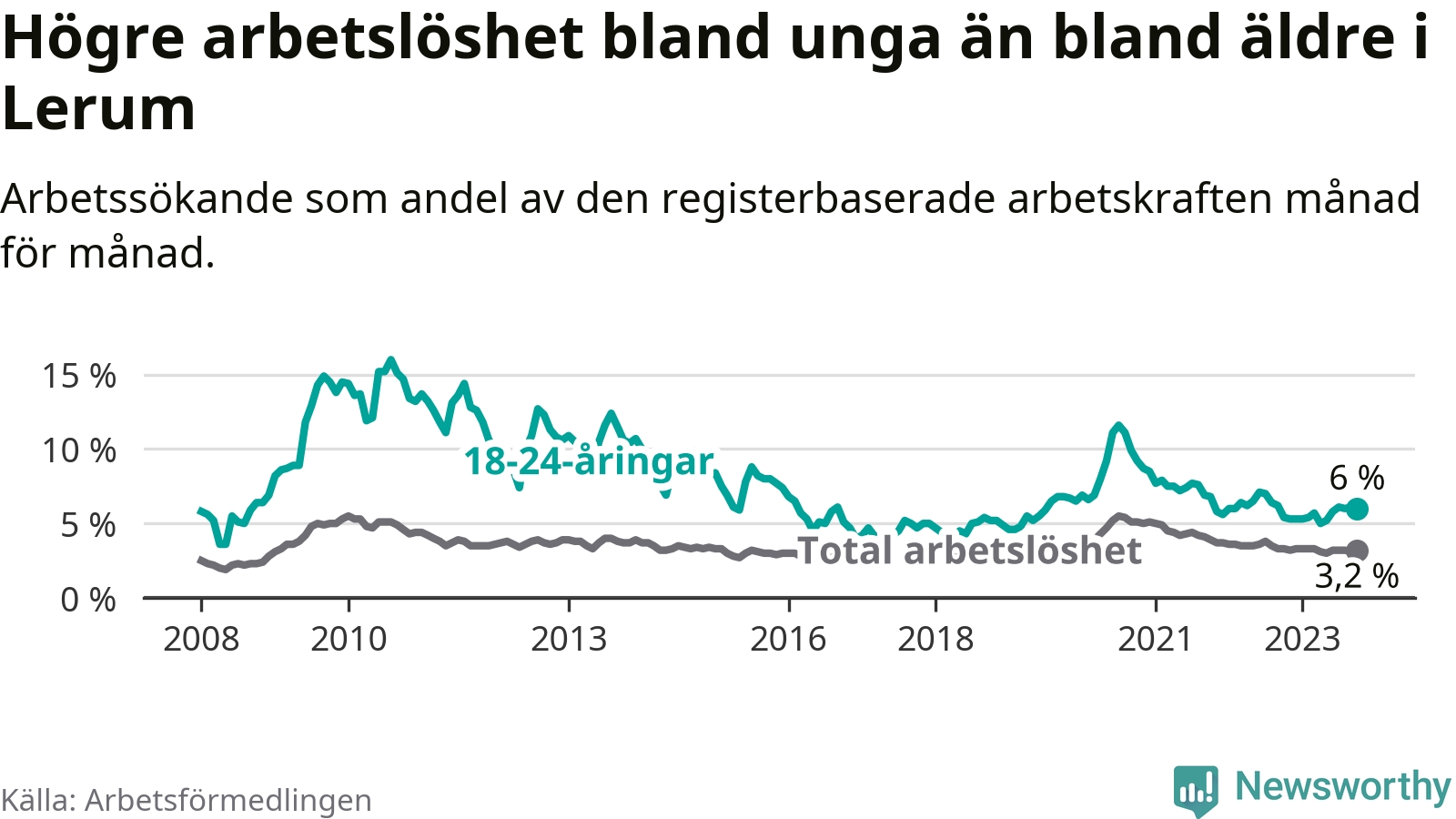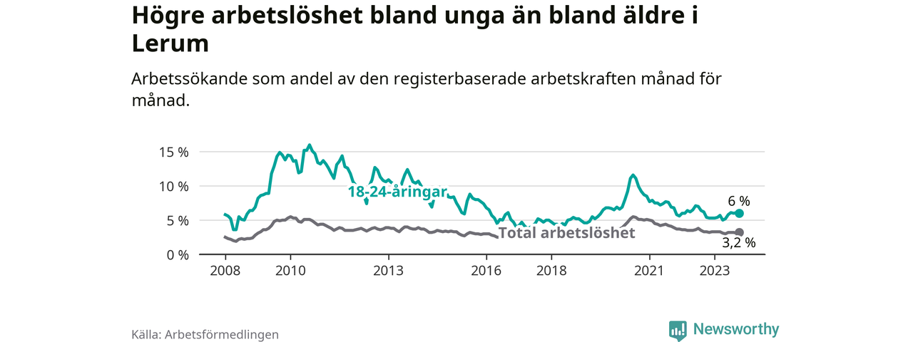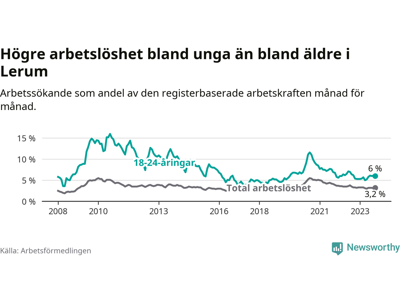 Precis som den totala arbetslösheten ligger ungdomsarbetslösheten i Lerum lägre än i Västra Götaland som helhet. Skillnaden mellan kommunen och länet är 0,8 procentenheter.