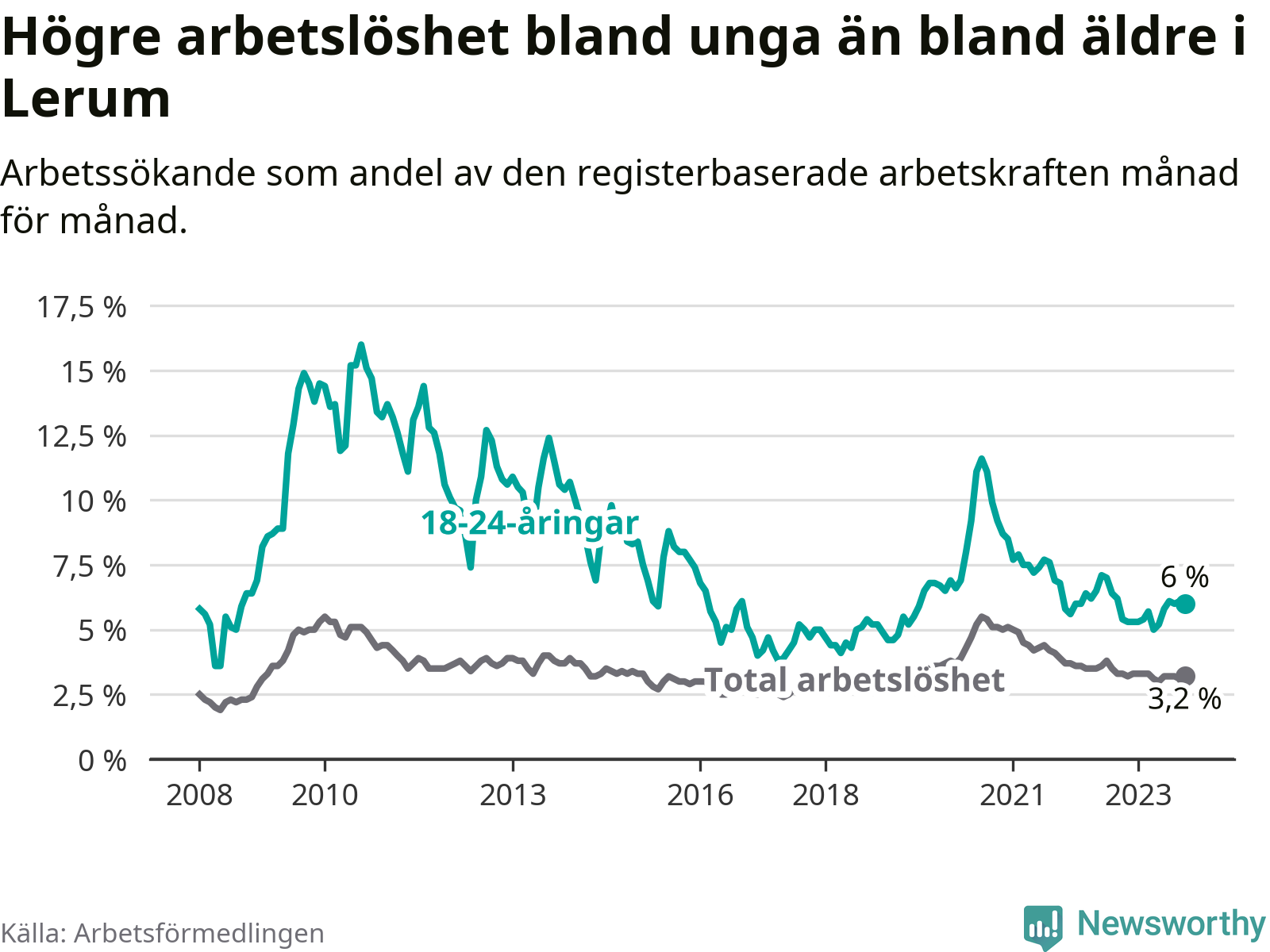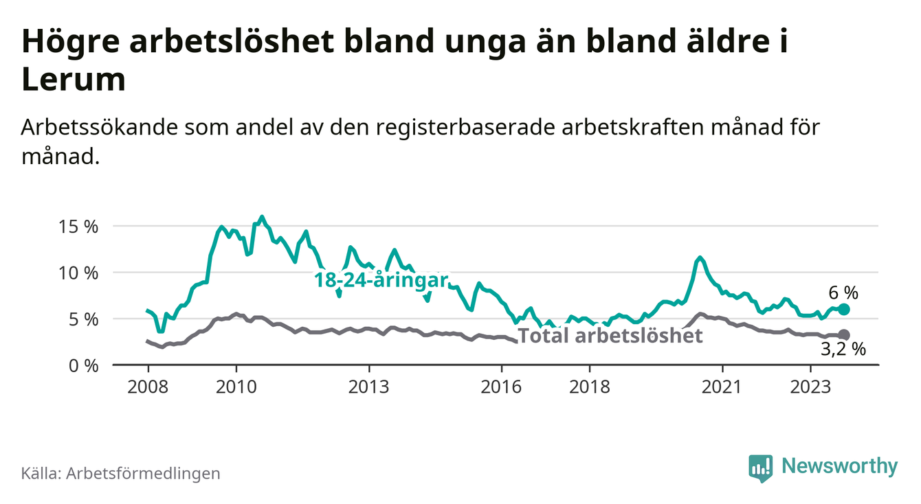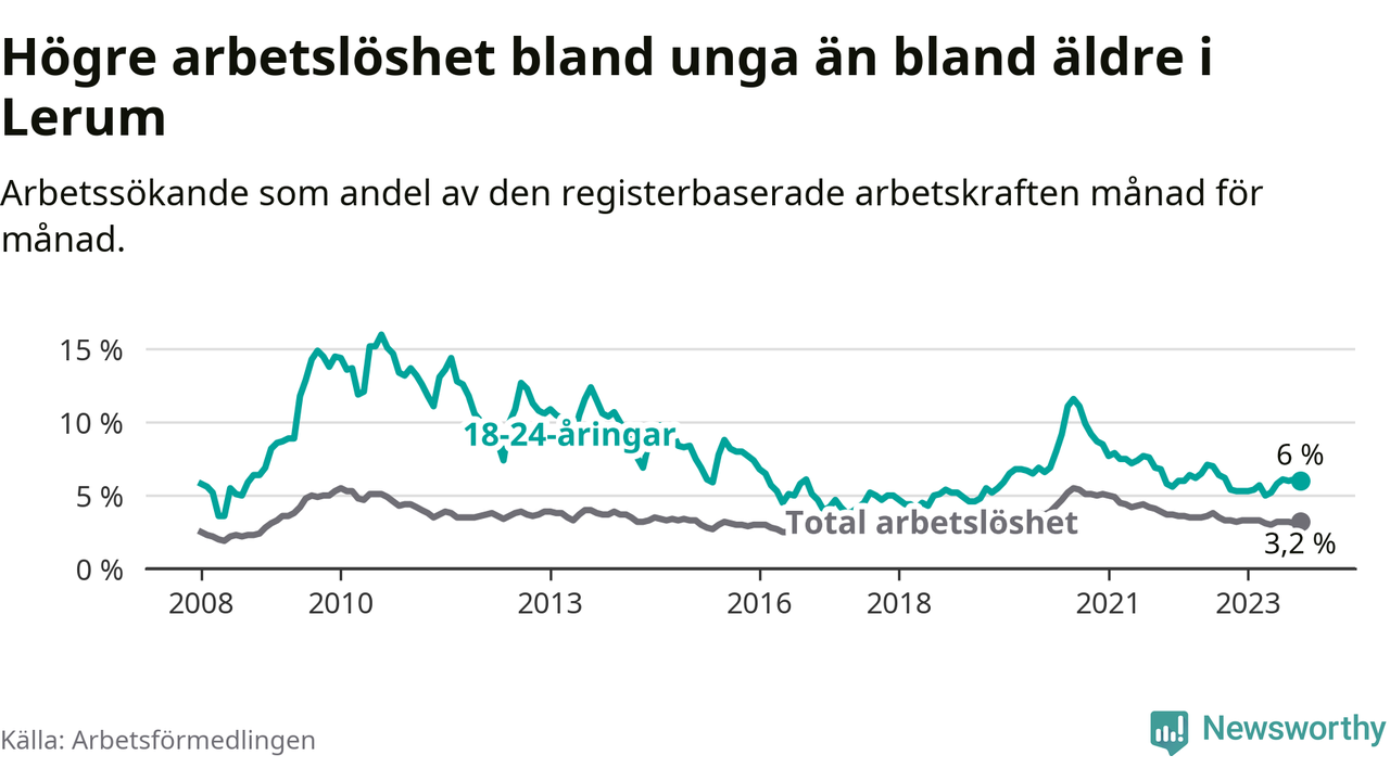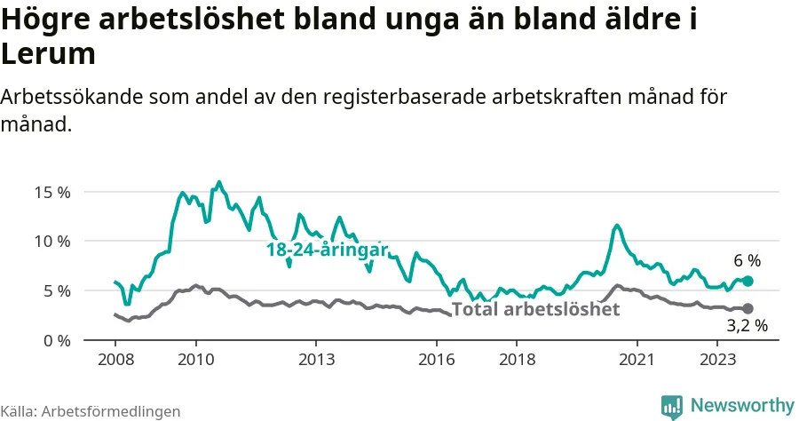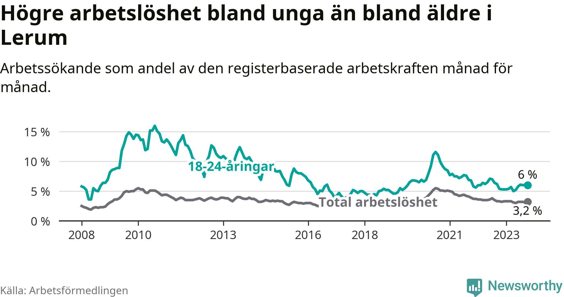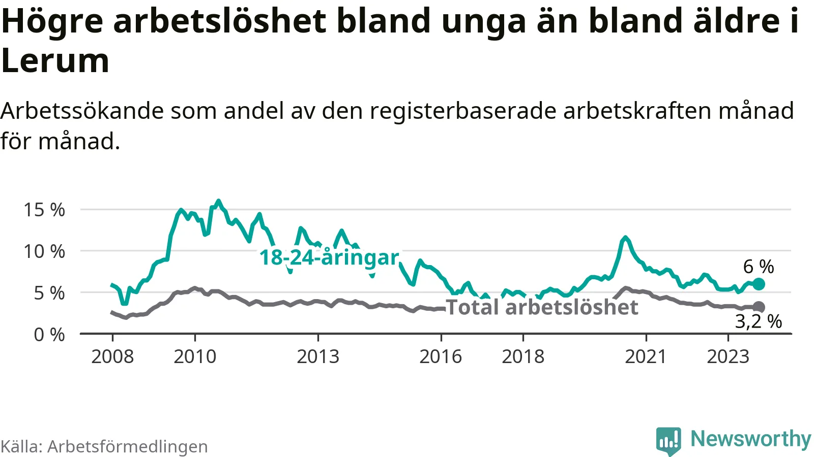 Precis som den totala arbetslösheten ligger ungdomsarbetslösheten i Lerum lägre än i Västra Götaland som helhet. Skillnaden mellan kommunen och länet är 0,8 procentenheter.