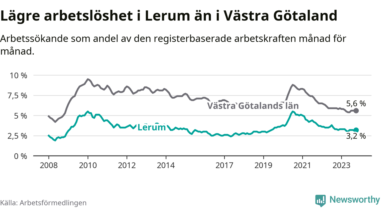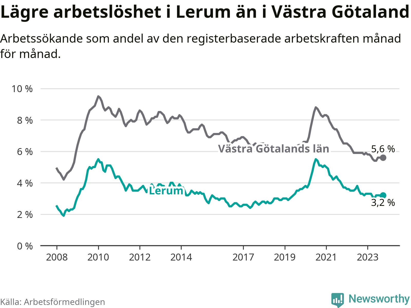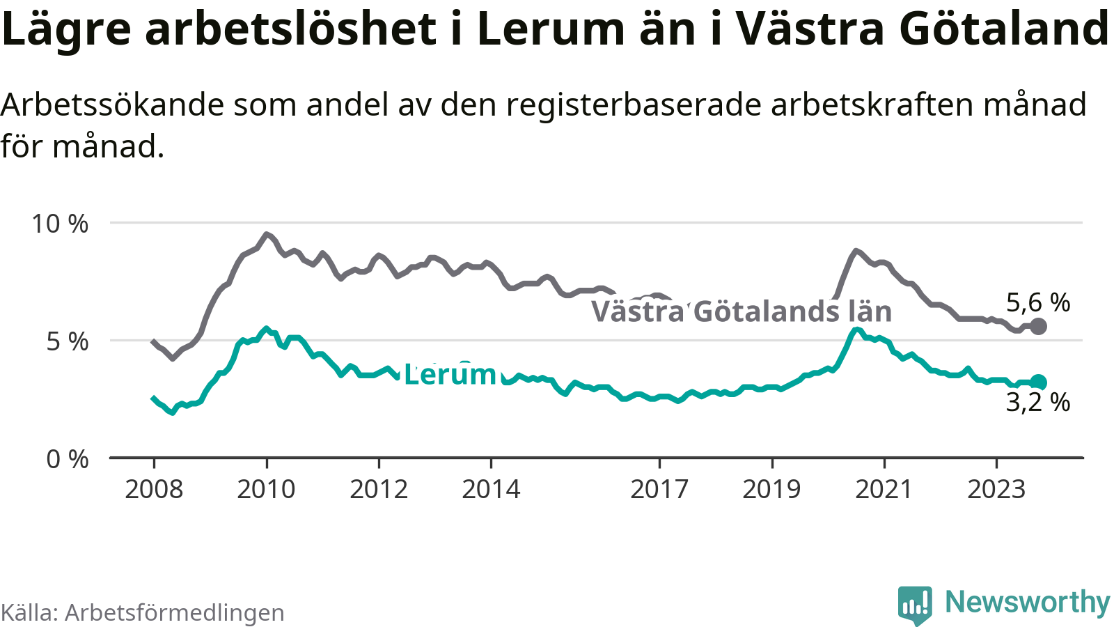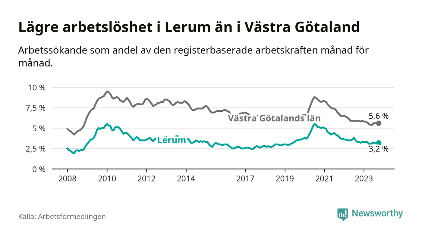 Det är 30:e månaden i följd som arbetslösheten i Lerum är lägre än den var under samma tidpunkt året innan. Sedan april 2021 har arbetslösheten gått ner från 4,4 till 3,2 procent.