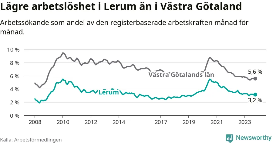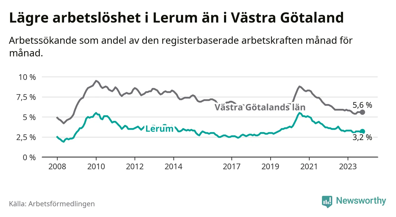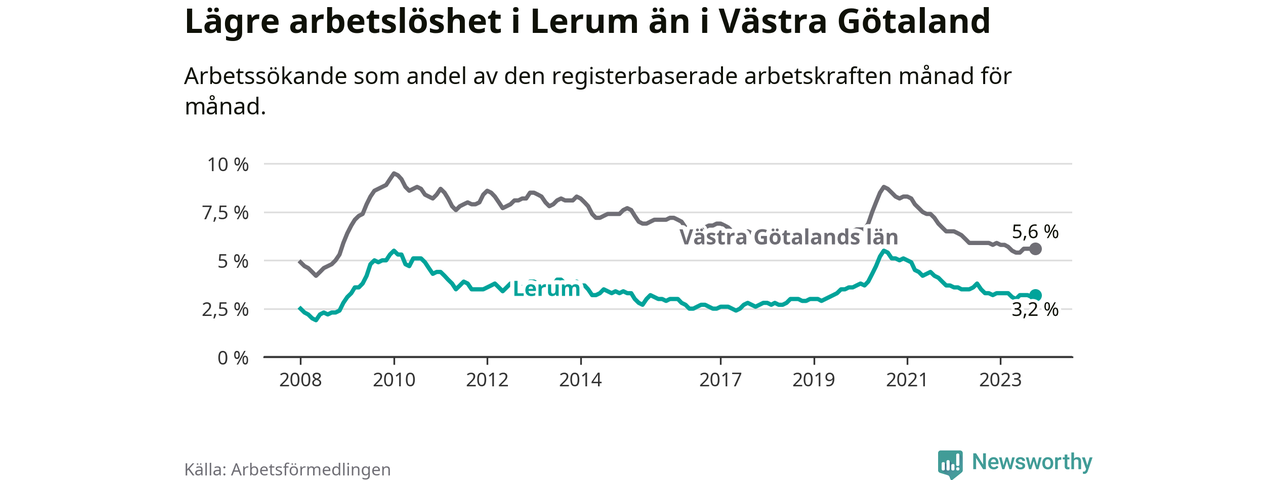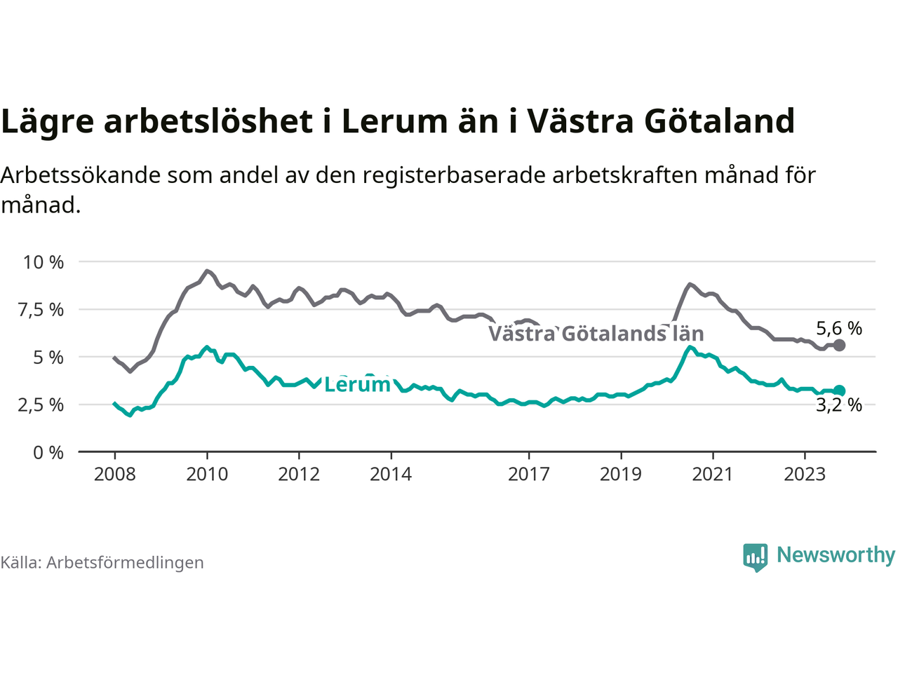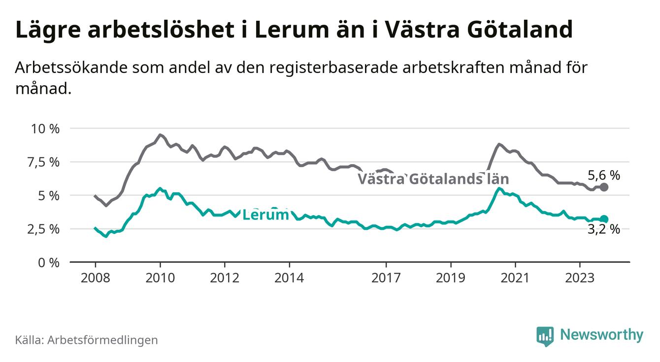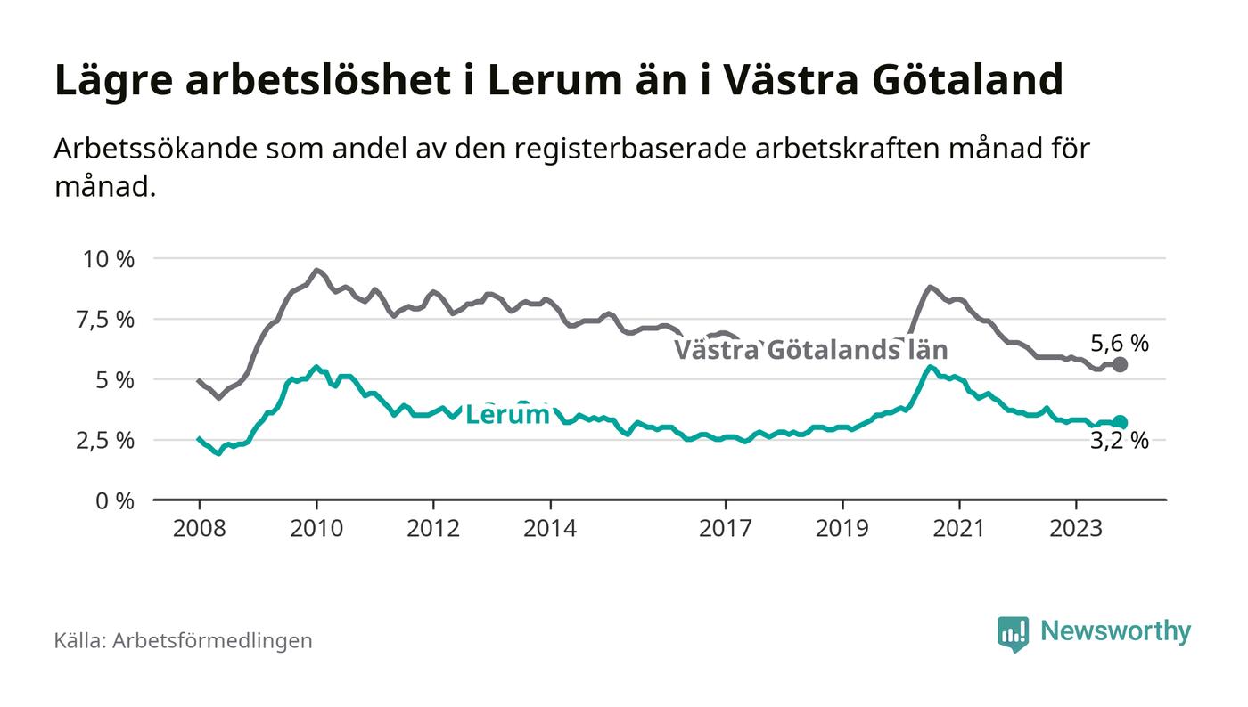 Lerum hade redan tidigare lägre arbetslöshet än snittet i hela Västra Götalands län och nu växer klyftan (3,2 procent i kommunen, jämfört med 5,6 procent i hela länet). Öckerö har den lägsta arbetslösheten i länet (2,4 procent), medan Trollhättan har den högsta (8,4 procent). För att Lerum skulle komma ner i samma arbetslöshetsnivå som Öckerö skulle 175 personer behöva sysselsättas.