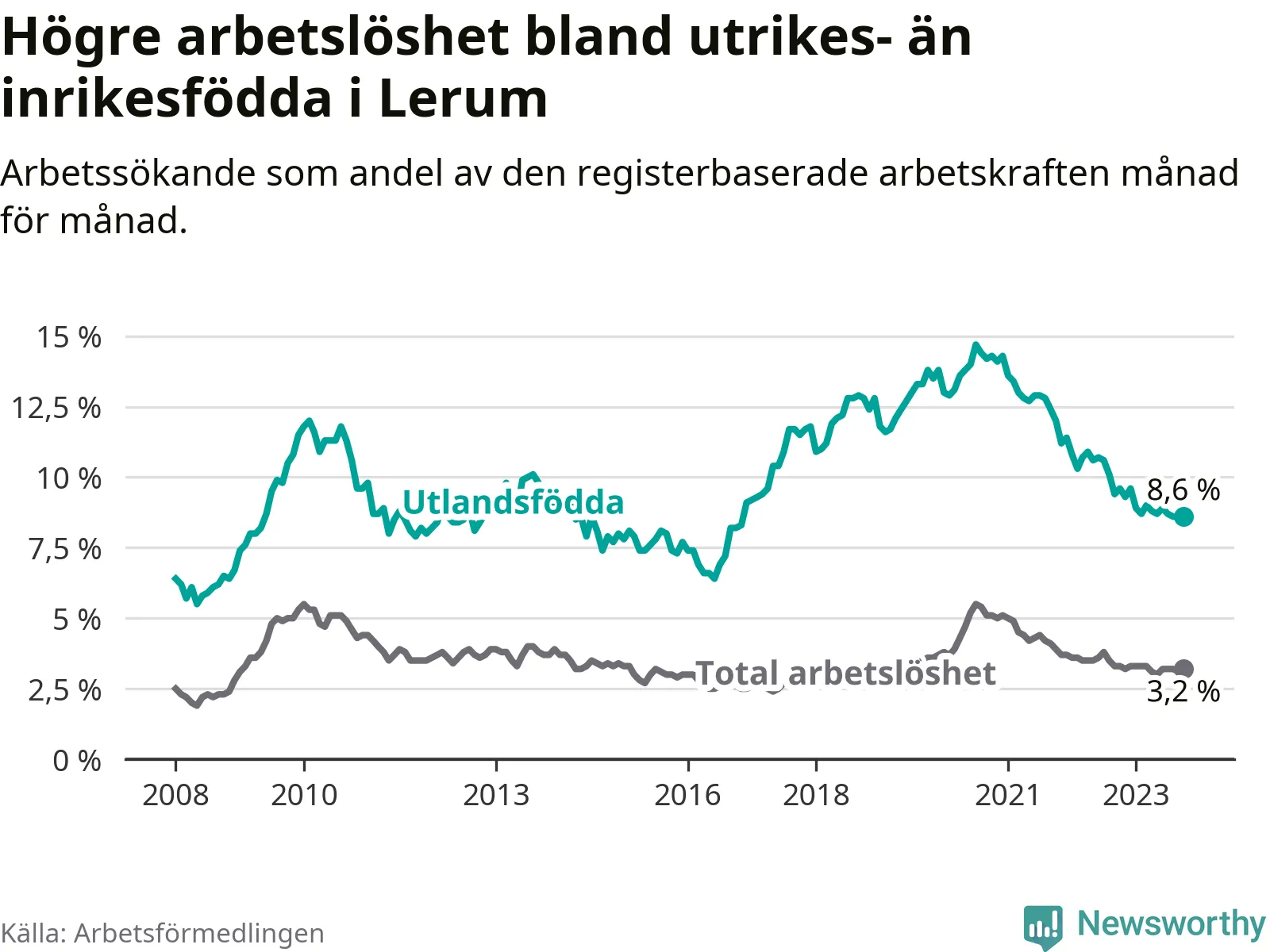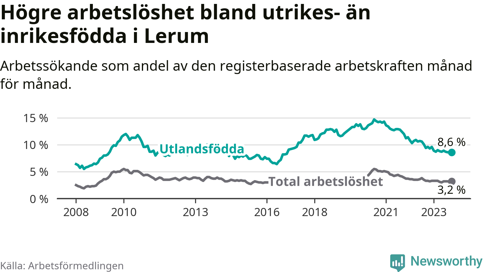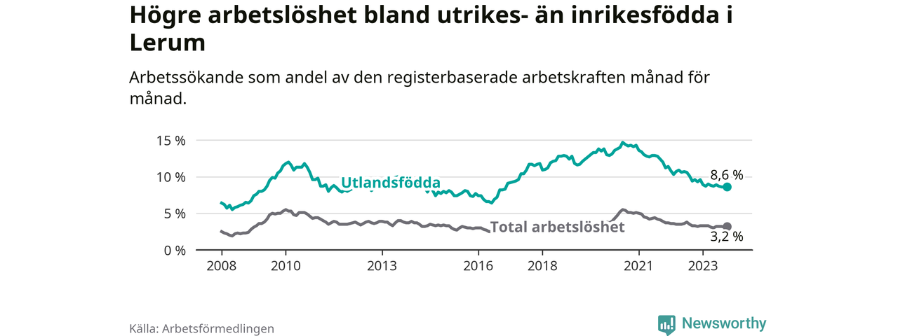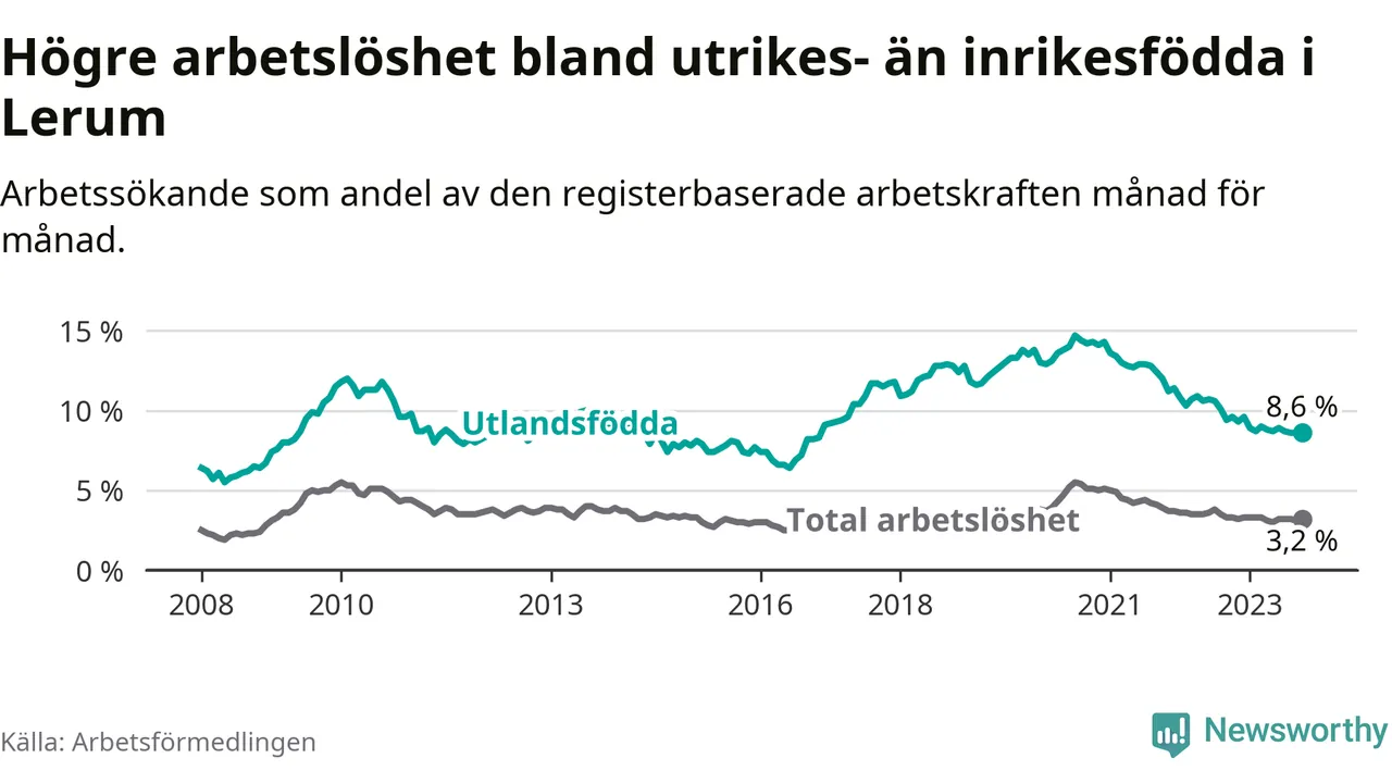 Skillnaden i arbetslöshet mellan utrikesfödda och hela befolkningen är 5,4 procentenheter i Lerum. Det är en mindre skillnad än för ett år sedan (−0,9 procentenheter).