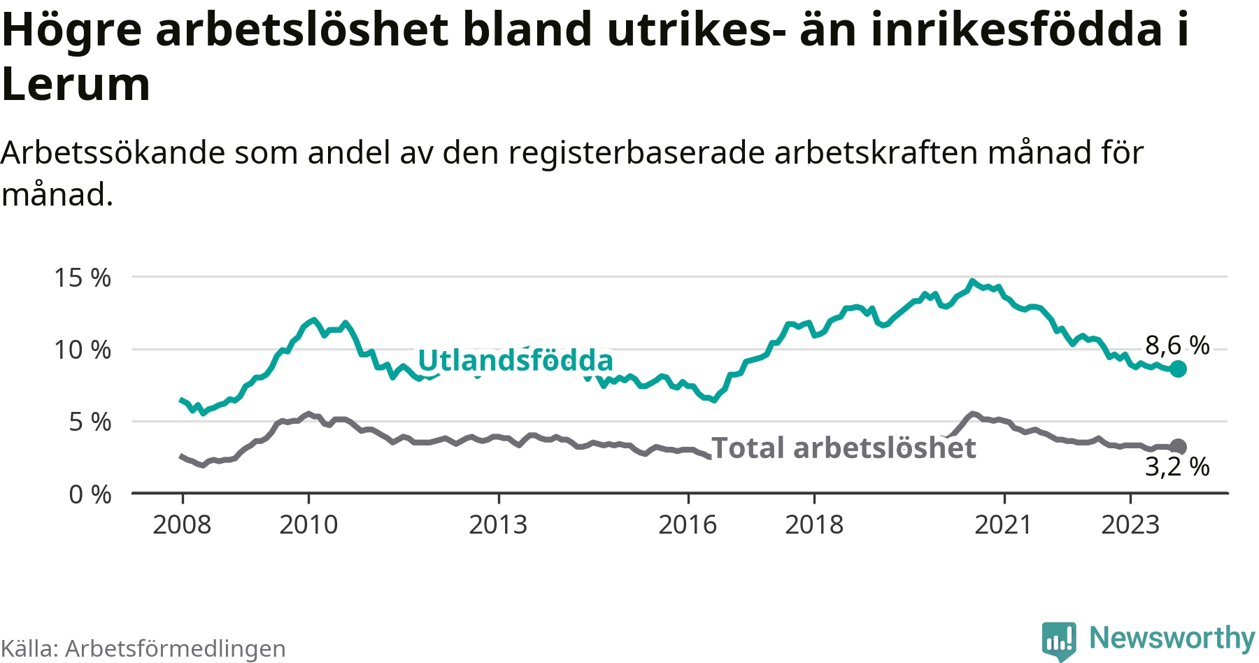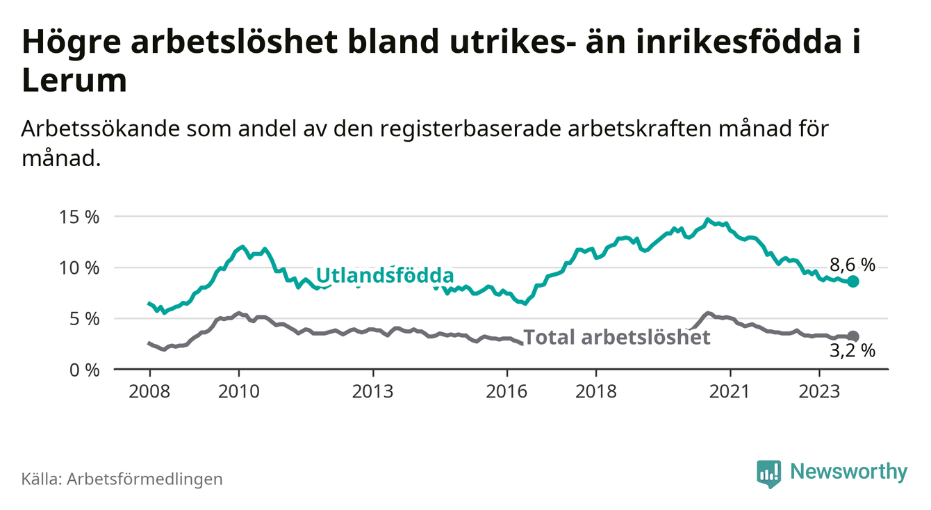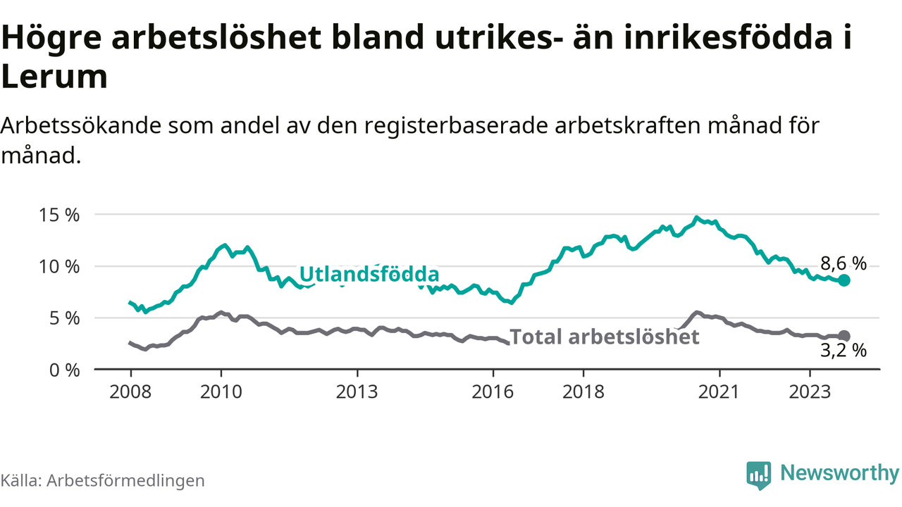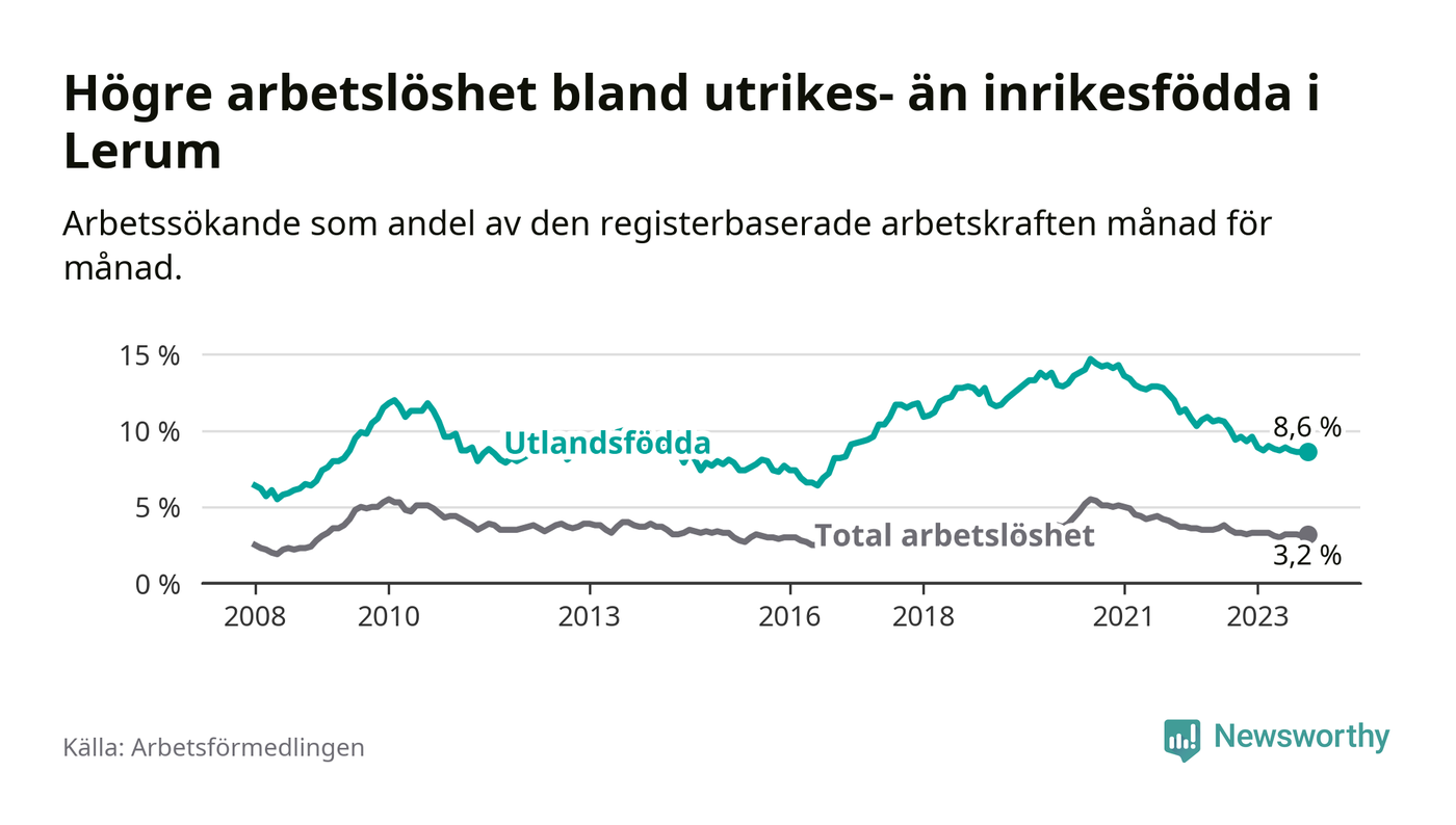 Skillnaden i arbetslöshet mellan utrikesfödda och hela befolkningen är 5,4 procentenheter i Lerum. Det är en mindre skillnad än för ett år sedan (−0,9 procentenheter).