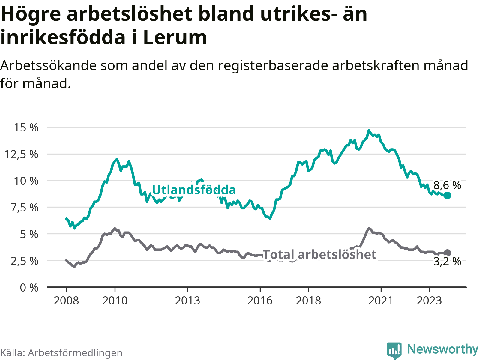 Arbetslösheten bland utlandsfödda var 8,6 procent i Lerum under oktober månad, motsvarande 258 av 3 000 personer. Det är 1,0 procentenheter färre än vid samma tidpunkt i fjol (−12 om man räknar personer). Därmed har de utlandsföddas arbetslöshet varit lägre än vid samma tidpunkt i fjol i över två år i sträck. Sedan februari 2021 har arbetslösheten bland utlandsfödda minskat från 13,4 till 8,6 procent.